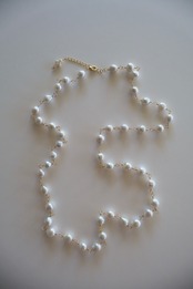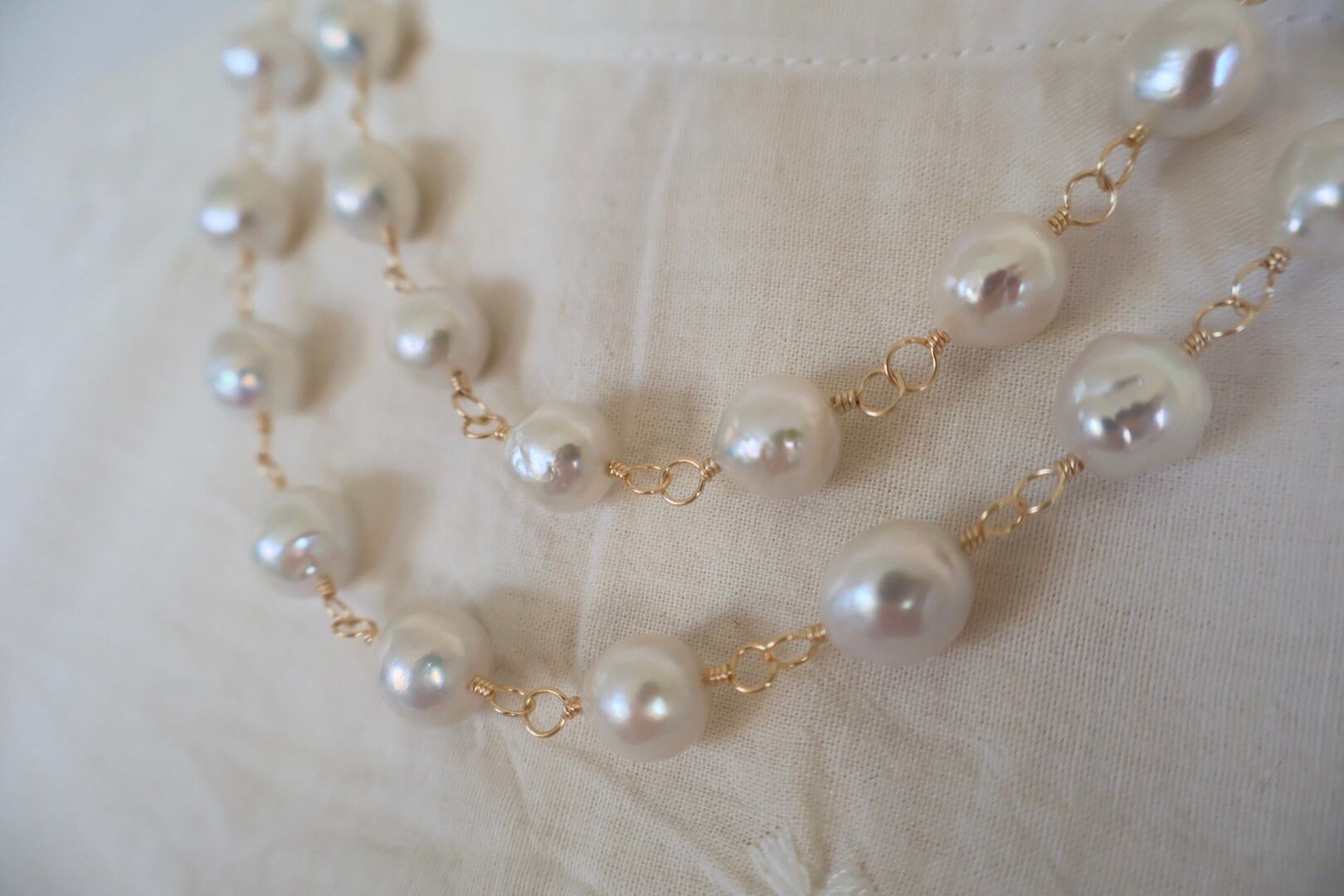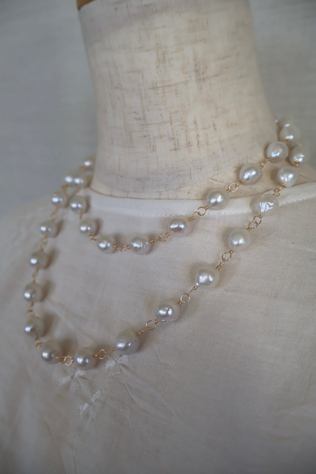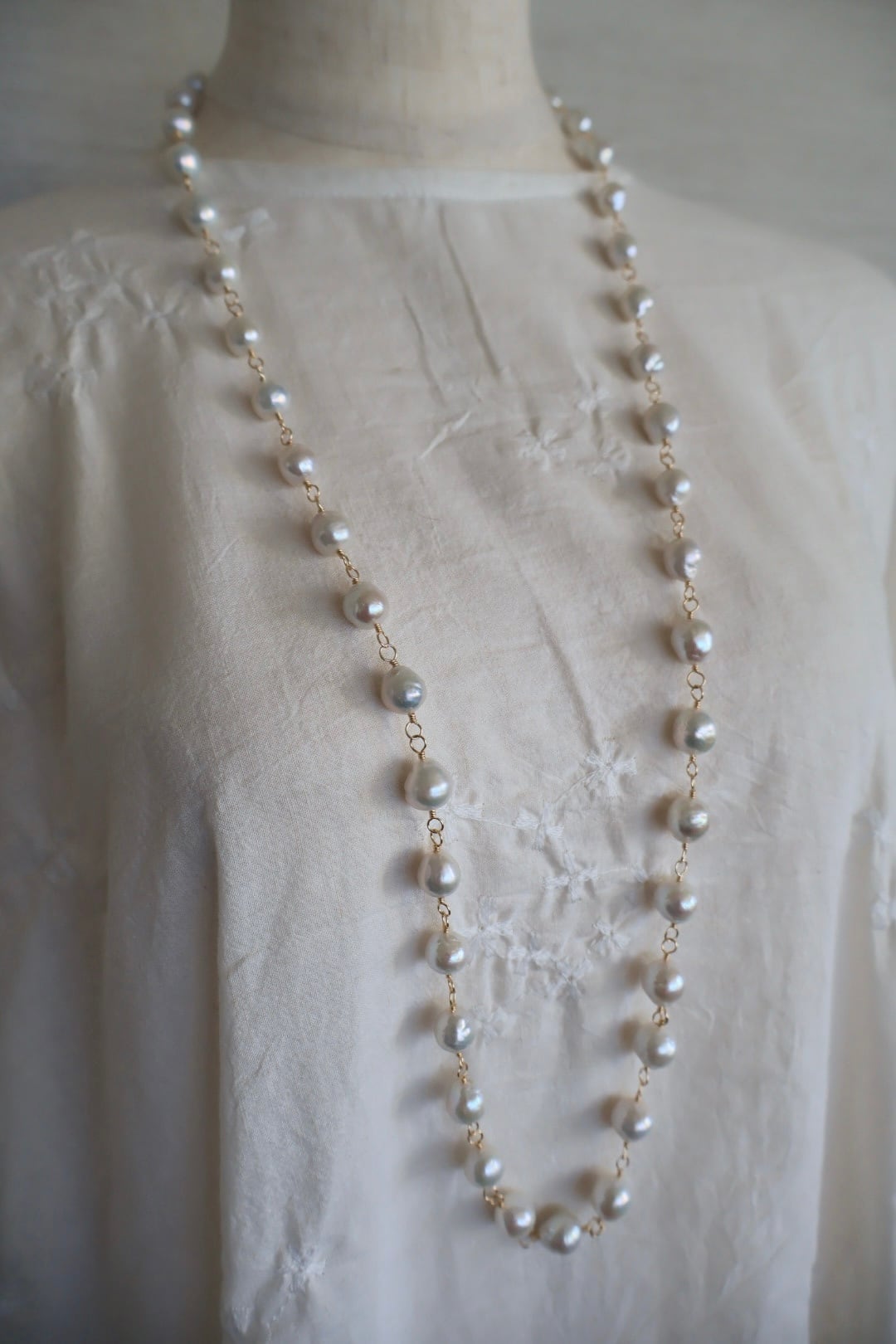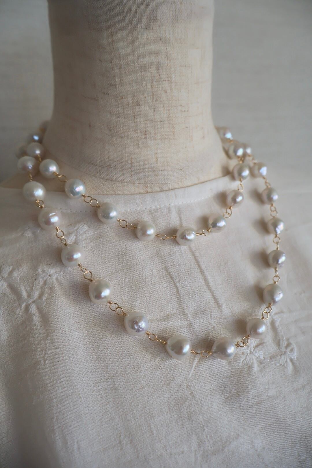 天然の魅力いっぱいの大粒のラウンドパールを、ゴールド色のワイヤーでつないで作ったロングネックレスです。(技法:メガネどめ)