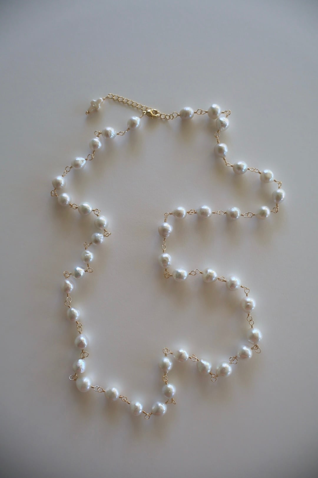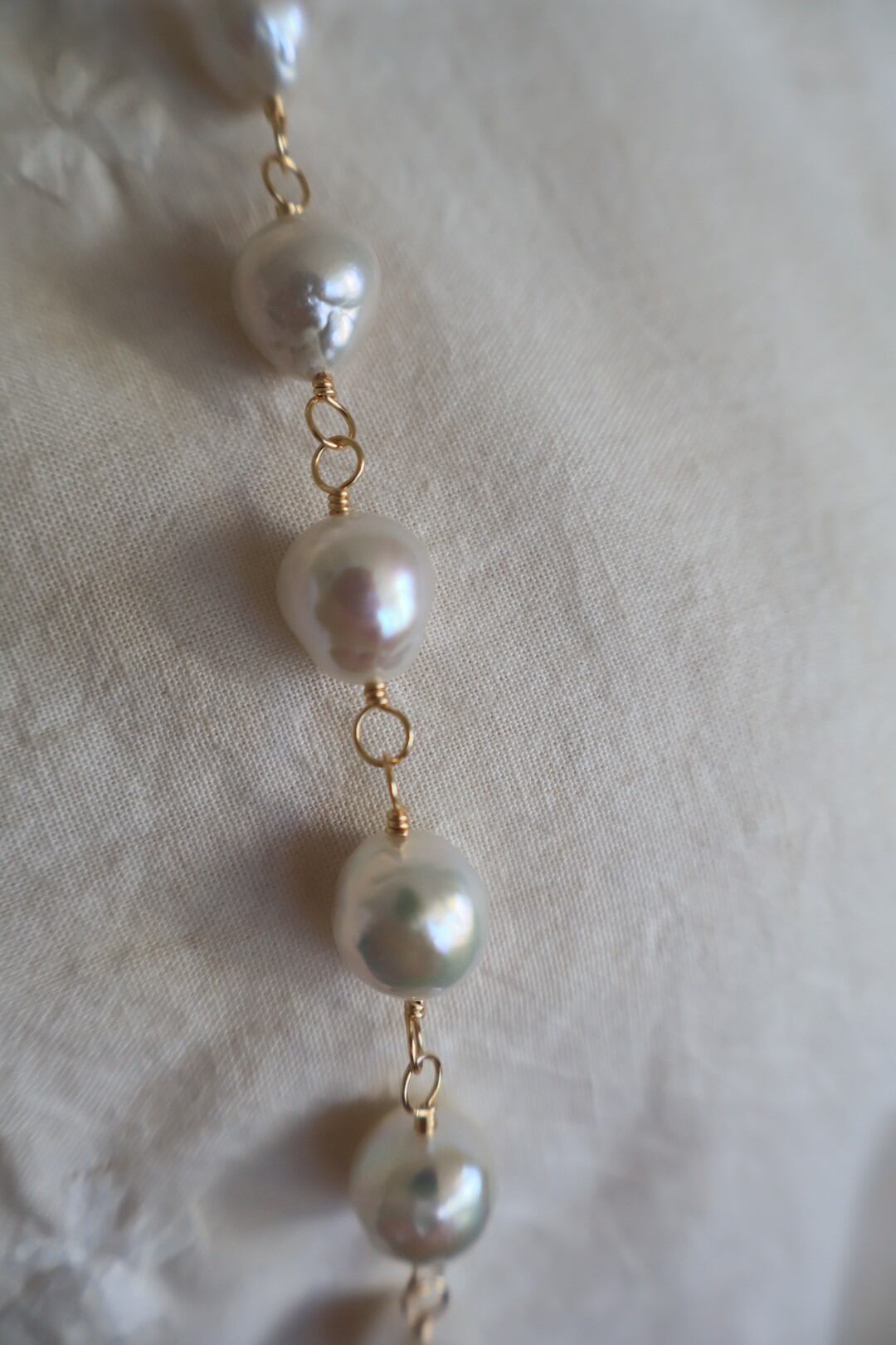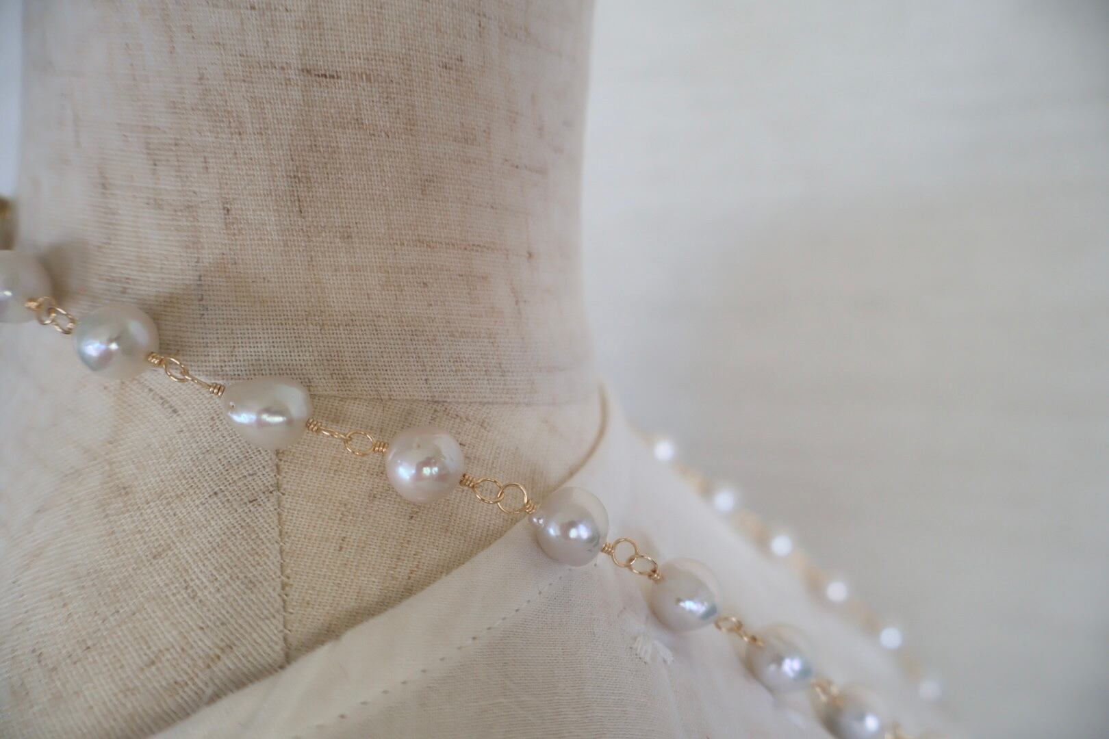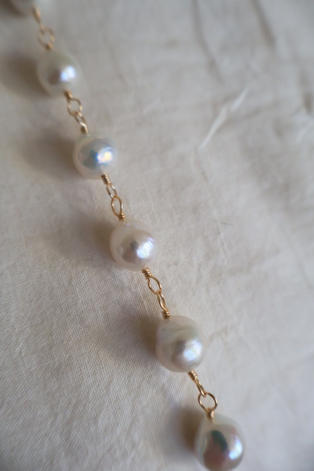 天然の魅力いっぱいの大粒のラウンドパールを、ゴールド色のワイヤーでつないで作ったロングネックレスです。(技法:メガネどめ)