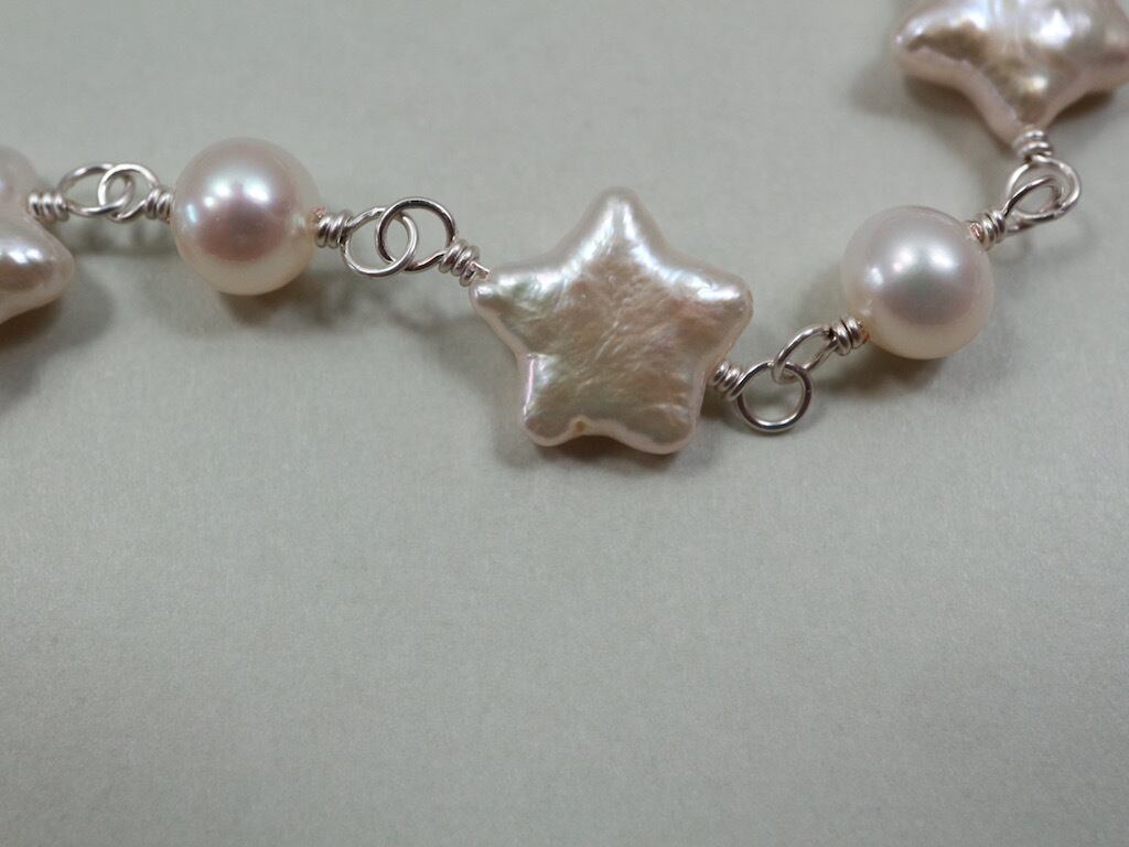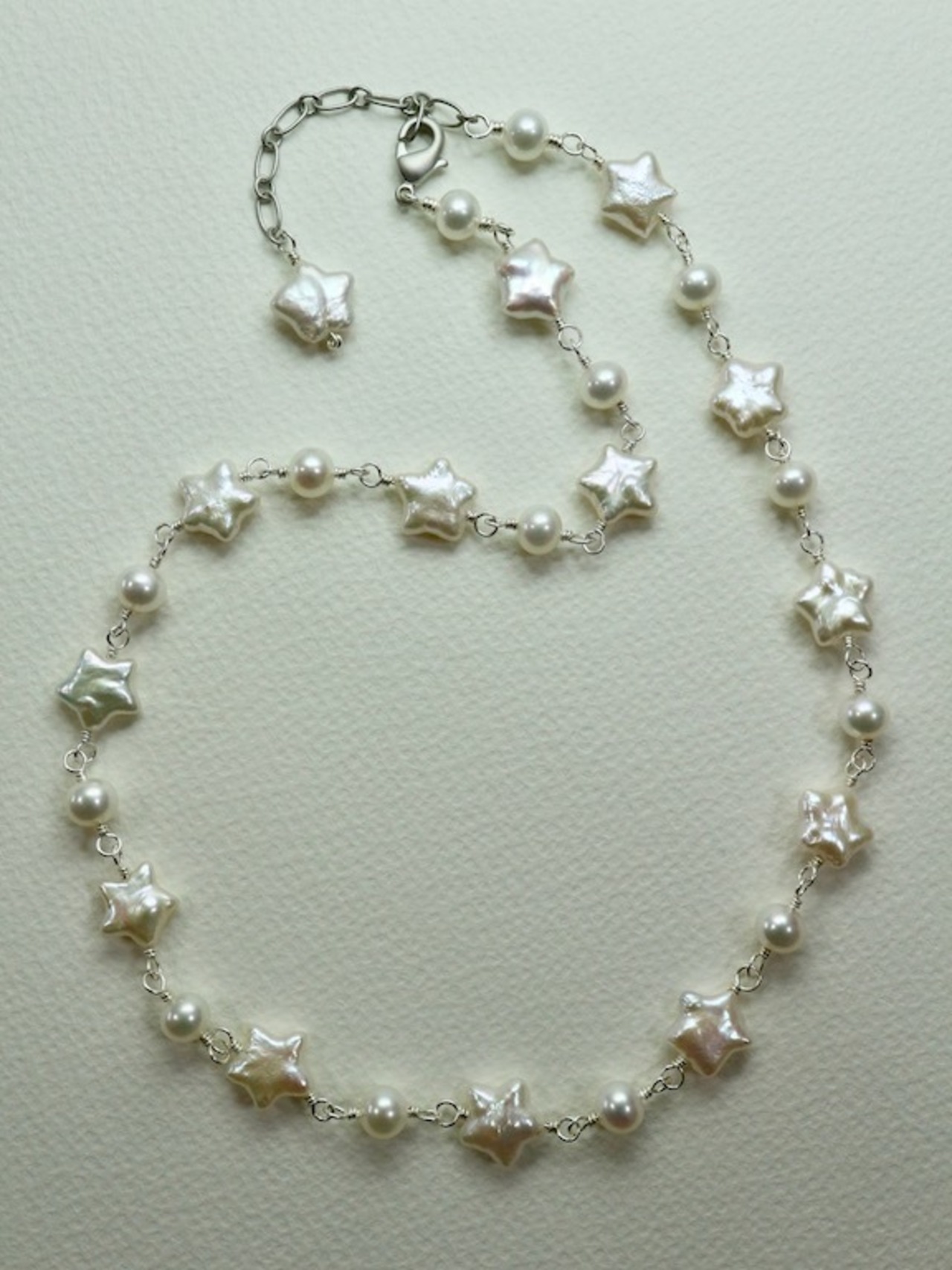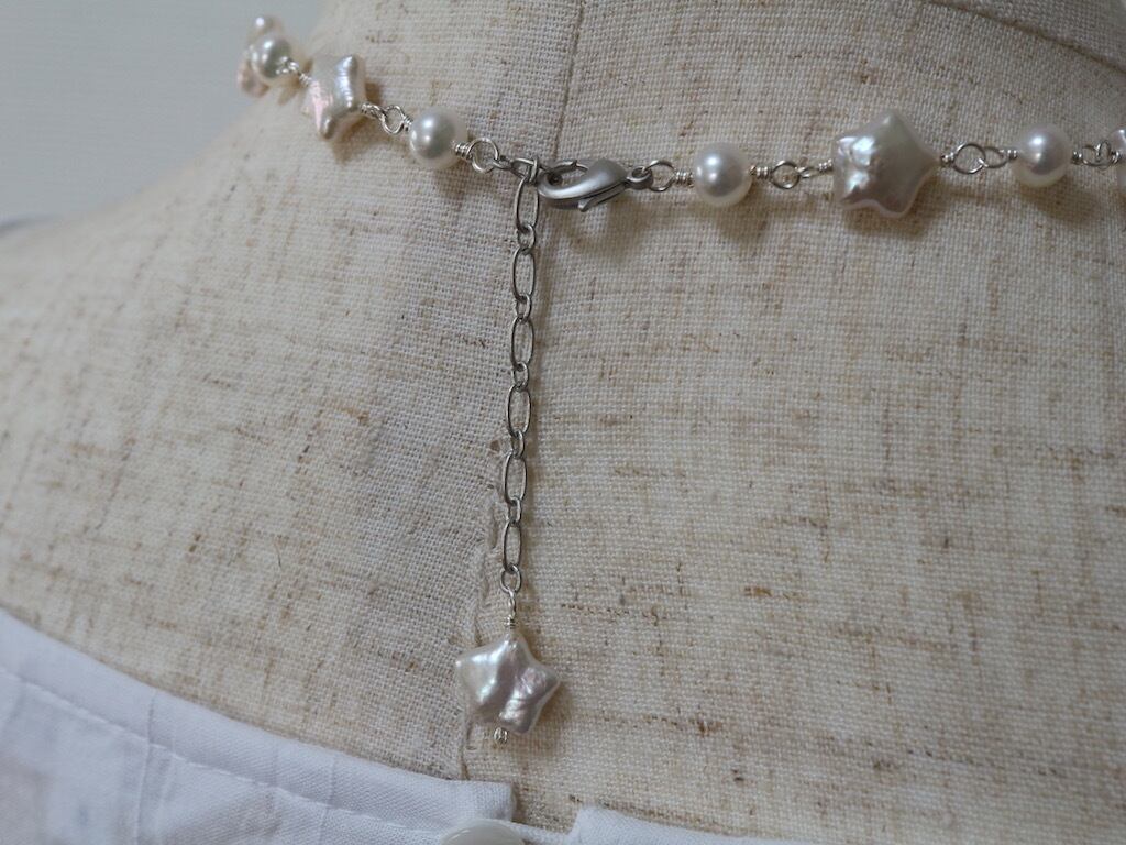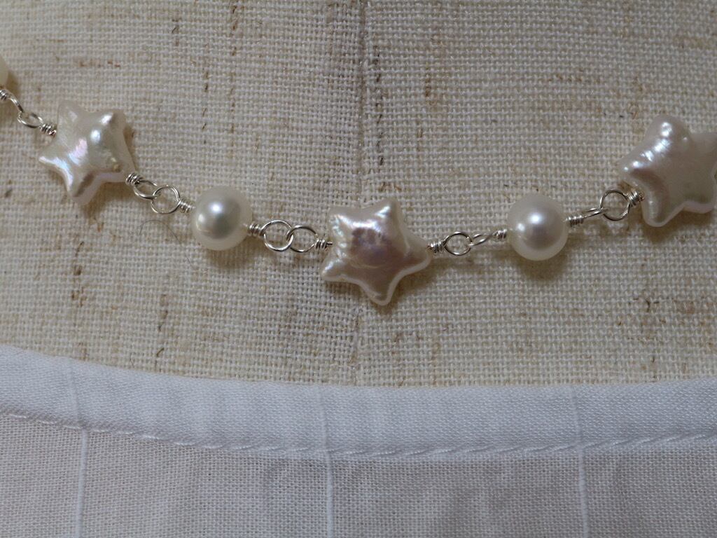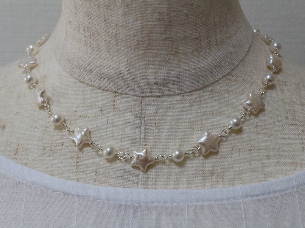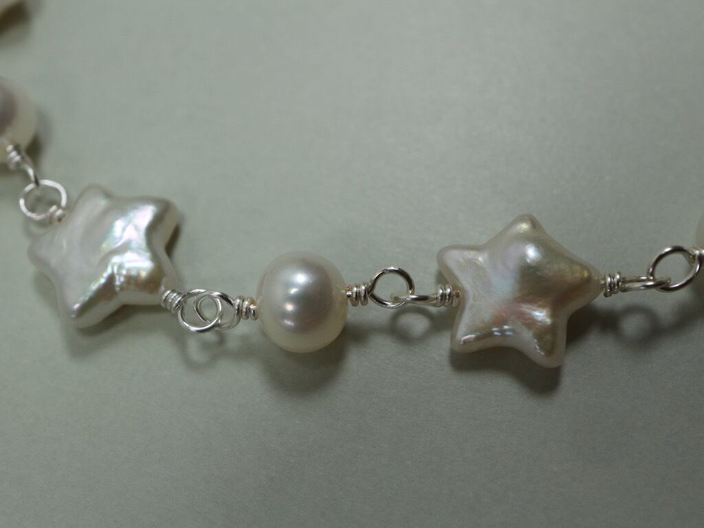 星形とポテト形の淡水パールをワイヤーでつないだショートネックレスです。星形パールは粒によって形がいろいろで、えくぼや膨らみがあったりしますが、そこが天然のものならではの味わいが出ています。