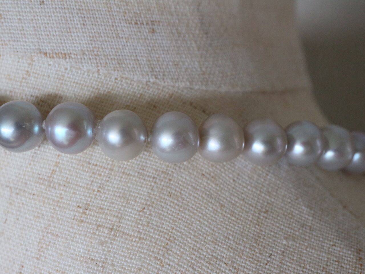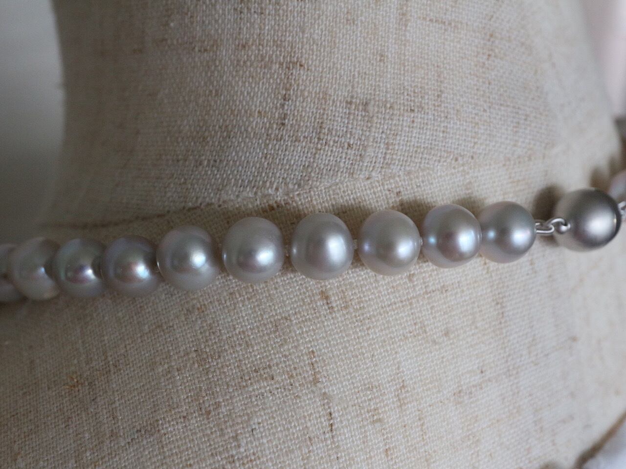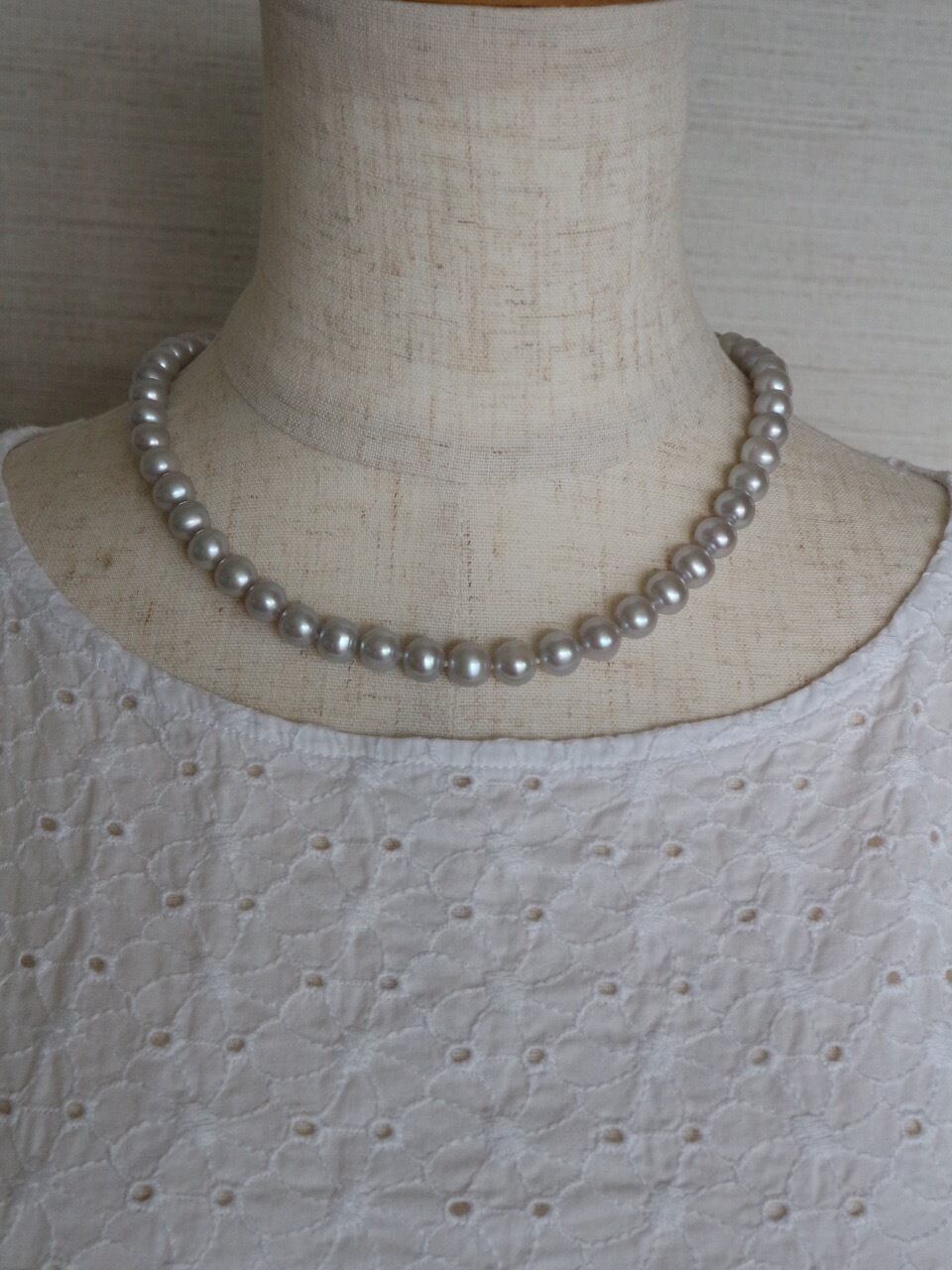 プラチナシルバーカラー(染)の淡水パールでショートネックレスを作りました。使用したパールはポテト形ですが、形が丸く整っている高品質のものです。色味も明るく上品なシルバーカラーで、洗練された雰囲気をかもし出しております。