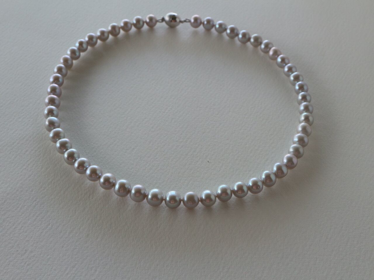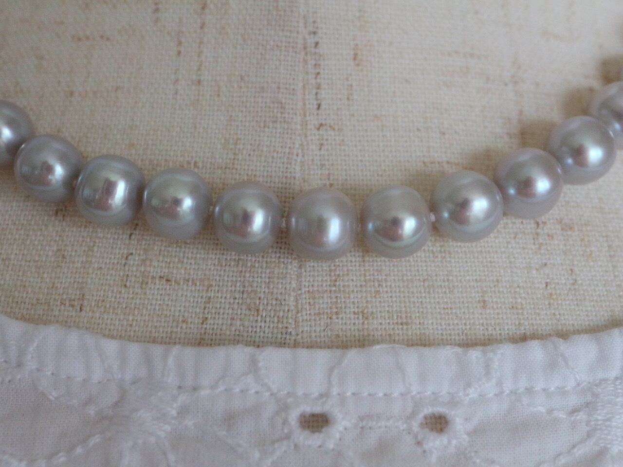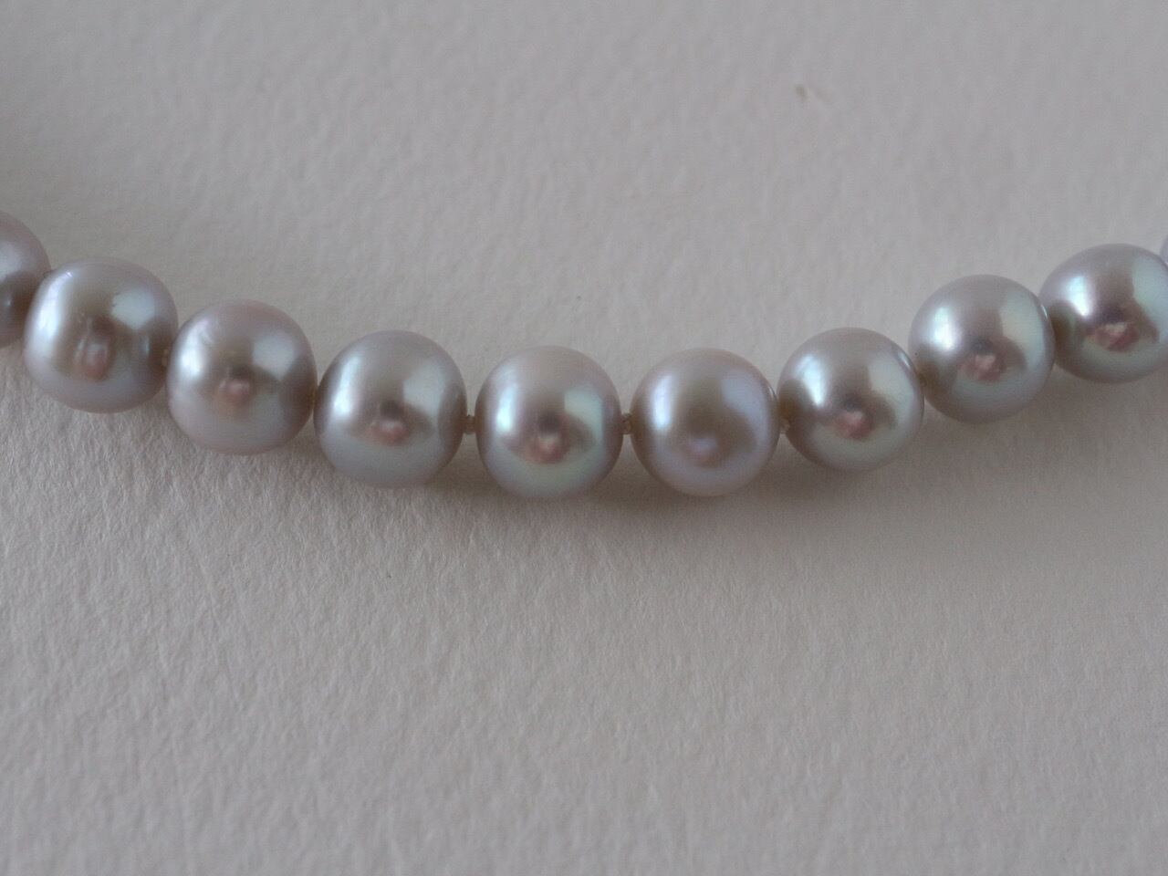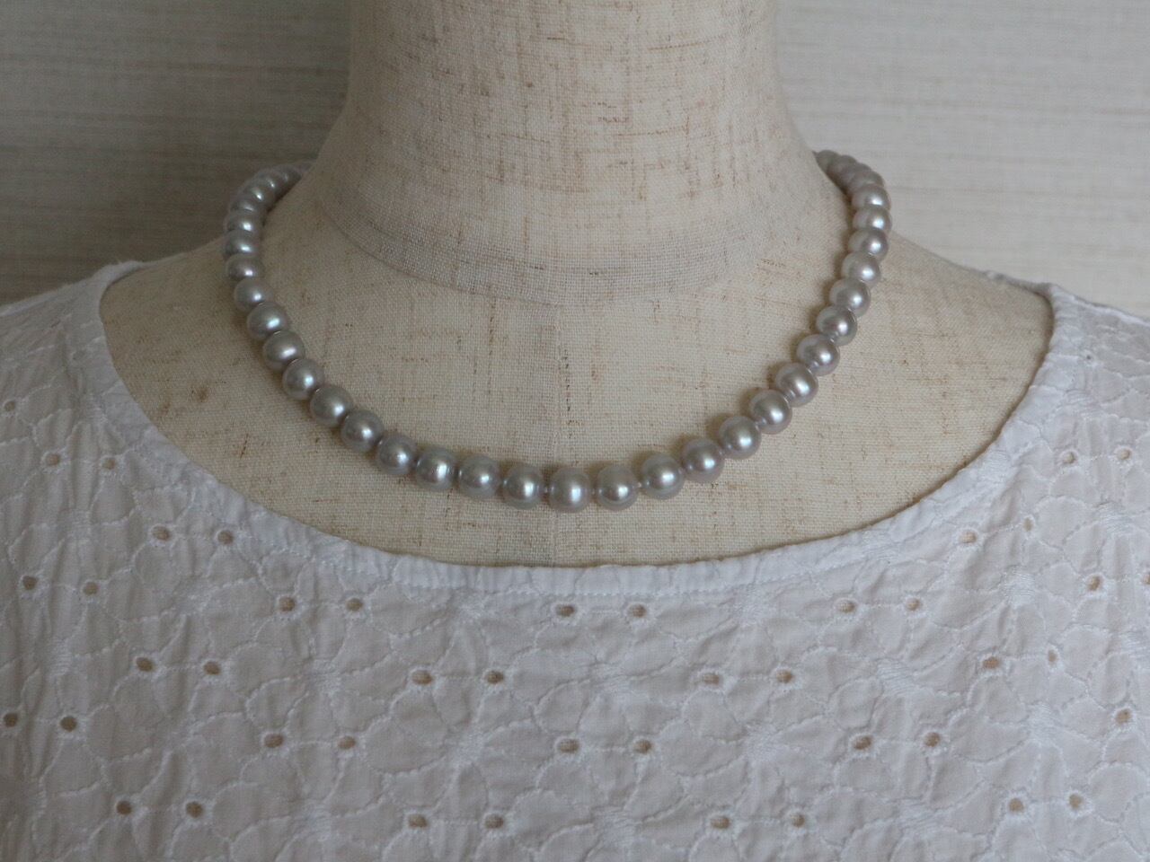 プラチナシルバーカラー(染)の淡水パールでショートネックレスを作りました。使用したパールはポテト形ですが、形が丸く整っている高品質のものです。色味も明るく上品なシルバーカラーで、洗練された雰囲気をかもし出しております。
