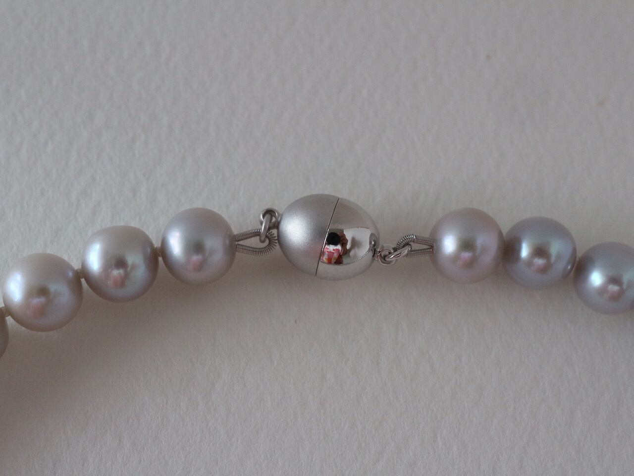 留金具にワンタッチで簡単にネックレスを着けられる、強力マグネット式のクラスプを使用しております。ふっくら楕円形で、半分ずつグレーの色が異なっている、綺麗なデザインの見せるタイプのクラスプです。