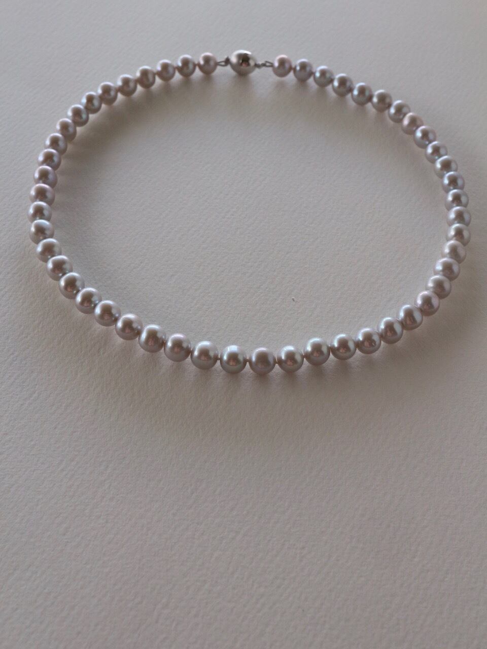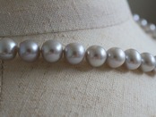 パールとパールの間に結び目(ノット)を作るオールノットの技法で作っております(糸が4本通るタイプのオールノット)。パールの大きさも8ミリと程よい大きさで、また糸で作っているのでネックレスラインに沿い、着けやすいネックレスに仕上がっていると思います。