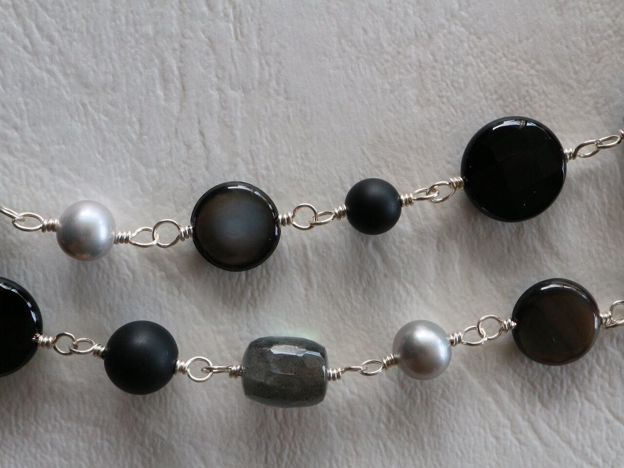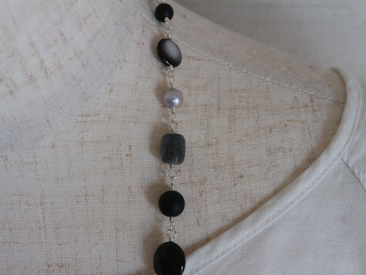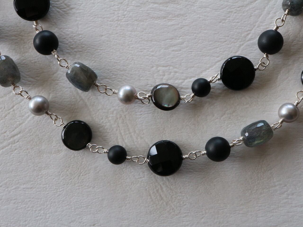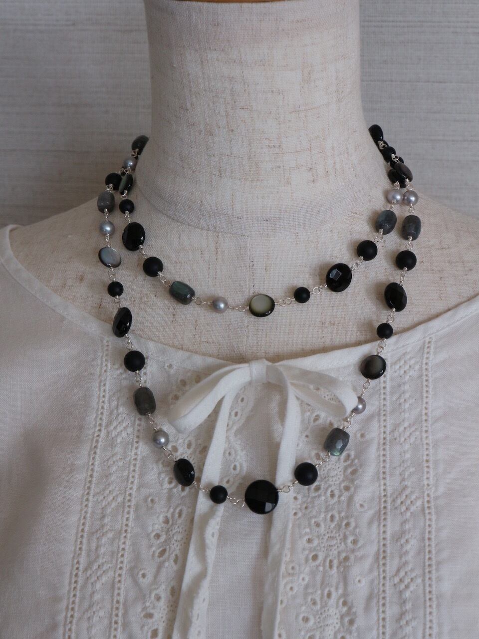 落ちついた天然黒色のコイン形オニキス、フロスト(つや消し)加工されたやさしい雰囲気の丸形オニキス、照りがきれいな黒蝶貝、ラブラドレッセンスが美しいチューブ形ラブラドライト、形の整ったセミラウンド形の淡水パールを、メガネ留めの技法でワイヤーでつないで作りました。
