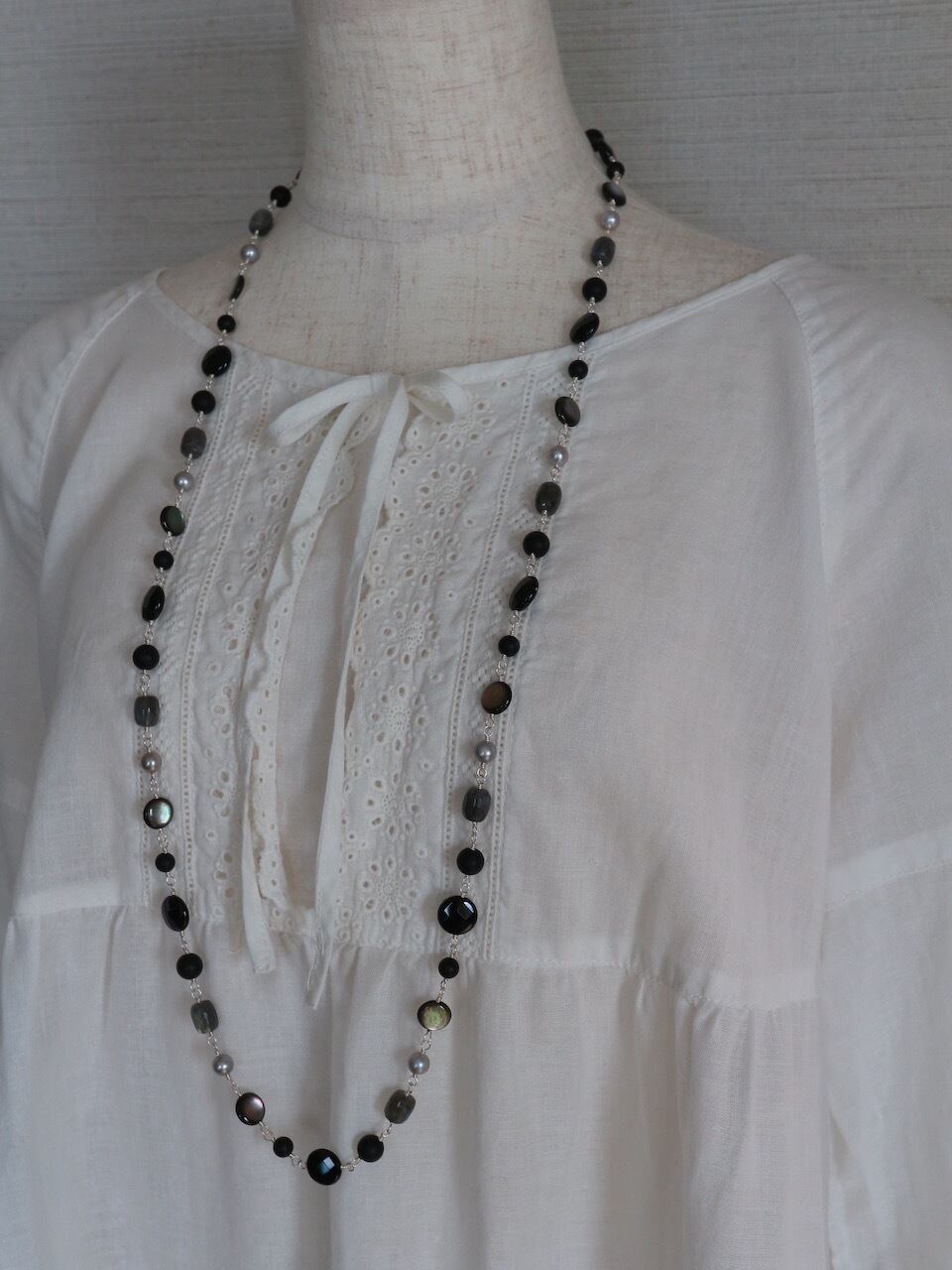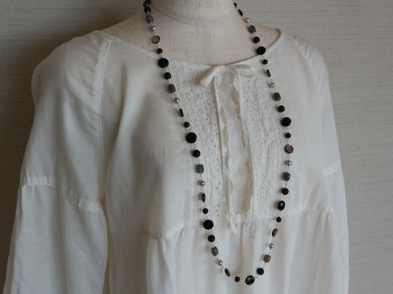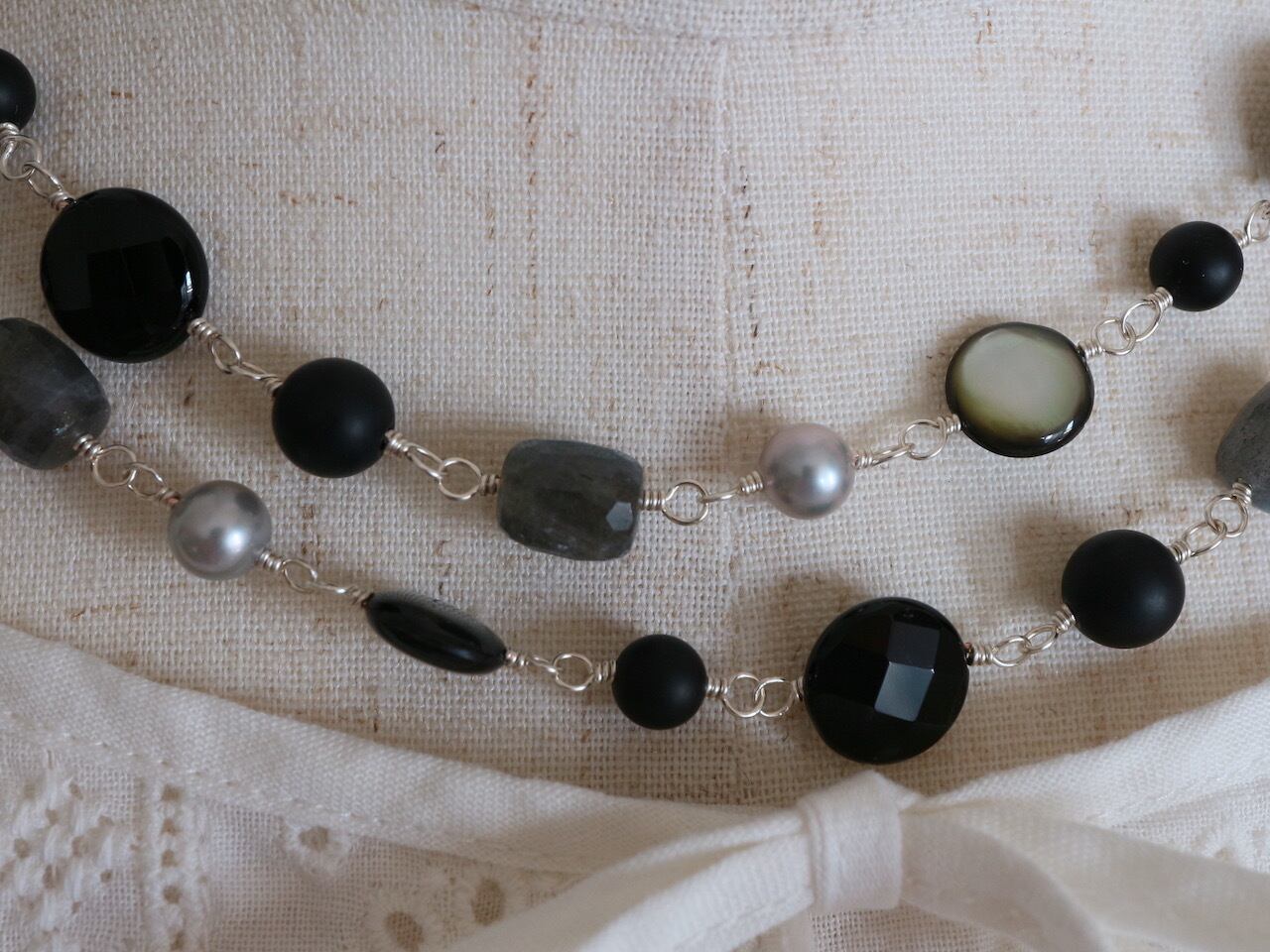 落ちついた天然黒色のコイン形オニキス、フロスト(つや消し)加工されたやさしい雰囲気の丸形オニキス、照りがきれいな黒蝶貝、ラブラドレッセンスが美しいチューブ形ラブラドライト、形の整ったセミラウンド形の淡水パールを、メガネ留めの技法でワイヤーでつないで作りました。