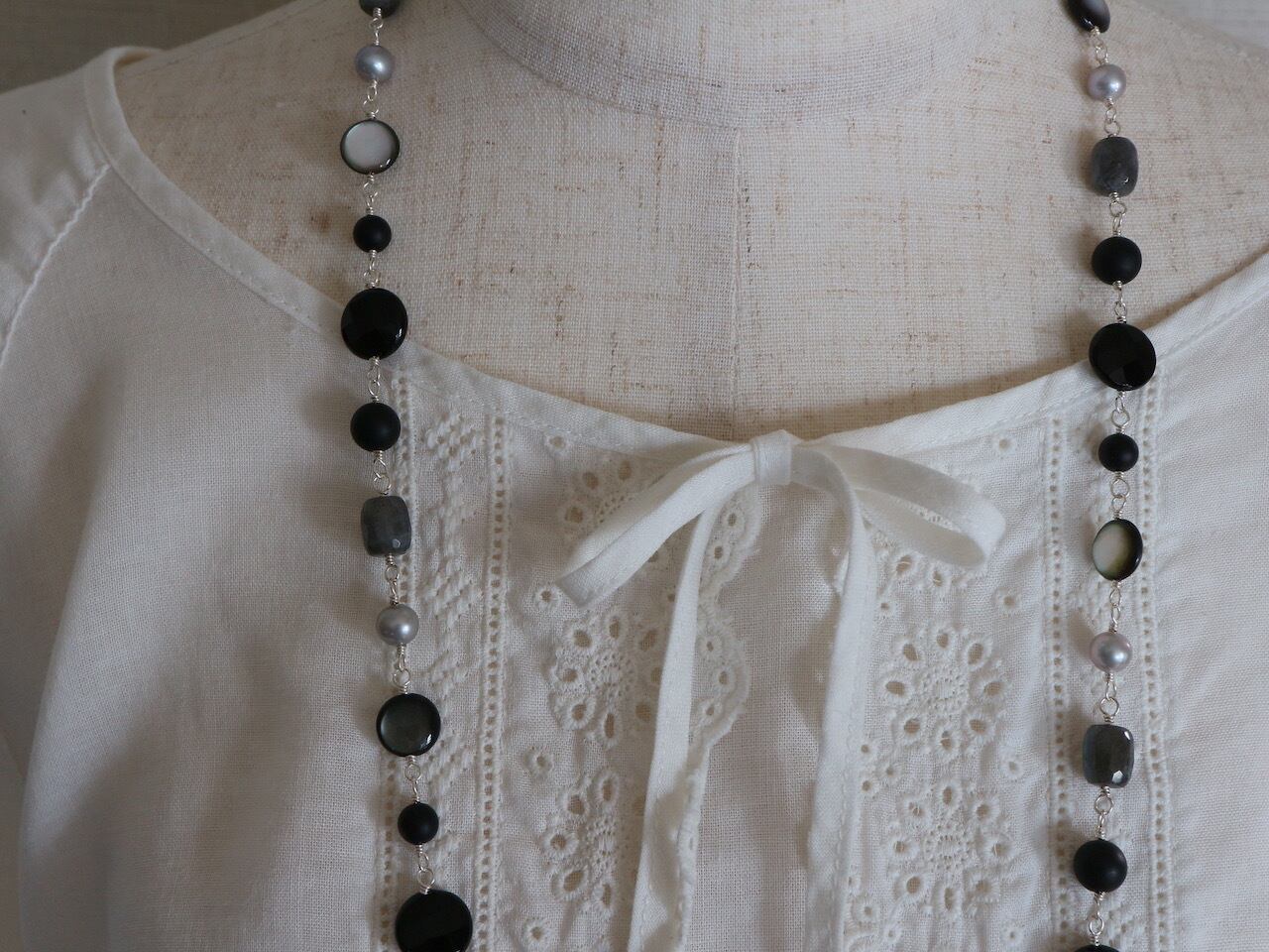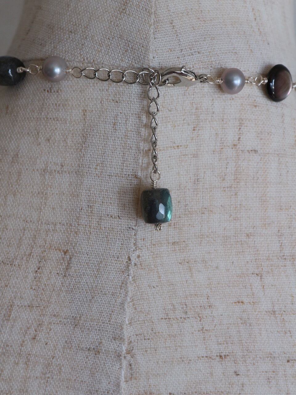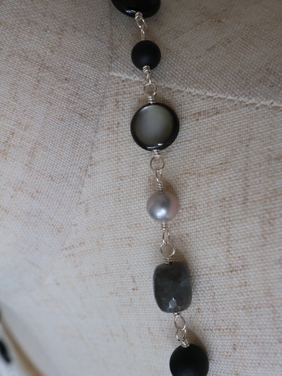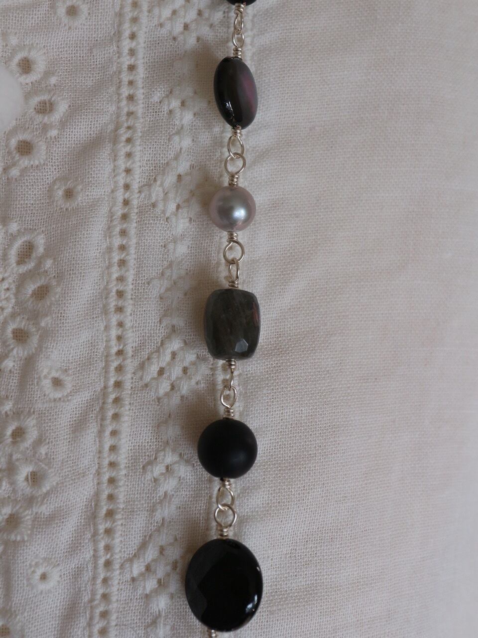 落ちついた天然黒色のコイン形オニキス、フロスト(つや消し)加工されたやさしい雰囲気の丸形オニキス、照りがきれいな黒蝶貝、ラブラドレッセンスが美しいチューブ形ラブラドライト、形の整ったセミラウンド形の淡水パールを、メガネ留めの技法でワイヤーでつないで作りました。