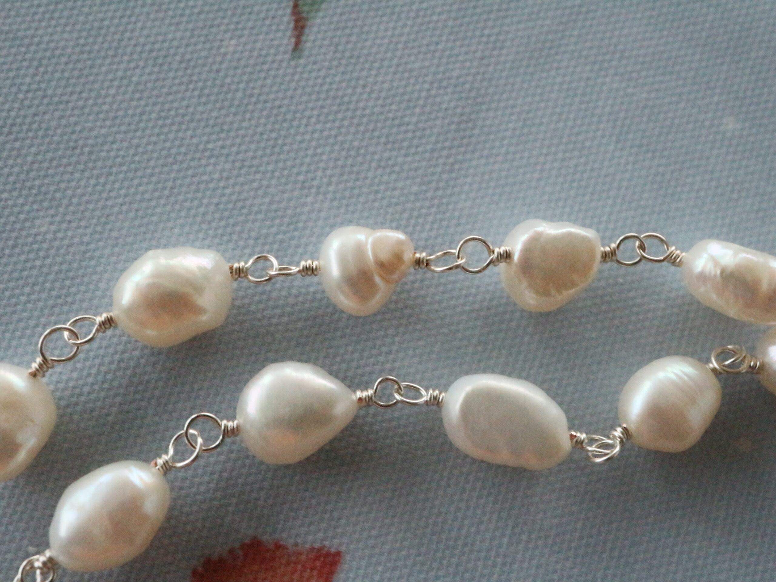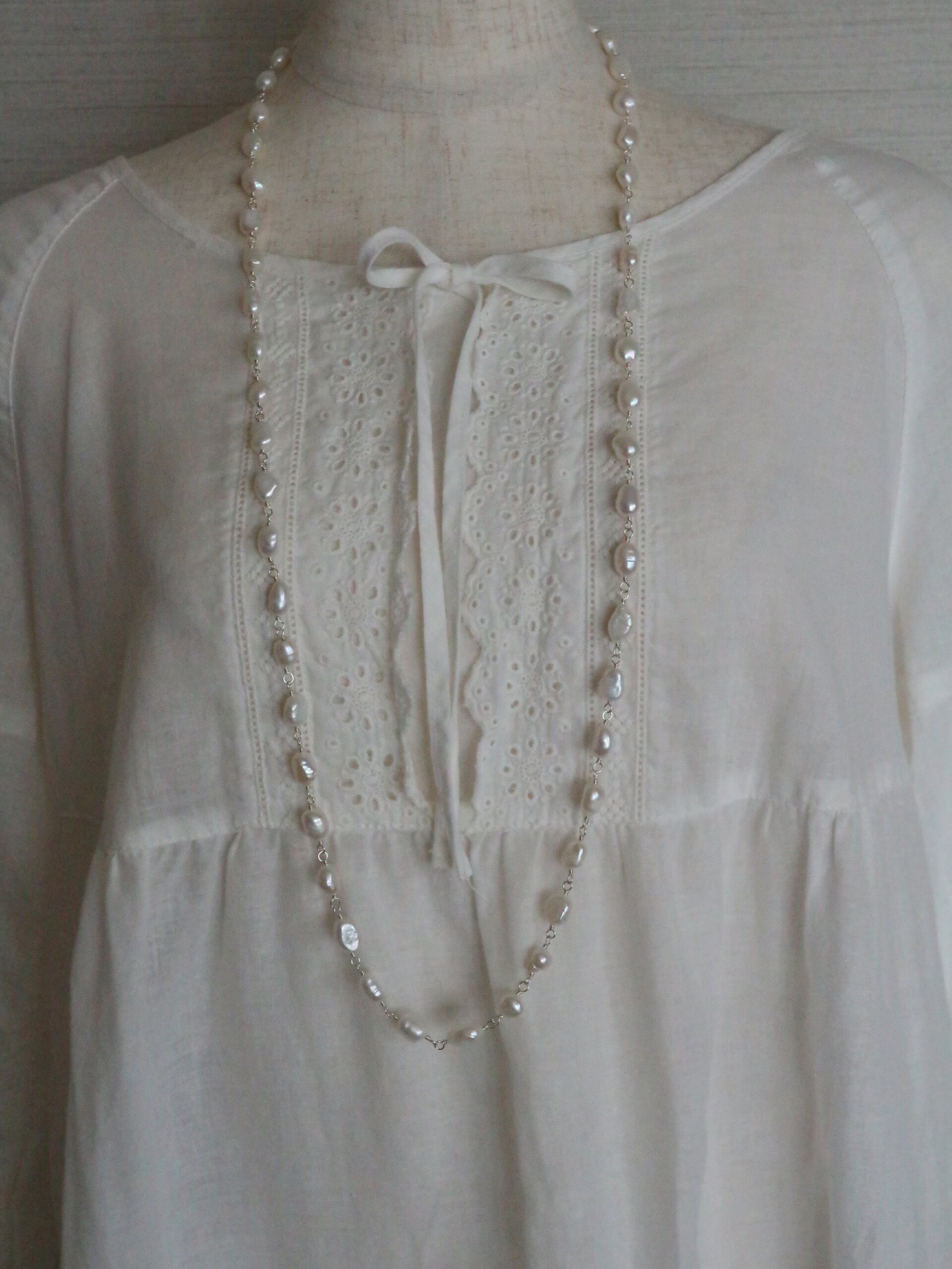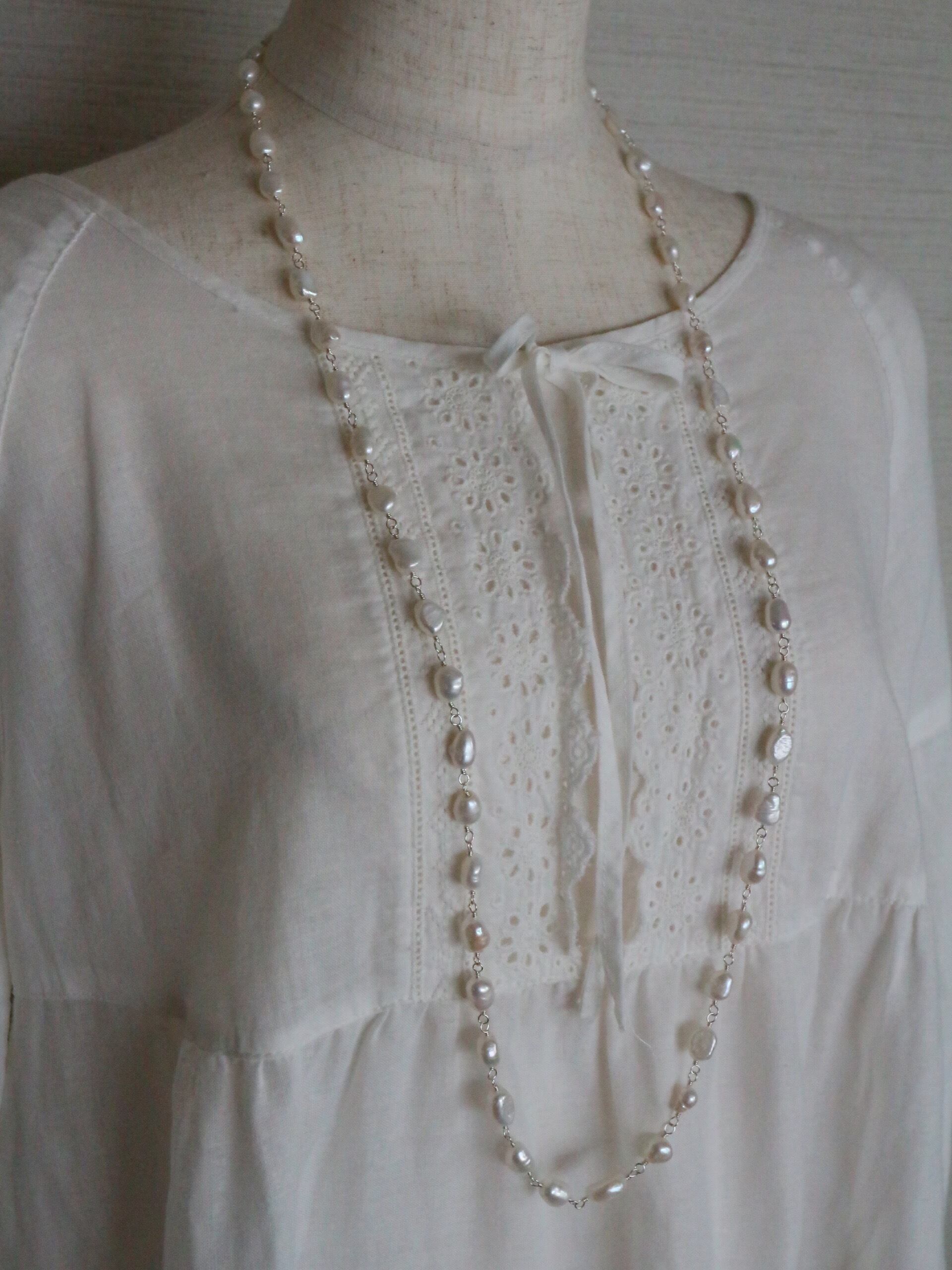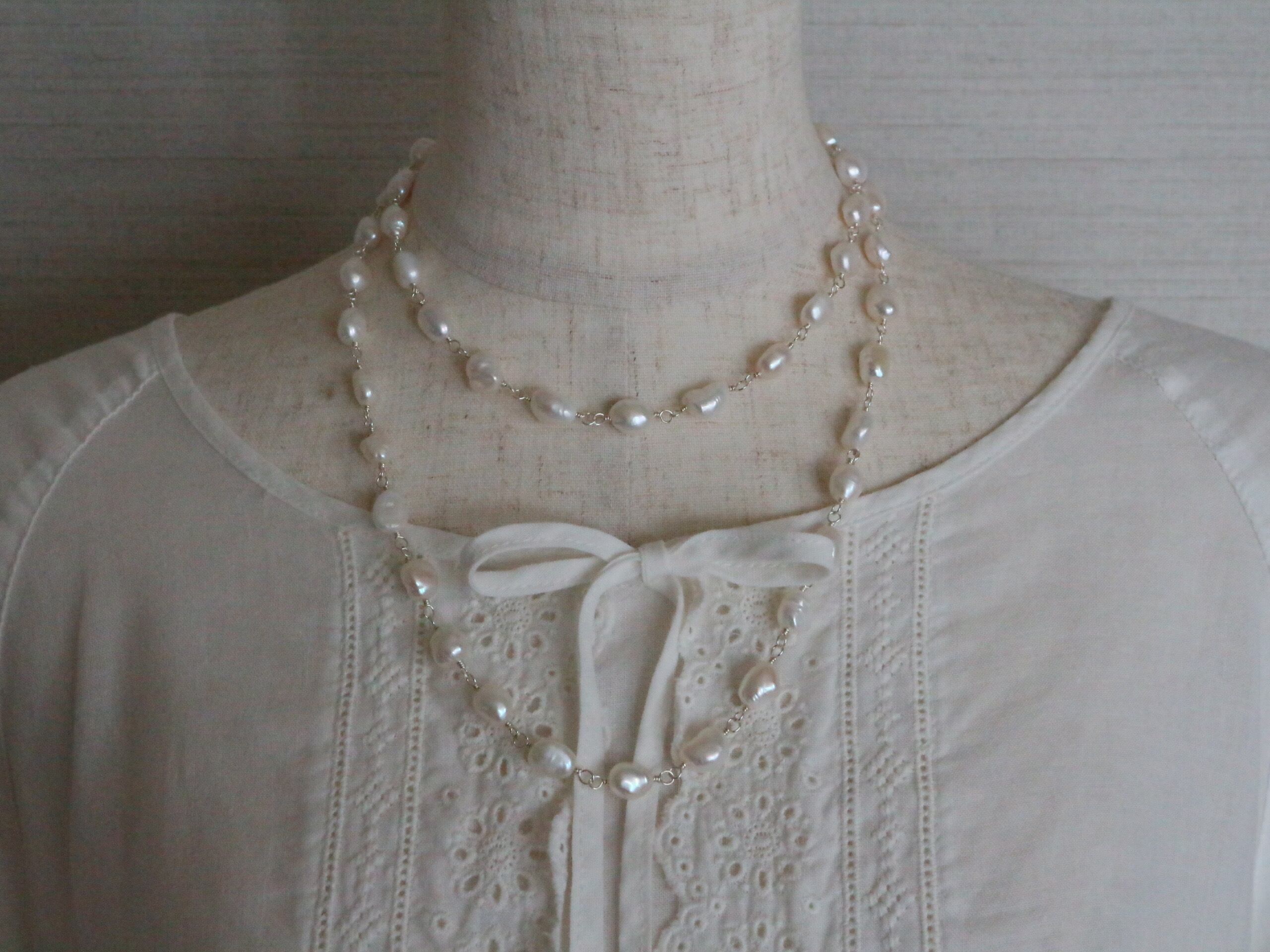 いろいろな形が楽しい天然のバロックパールをワイヤーでつないで作った(メガネ留め)ロングネックレスです。