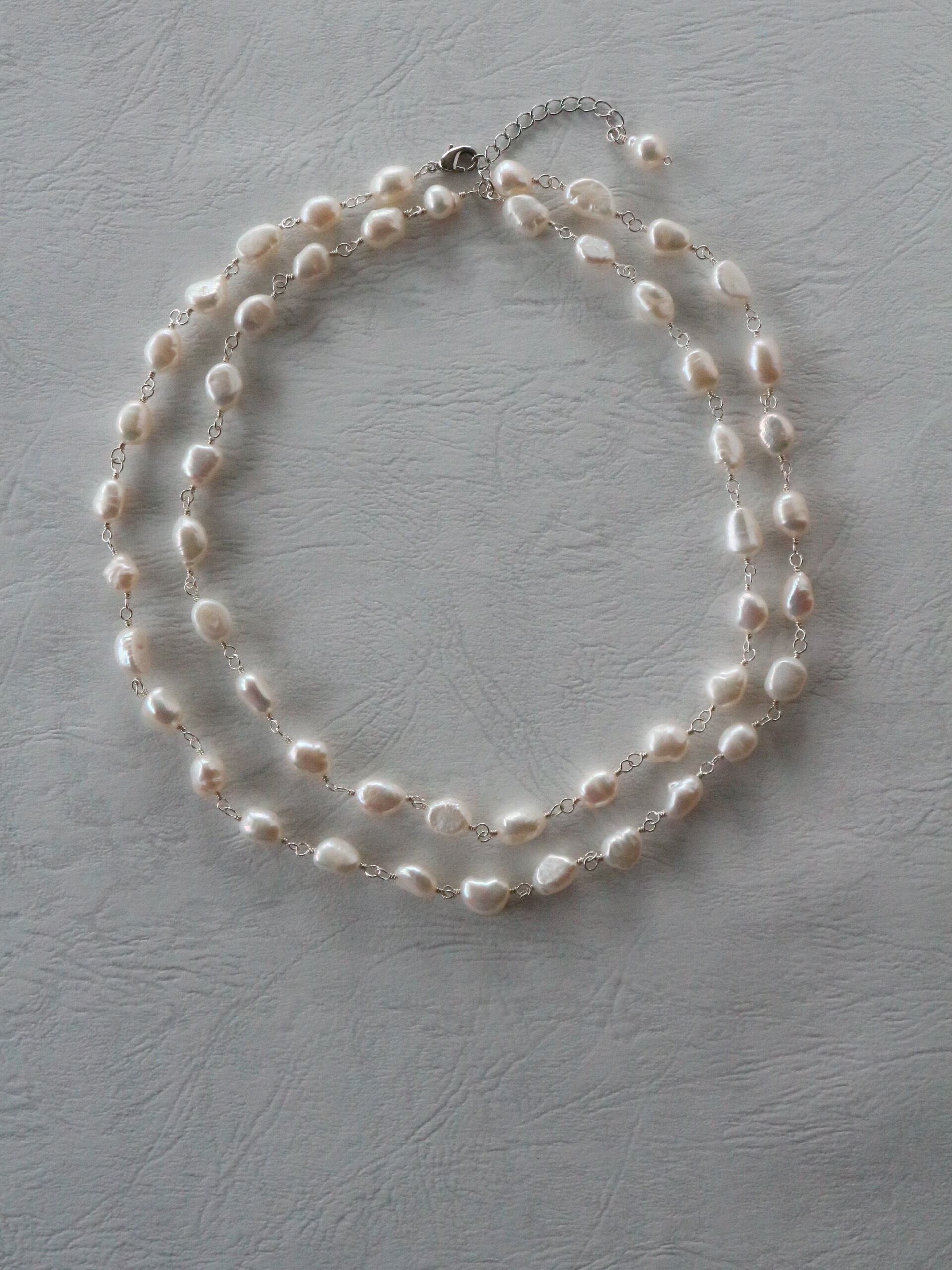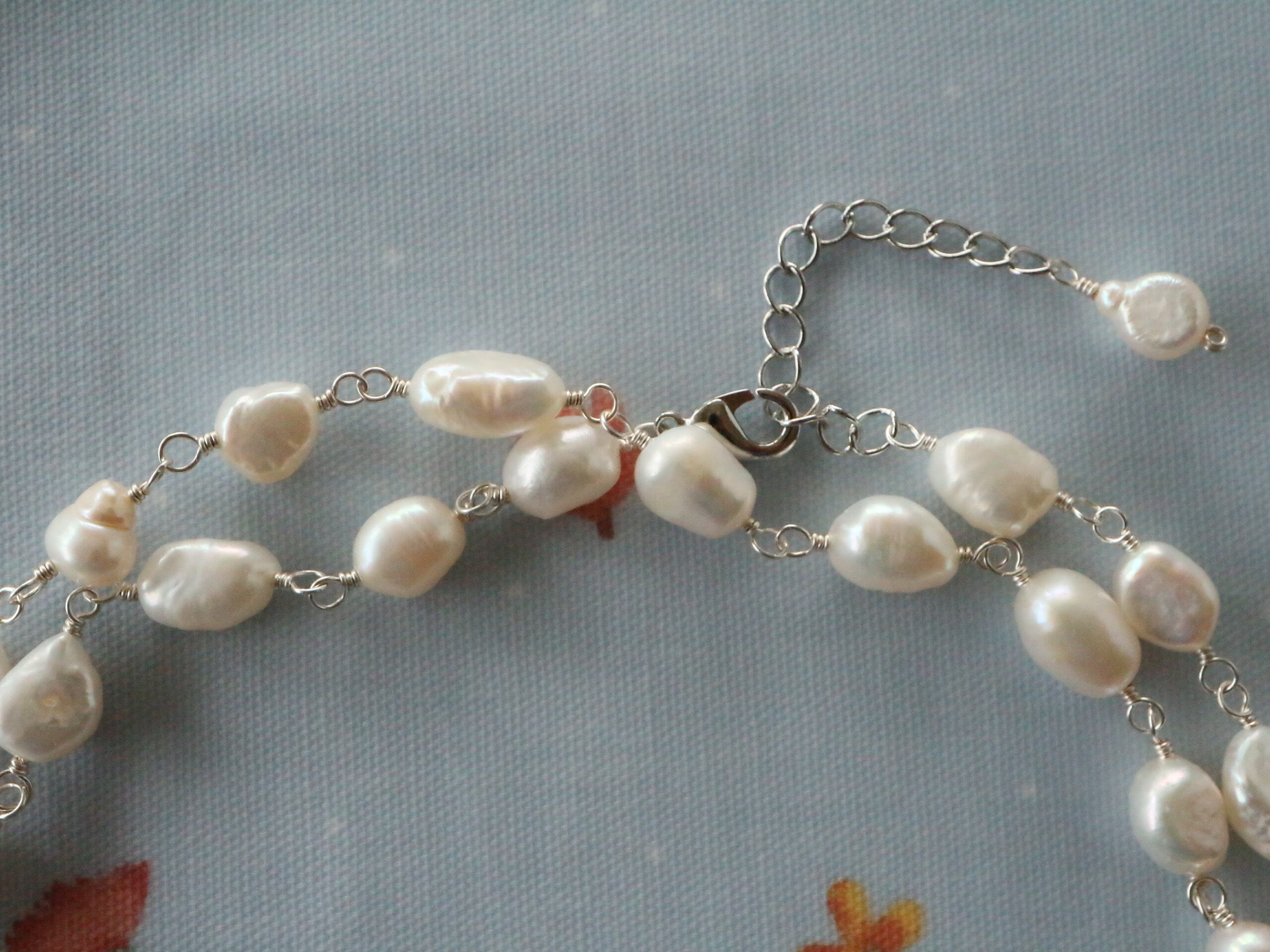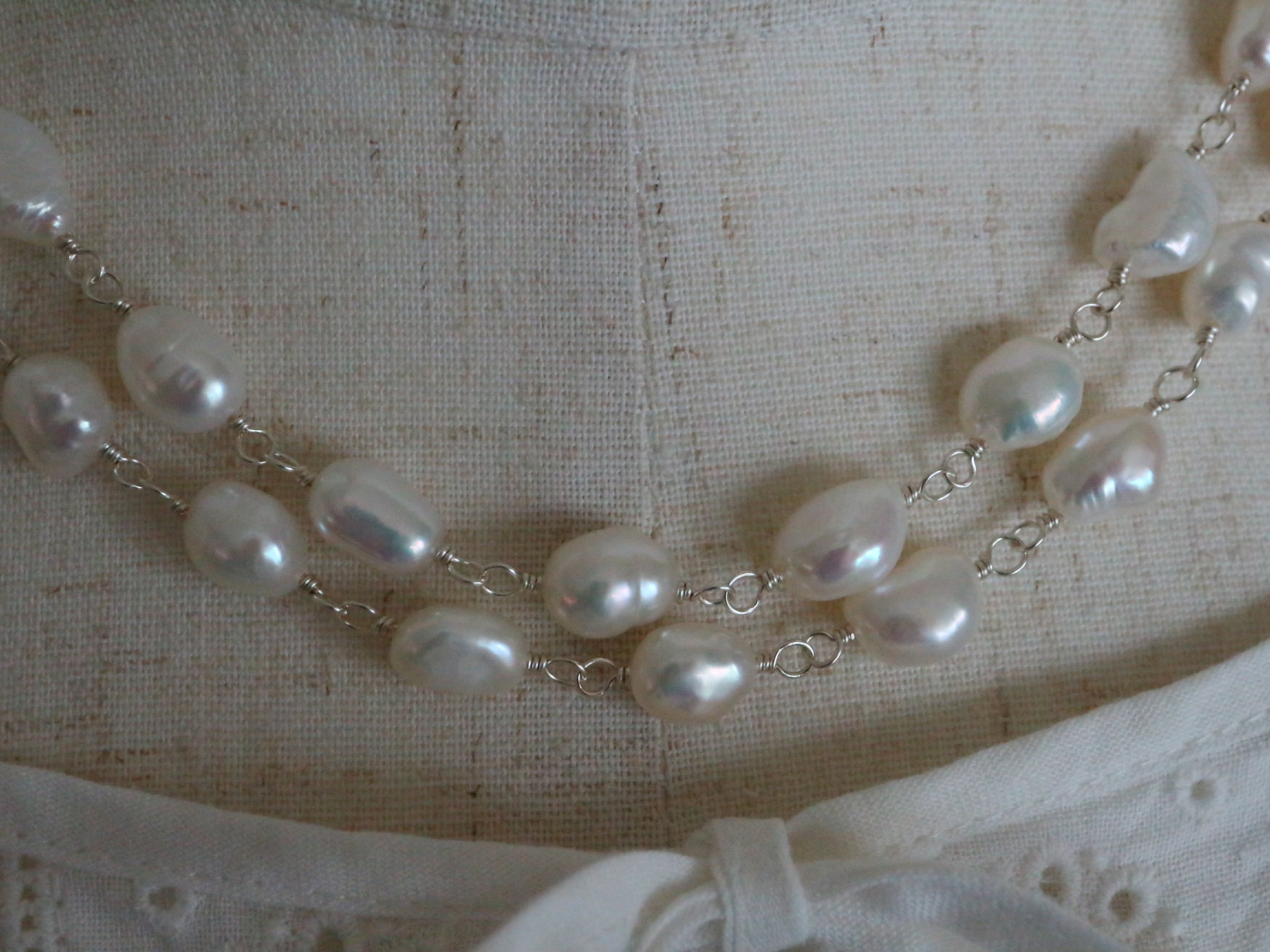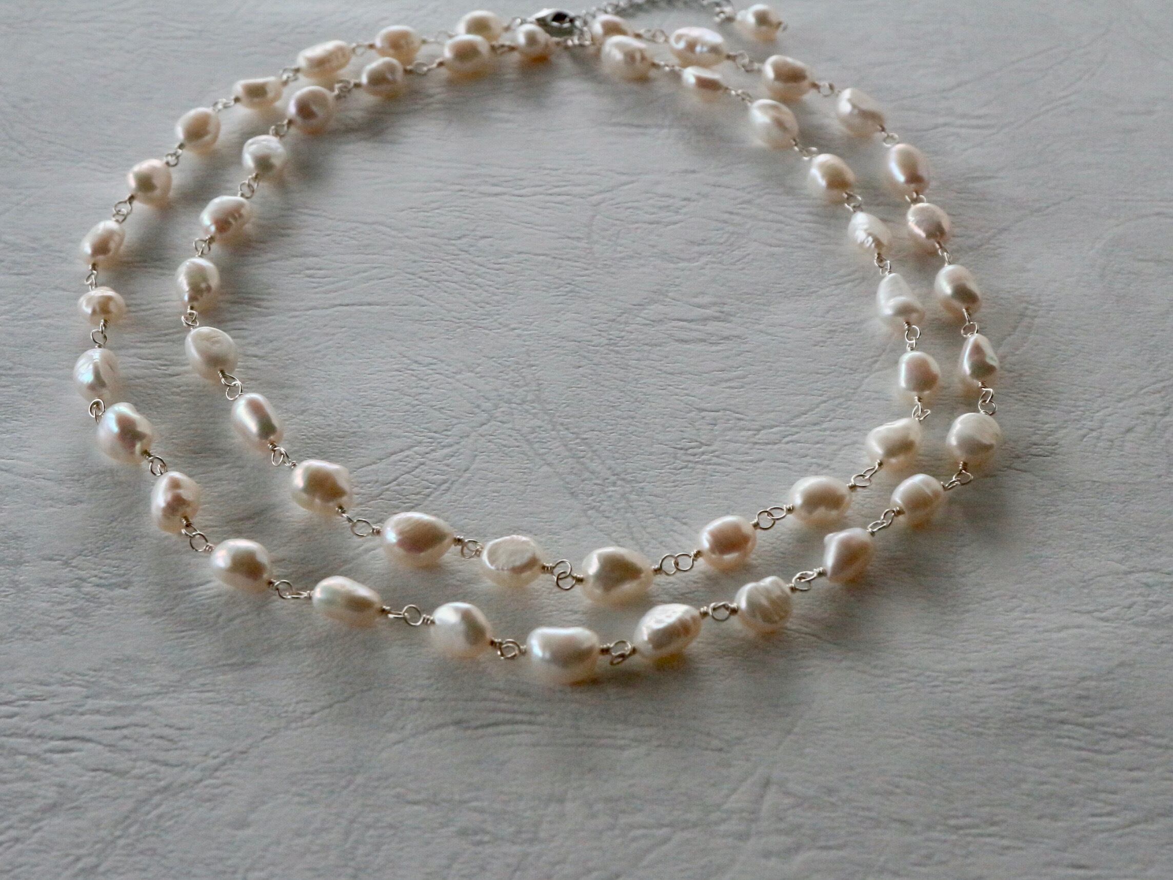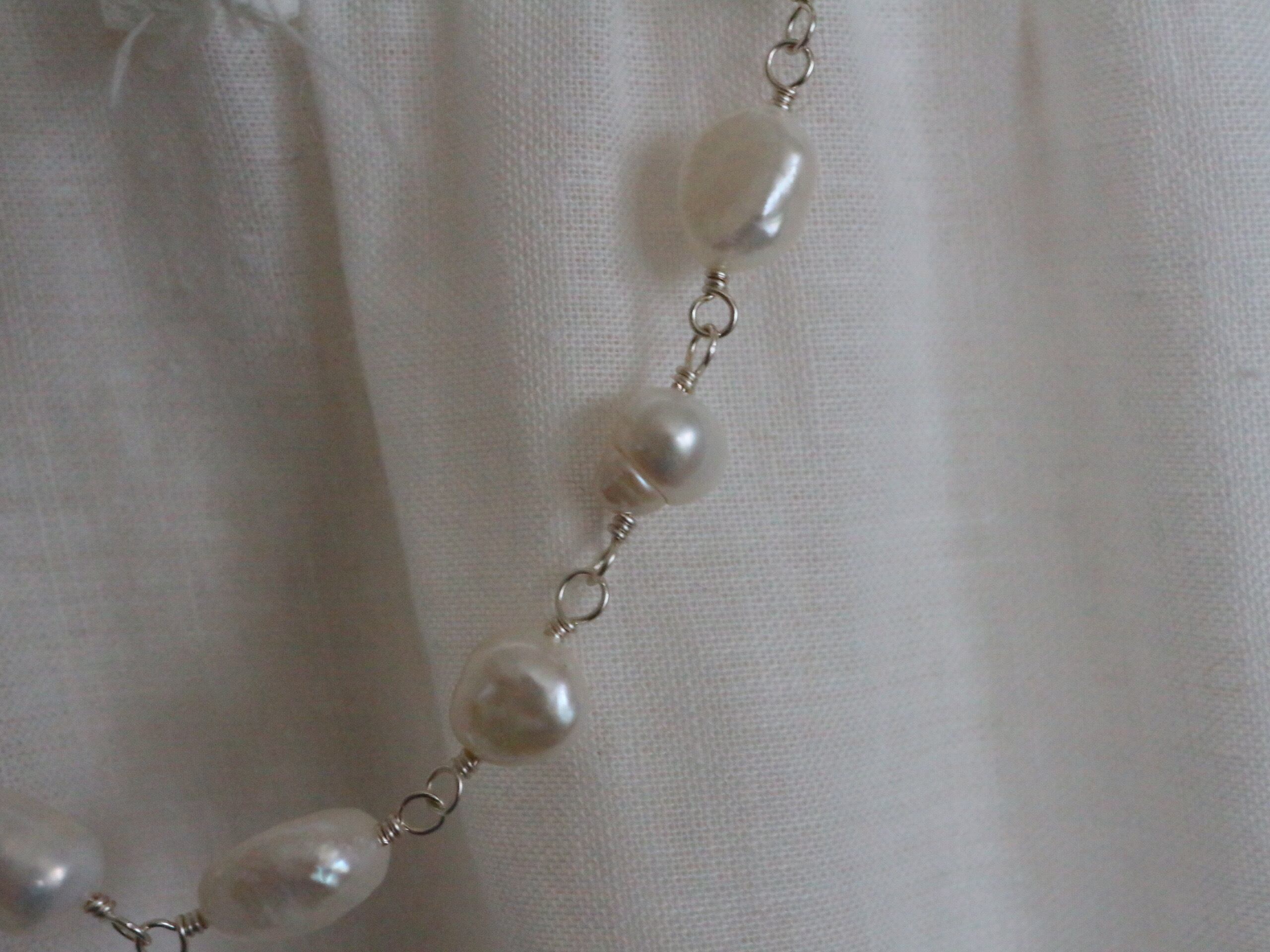 いろいろな形が楽しい天然のバロックパールをワイヤーでつないで作った(メガネ留め)ロングネックレスです。