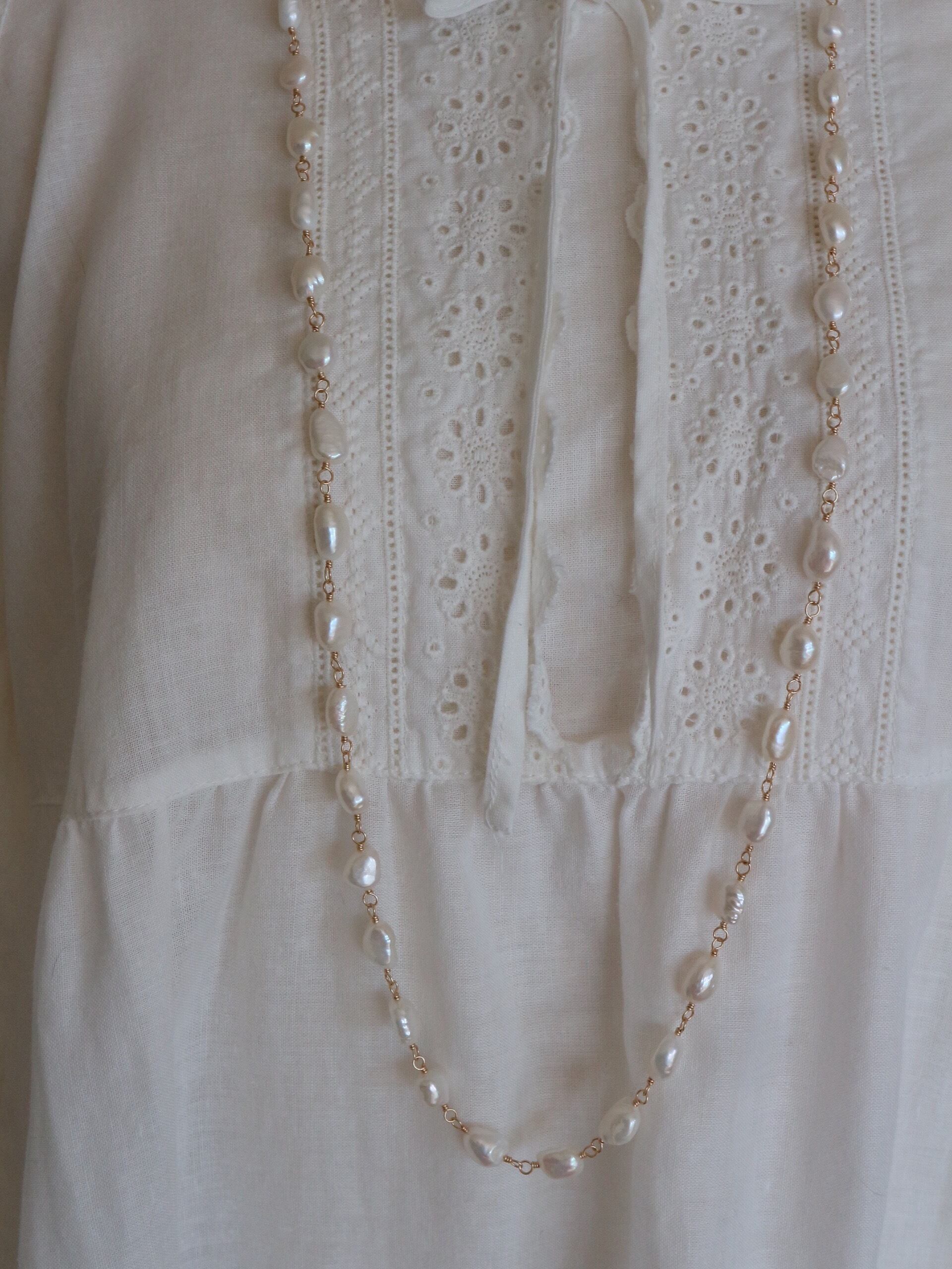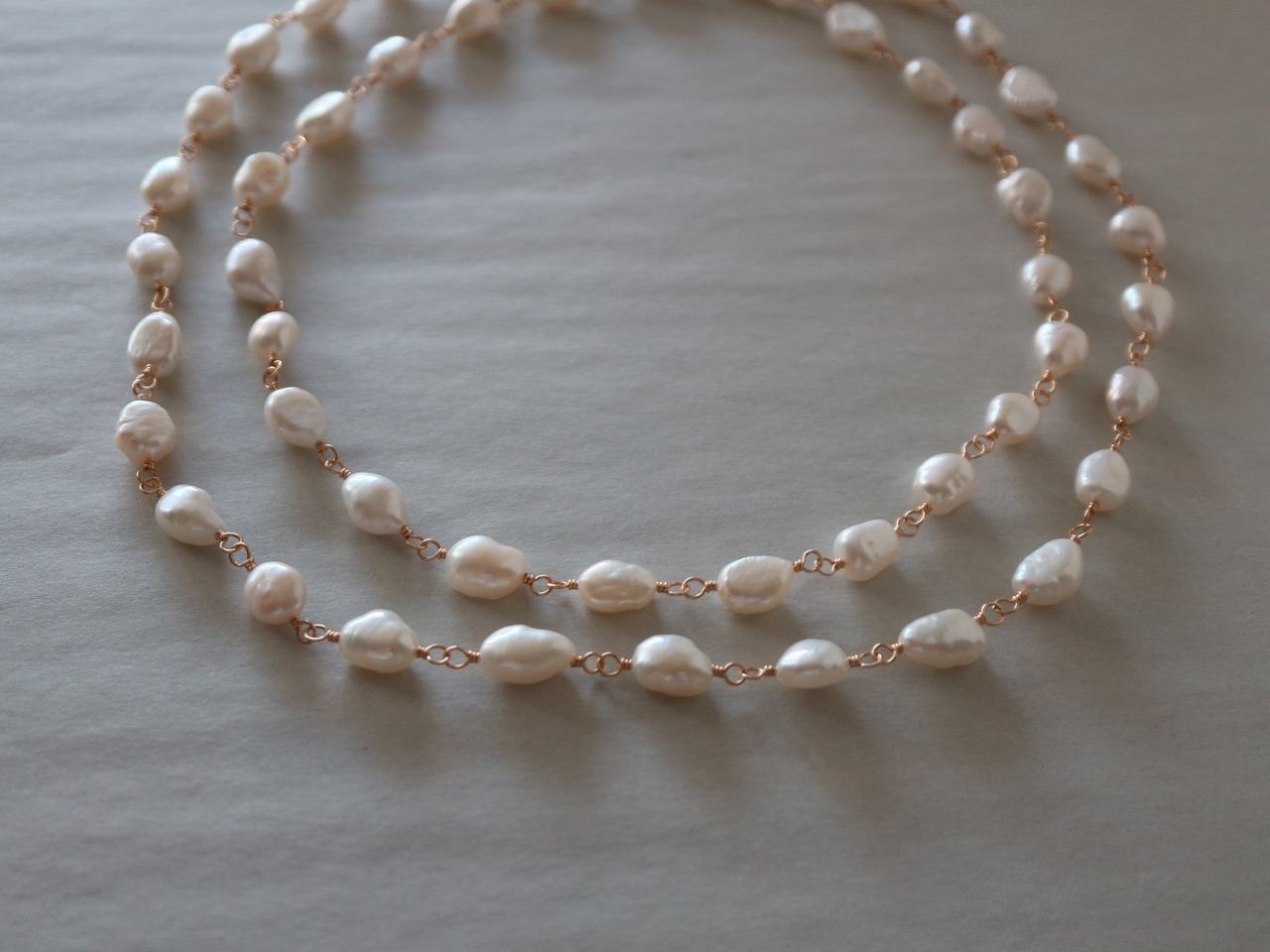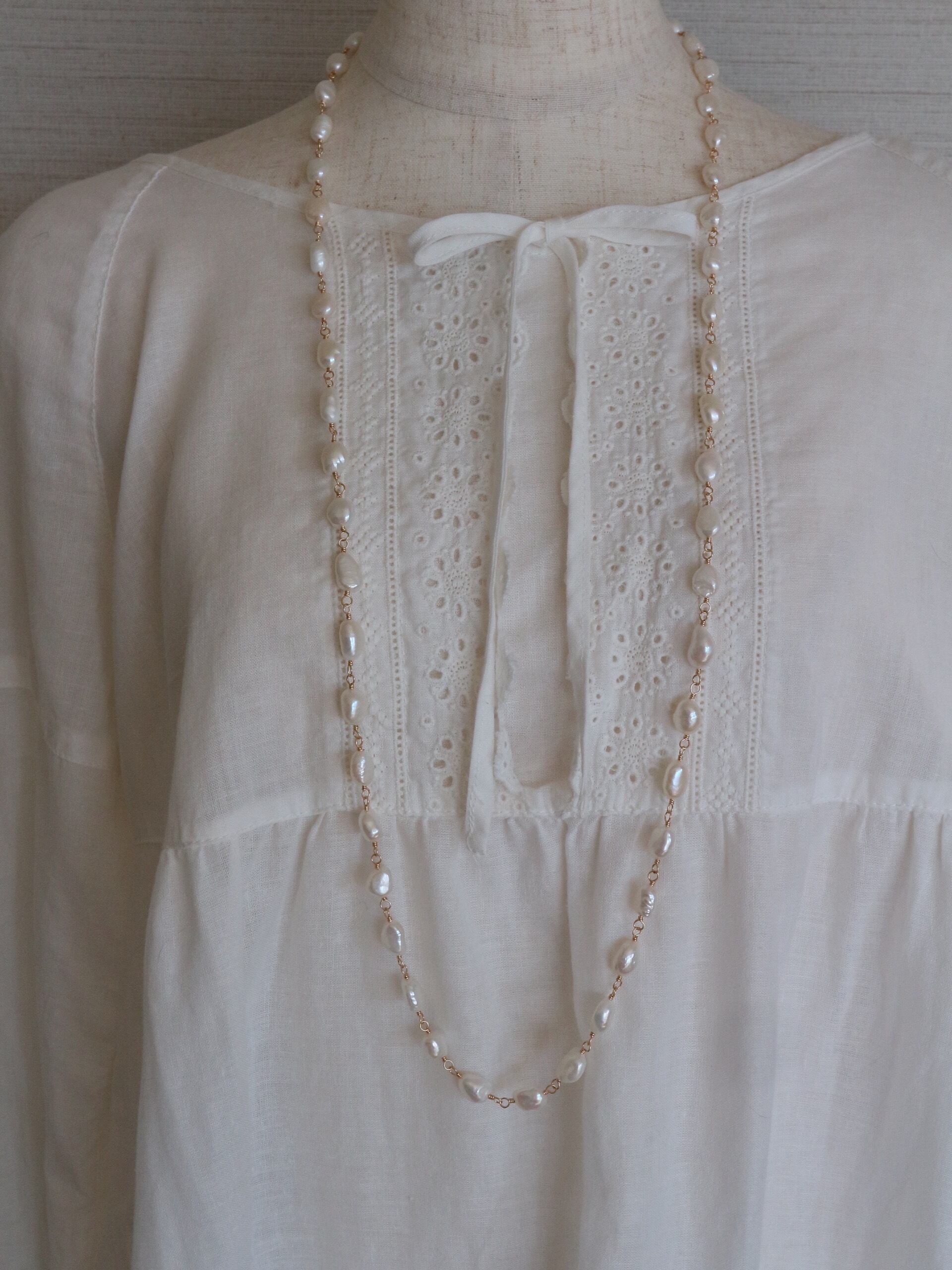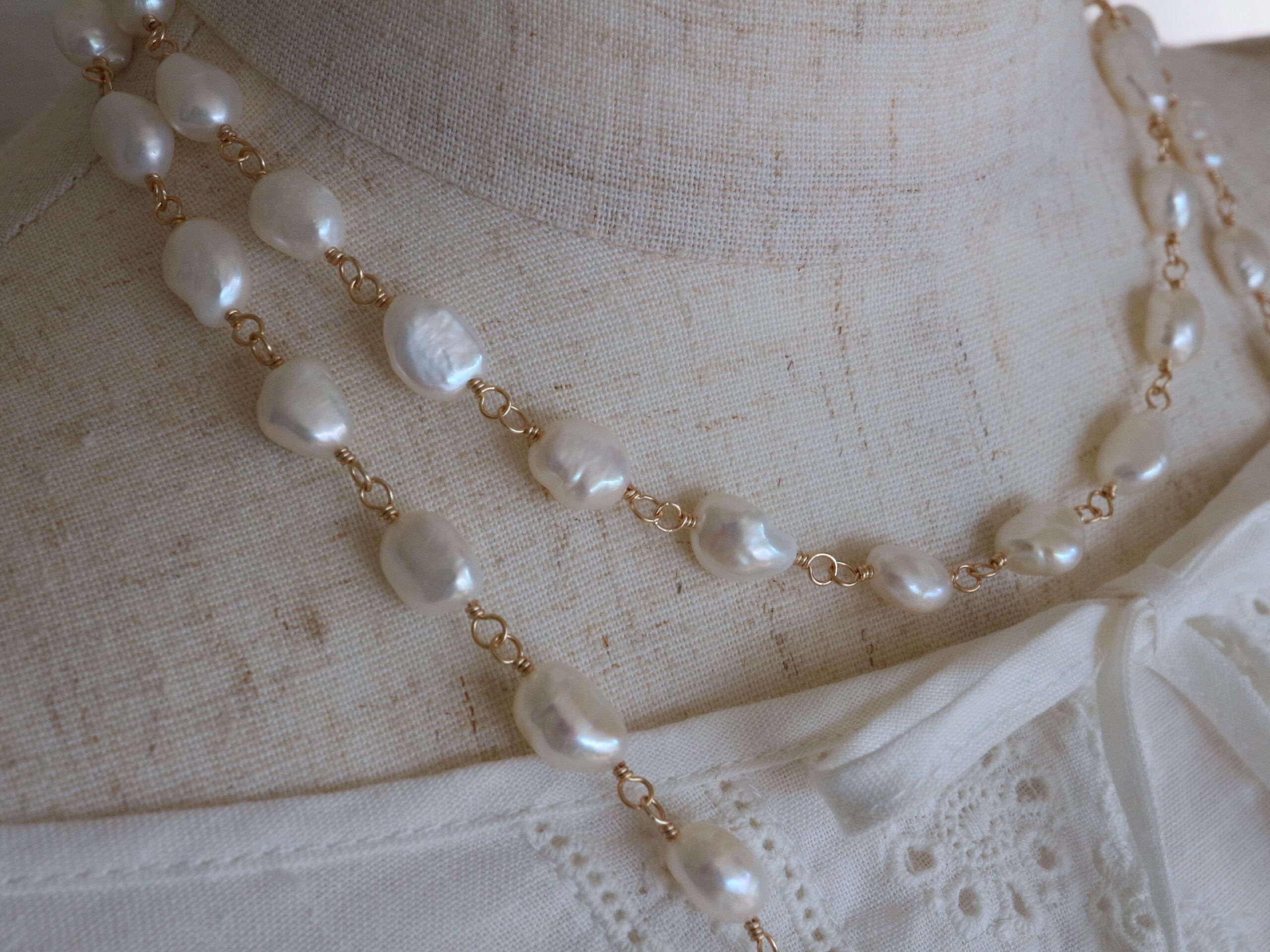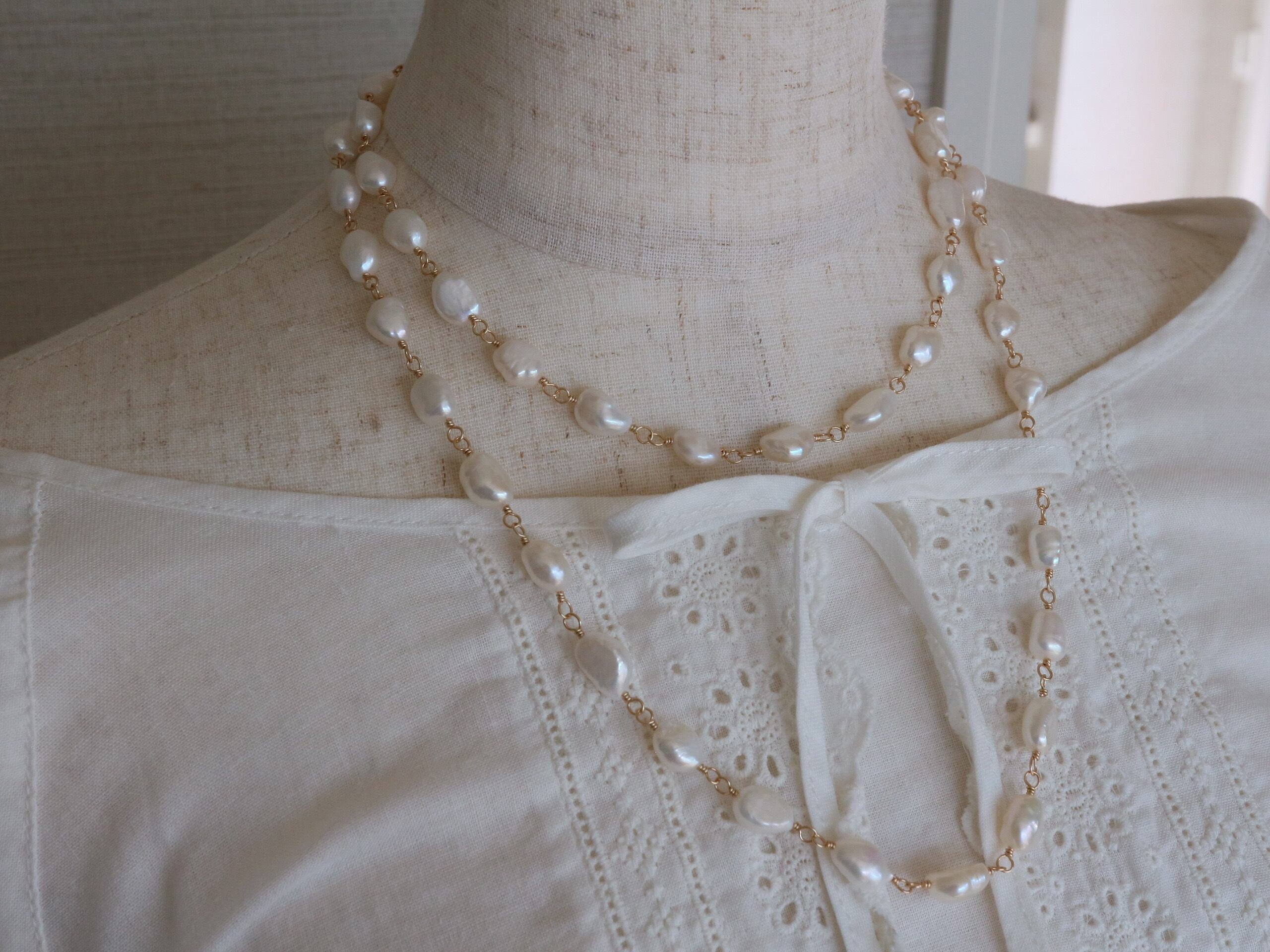 いろいろな形が楽しい天然のバロックパールをワイヤーでつないで作った(メガネ留め)ロングネックレスです。
