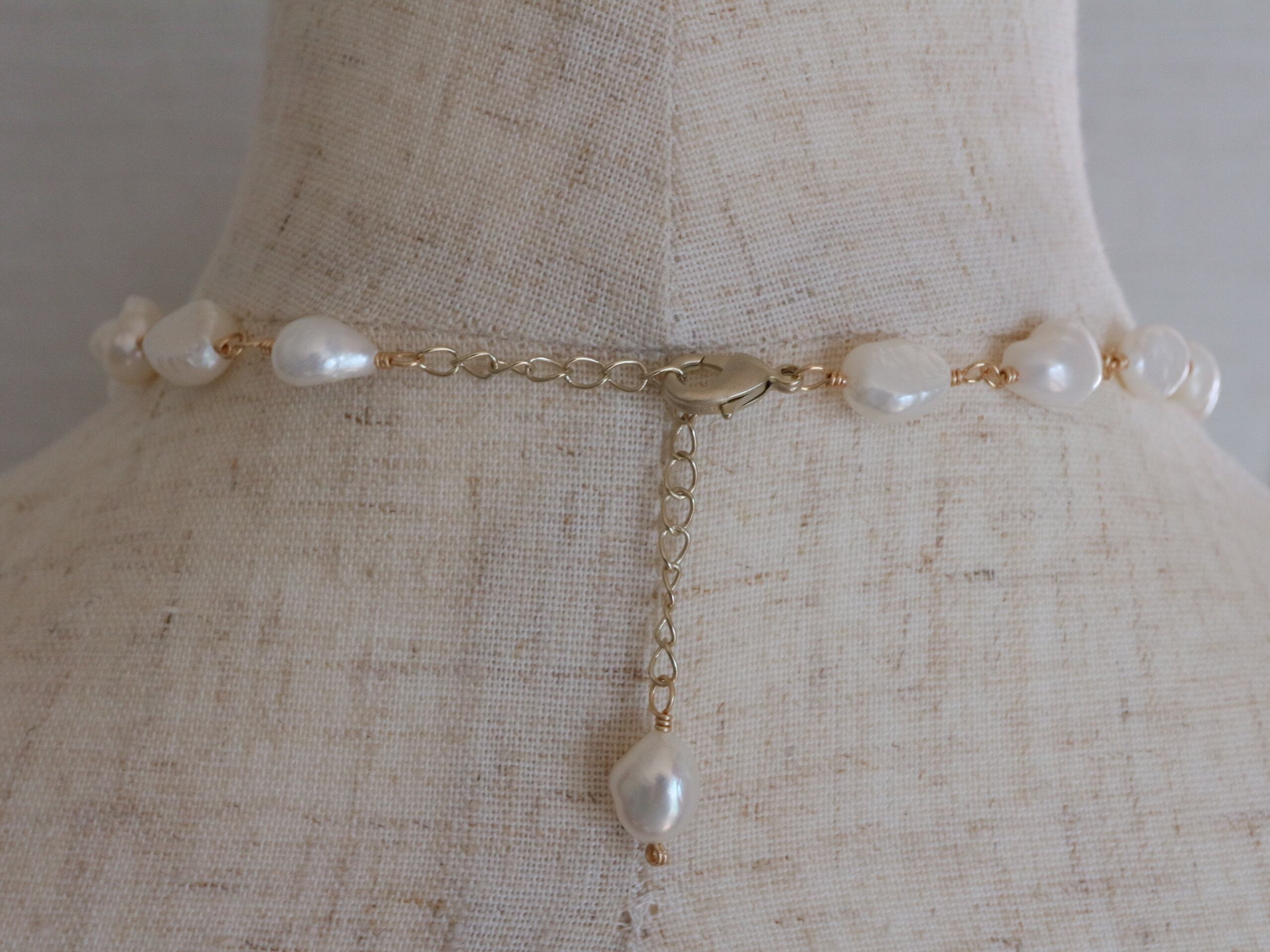 使用したバロックパールは、ツヤが素晴らしく、天然の淡水パール特有のいろいろな白色を楽しんでいただける上質のものです。ぷっくりと厚みがあり、ひとつひとつ形がさまざまで表情豊かです。形のバリエーションを楽しいネックレスに仕上がっております。