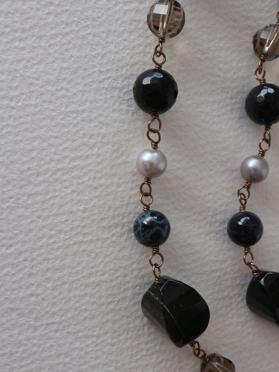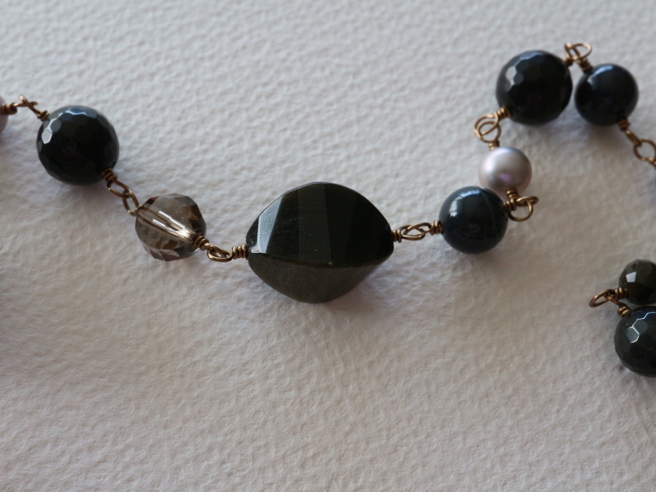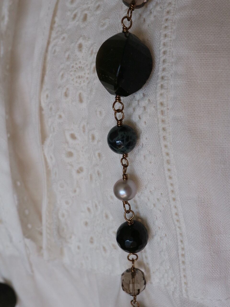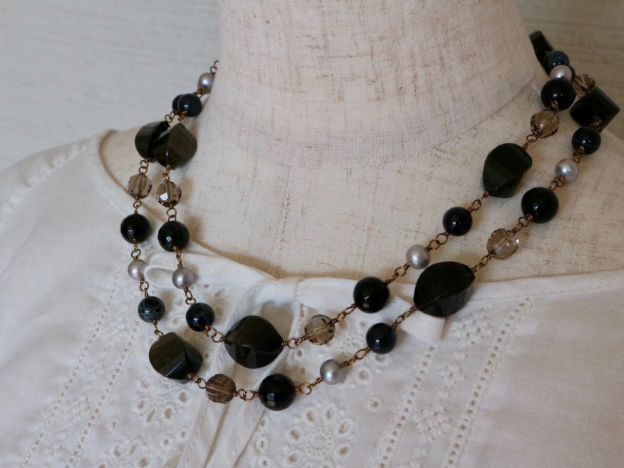3種類の黒曜石(オブシディアン)、スモーキークオーツ、パールなどで作った、ブラック系のロングネックレスです。いずれの天然石とも、カッティング・形・色味などこだわりの高品質のものです。