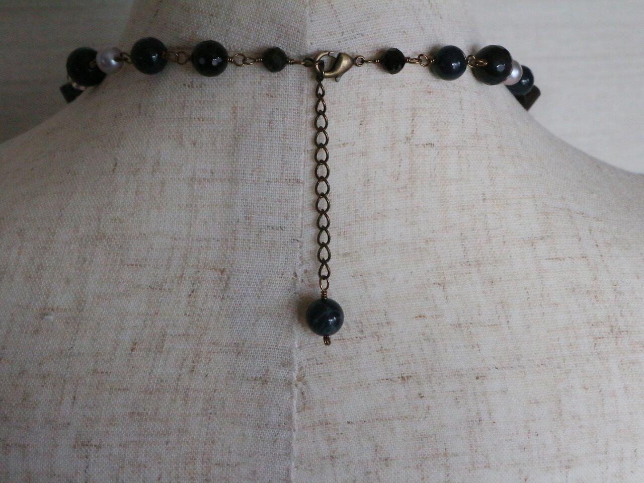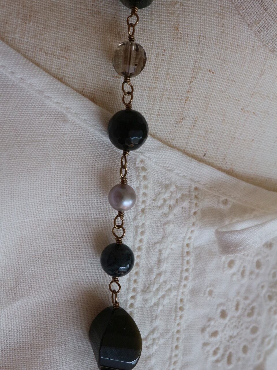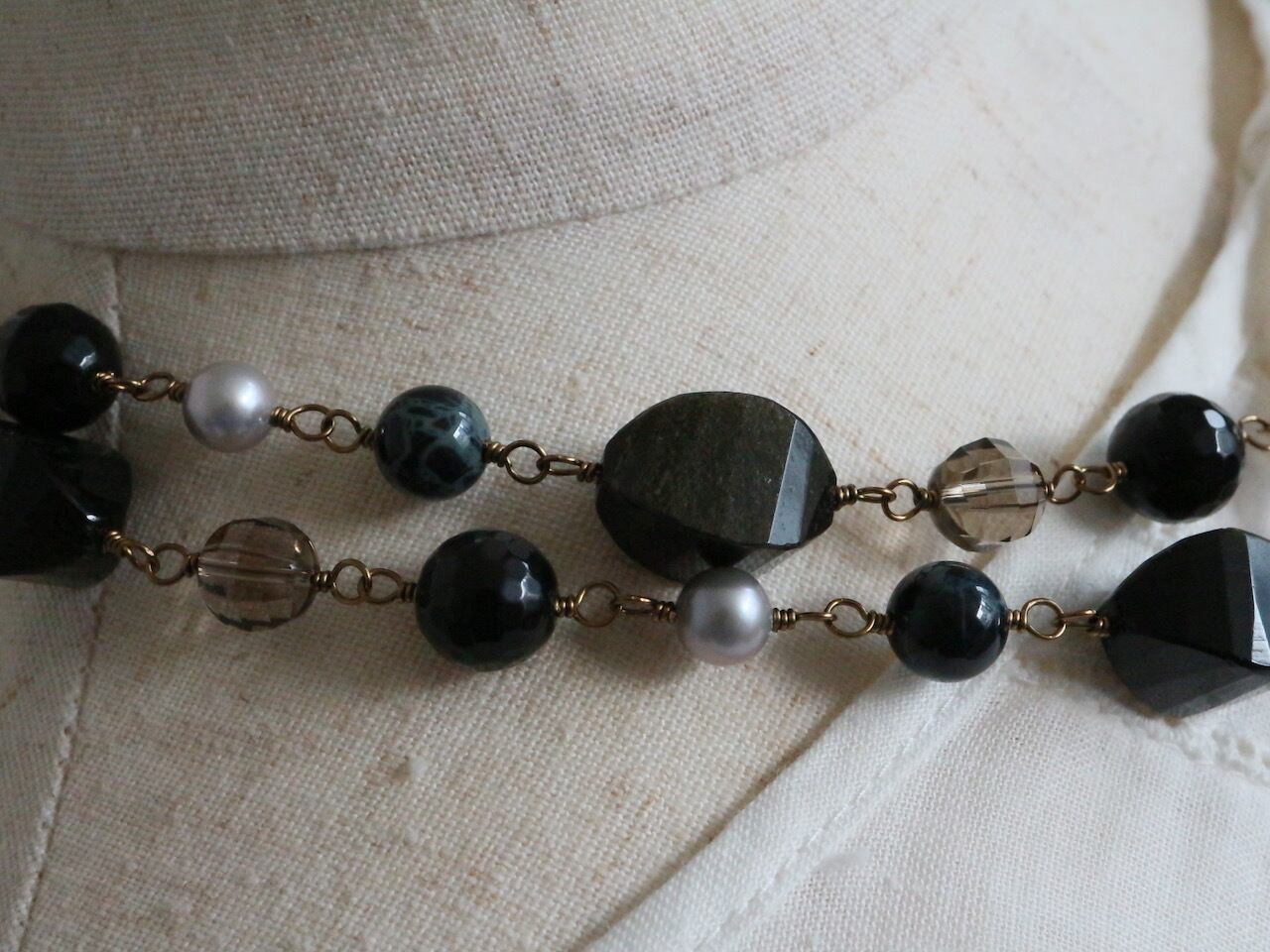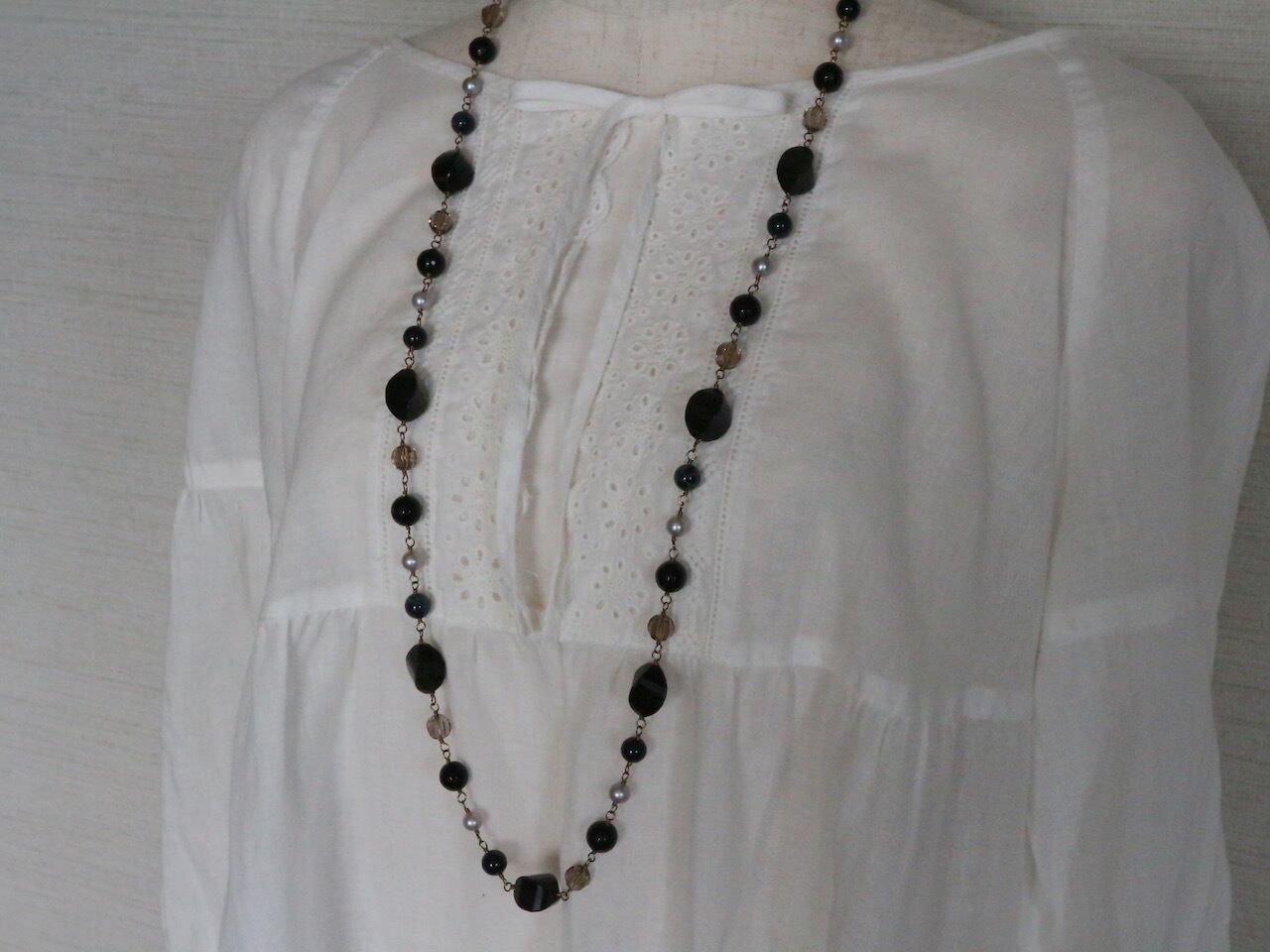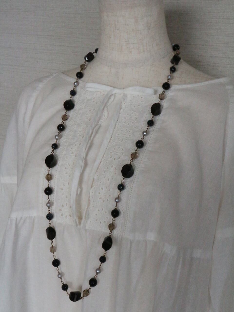3種類の黒曜石(オブシディアン)、スモーキークオーツ、パールなどで作った、ブラック系のロングネックレスです。いずれの天然石とも、カッティング・形・色味などこだわりの高品質のものです。