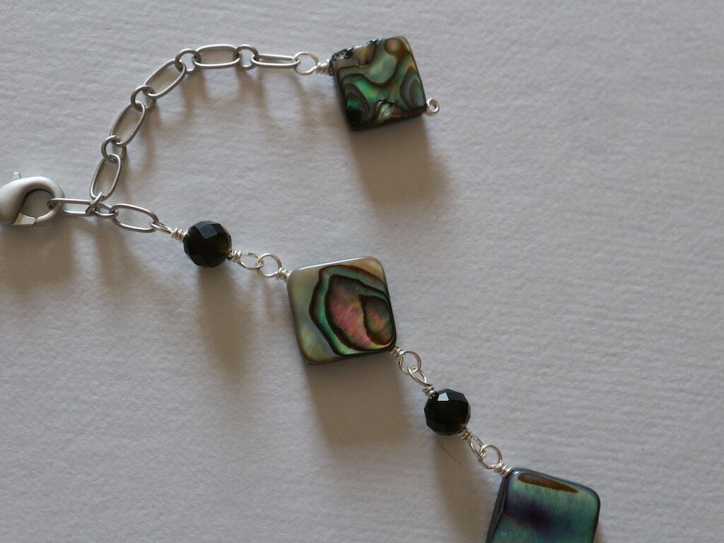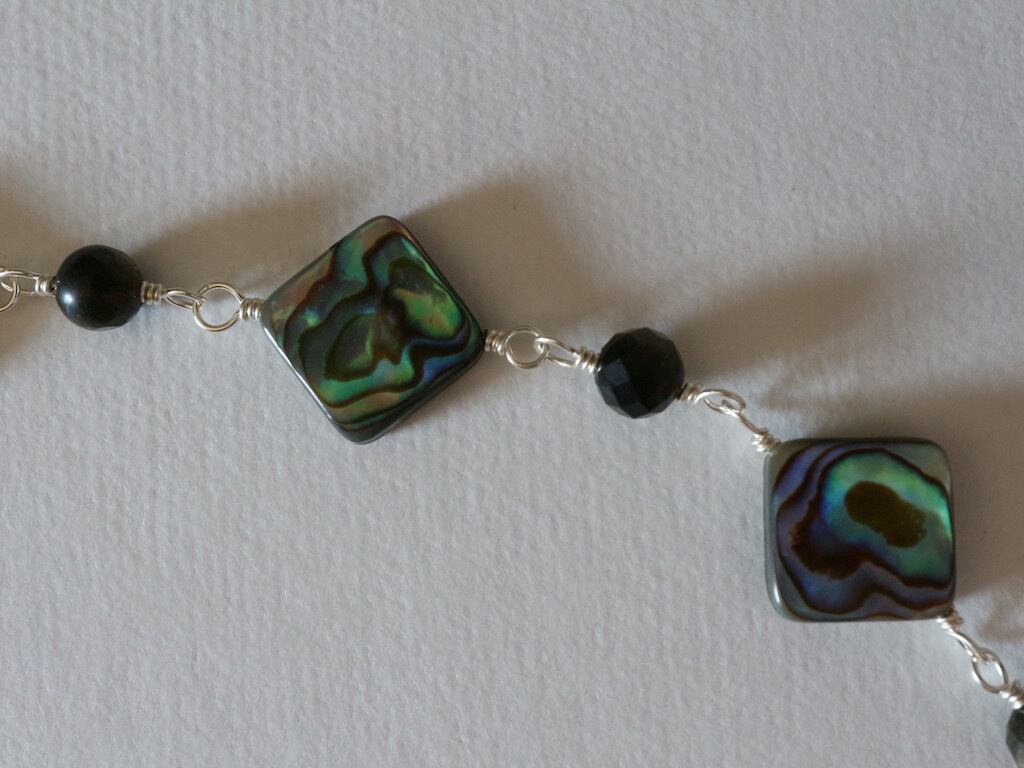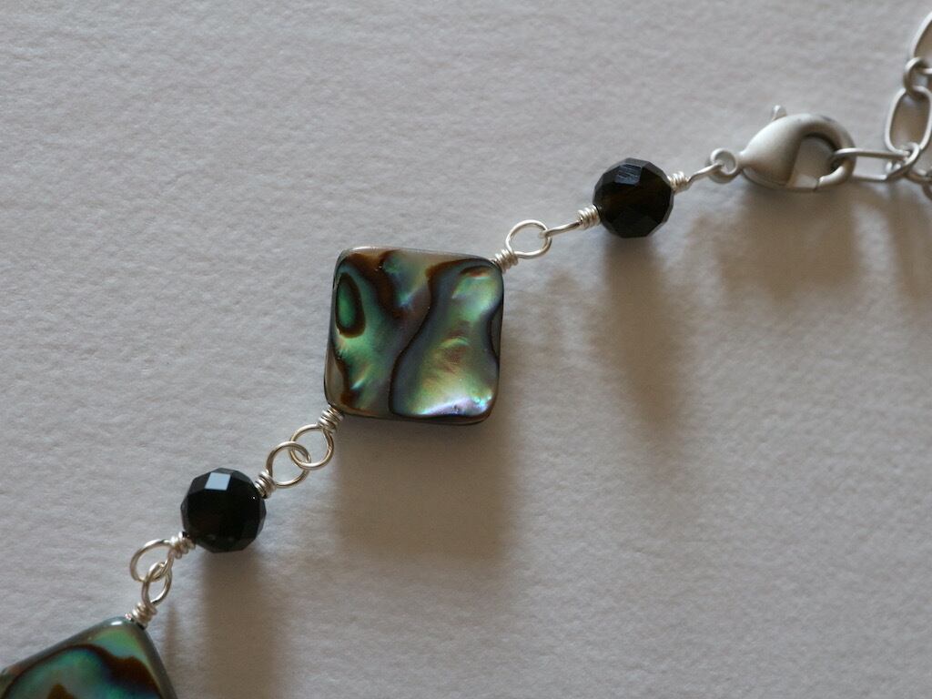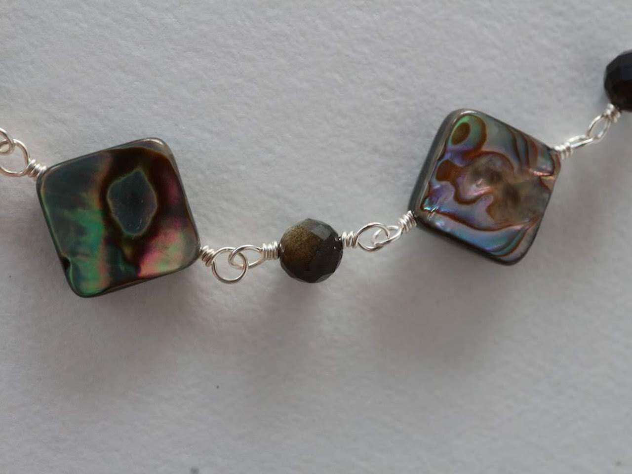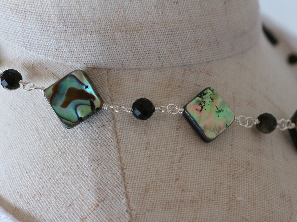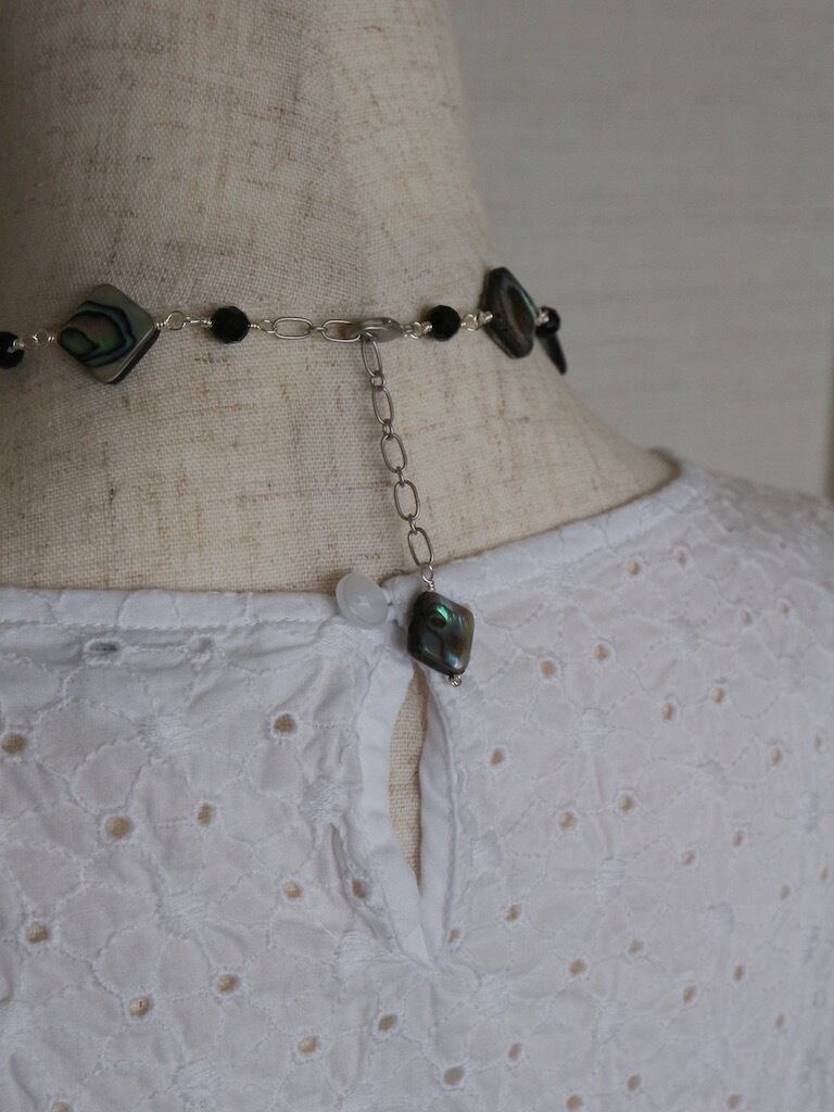 特有の虹色の照りが美しいひし形のアバロンシェルと、丸形にカッティングされたゴールデンオブシディアン(黒曜石)を交互にワイヤーでつないで作ったショートネックレスです。