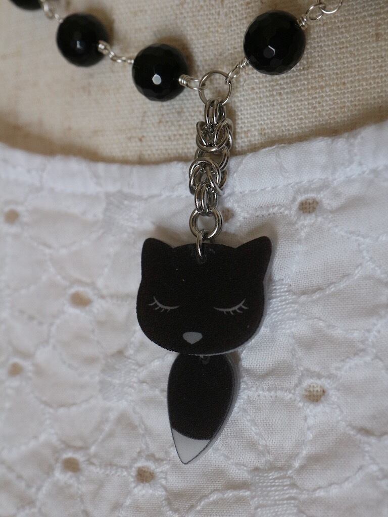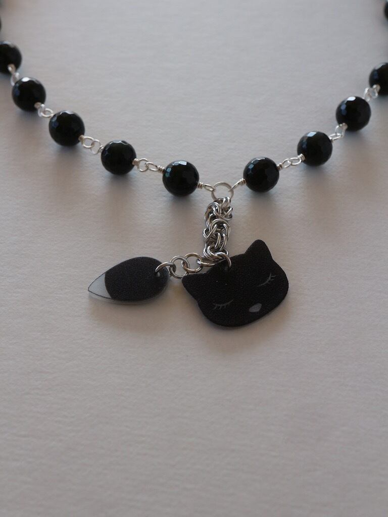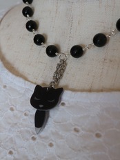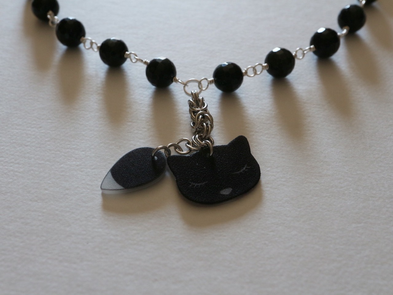 この黒猫パーツは、マルカンを組んでオブシディアンのネックレスにつなげています。