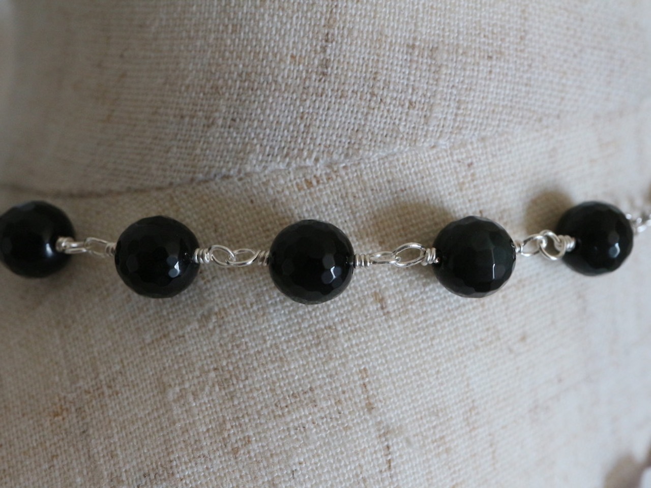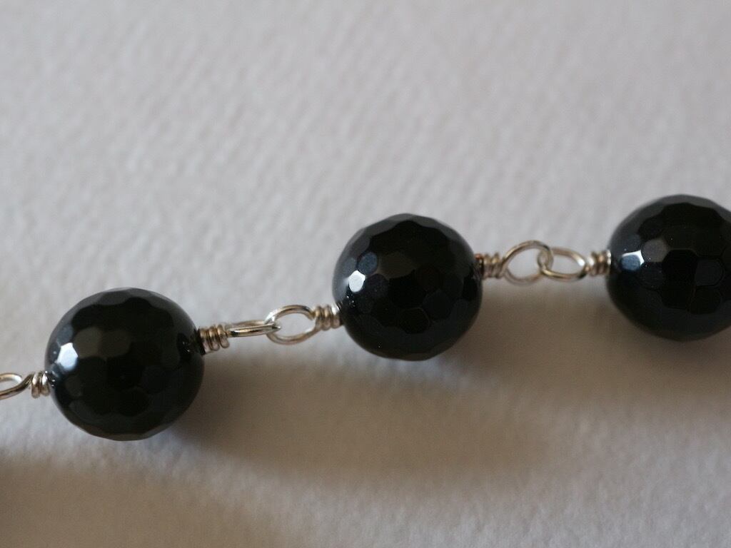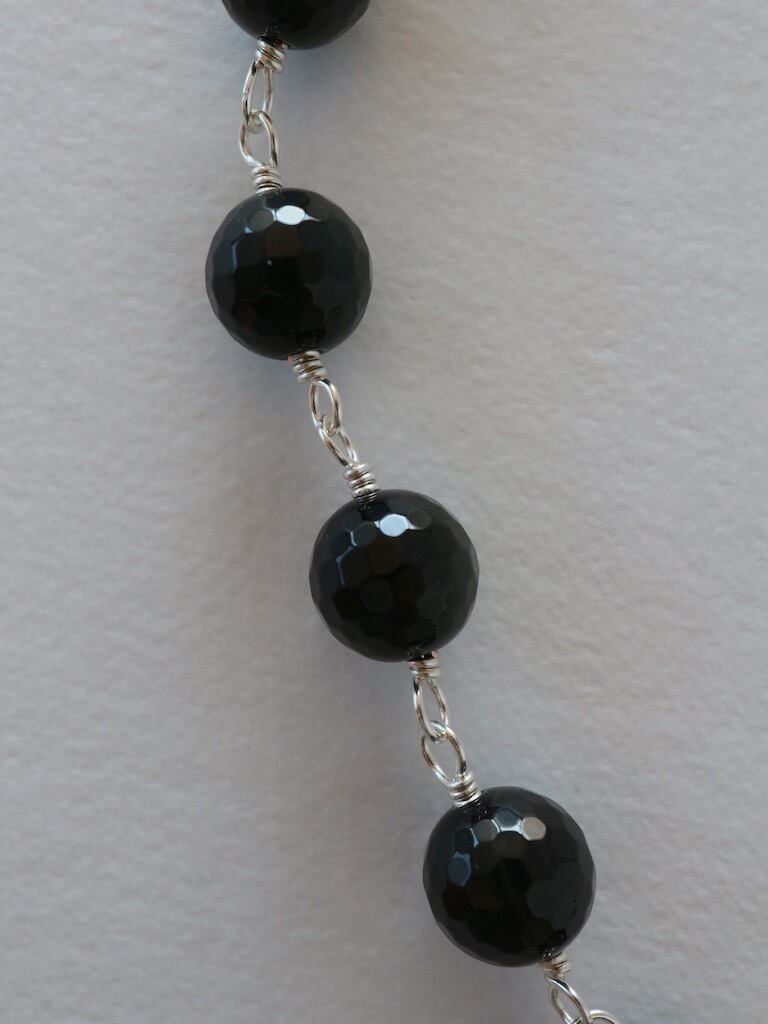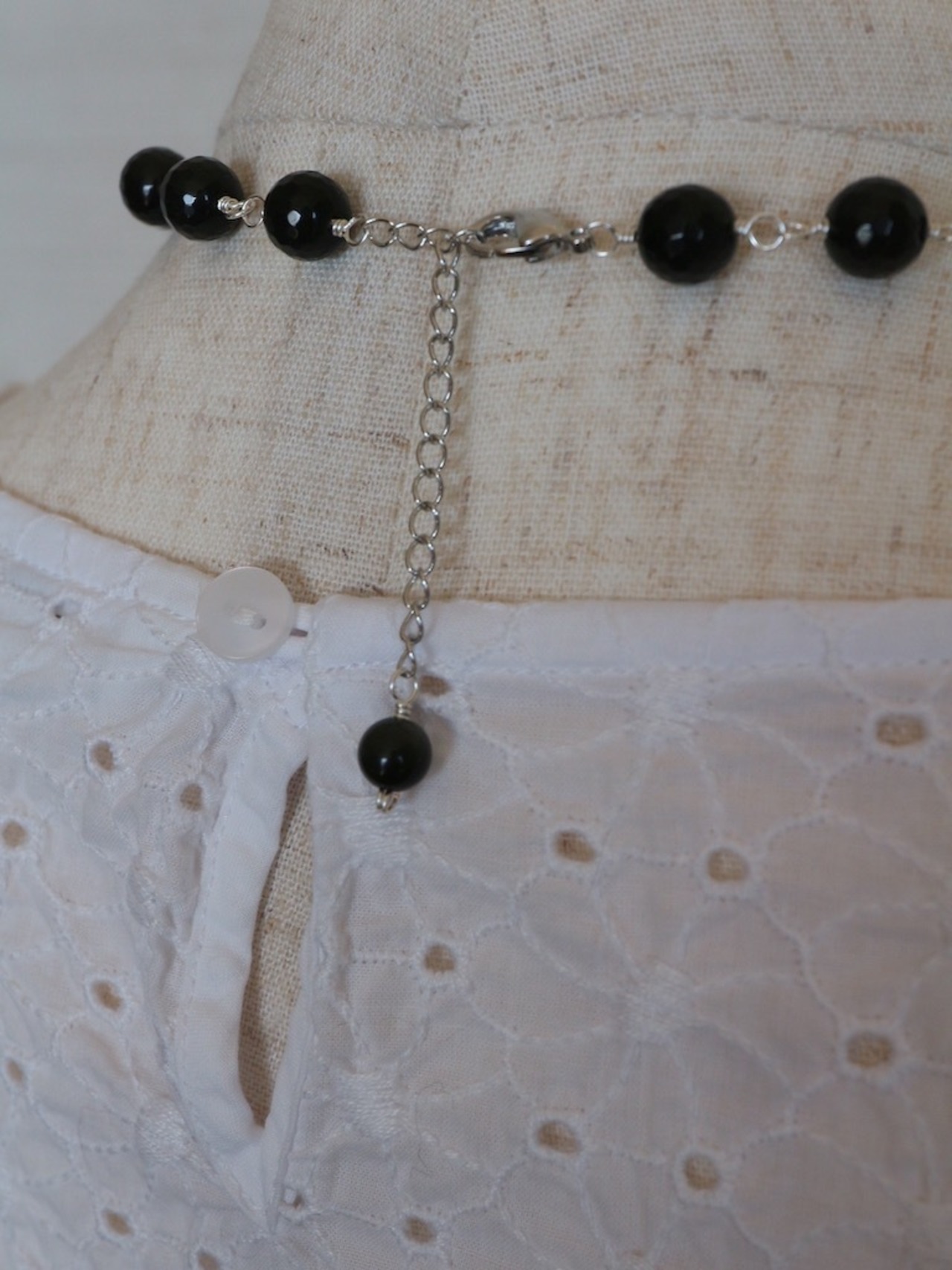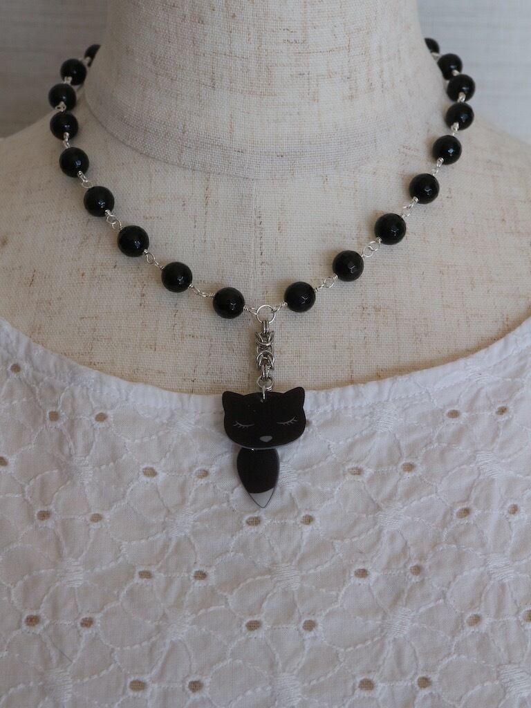 漆黒色のオブシディアンがシックな雰囲気ながら、黒猫の顔としっぽが可愛さを演出しております。全長約41センチですが、5センチのアジャスター付きなので、夏は短めにつけたり秋から冬にかけてはハイネックの上から長く着けたりなど、いろいろな洋服に合わせて楽しめそうですね。
