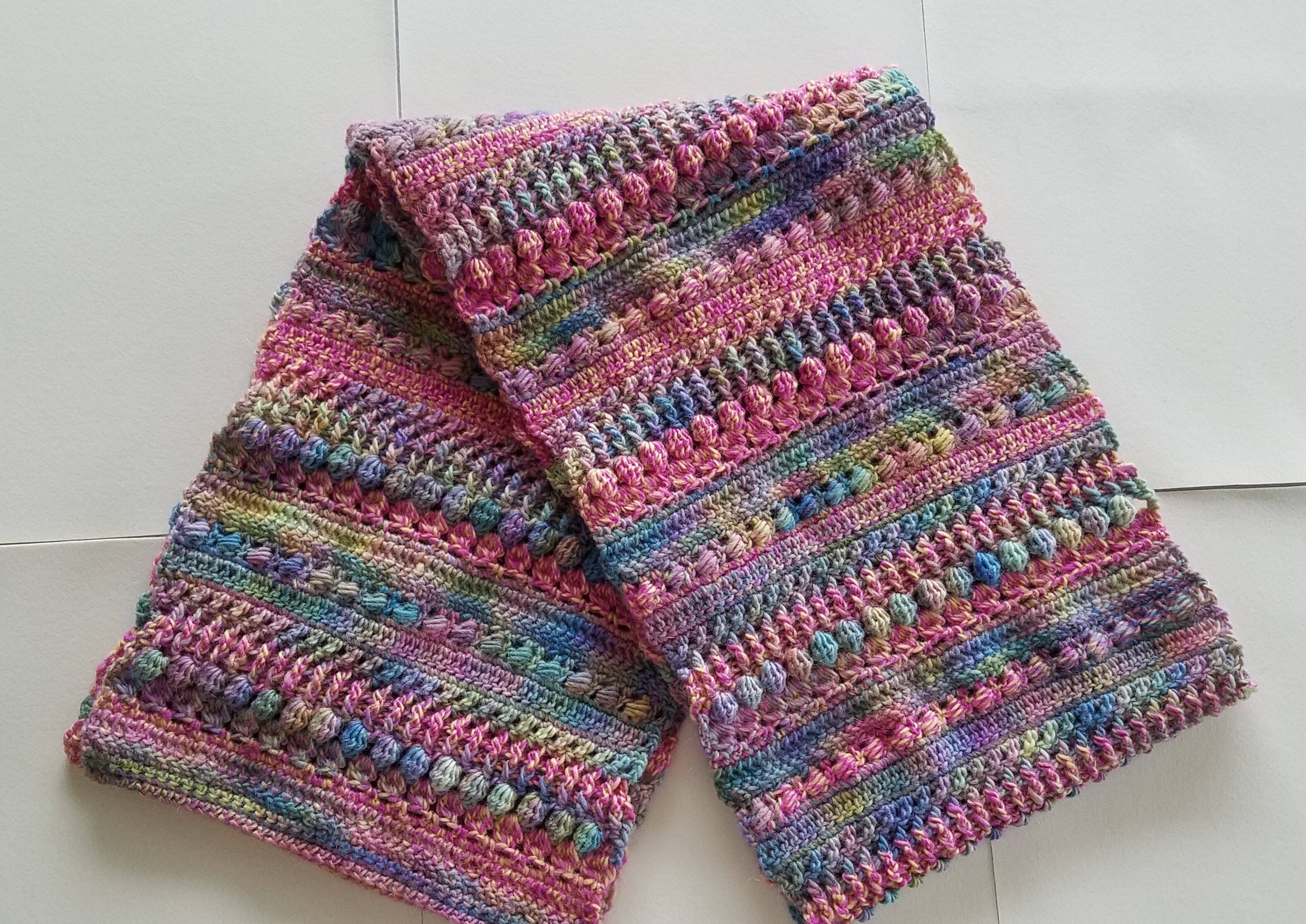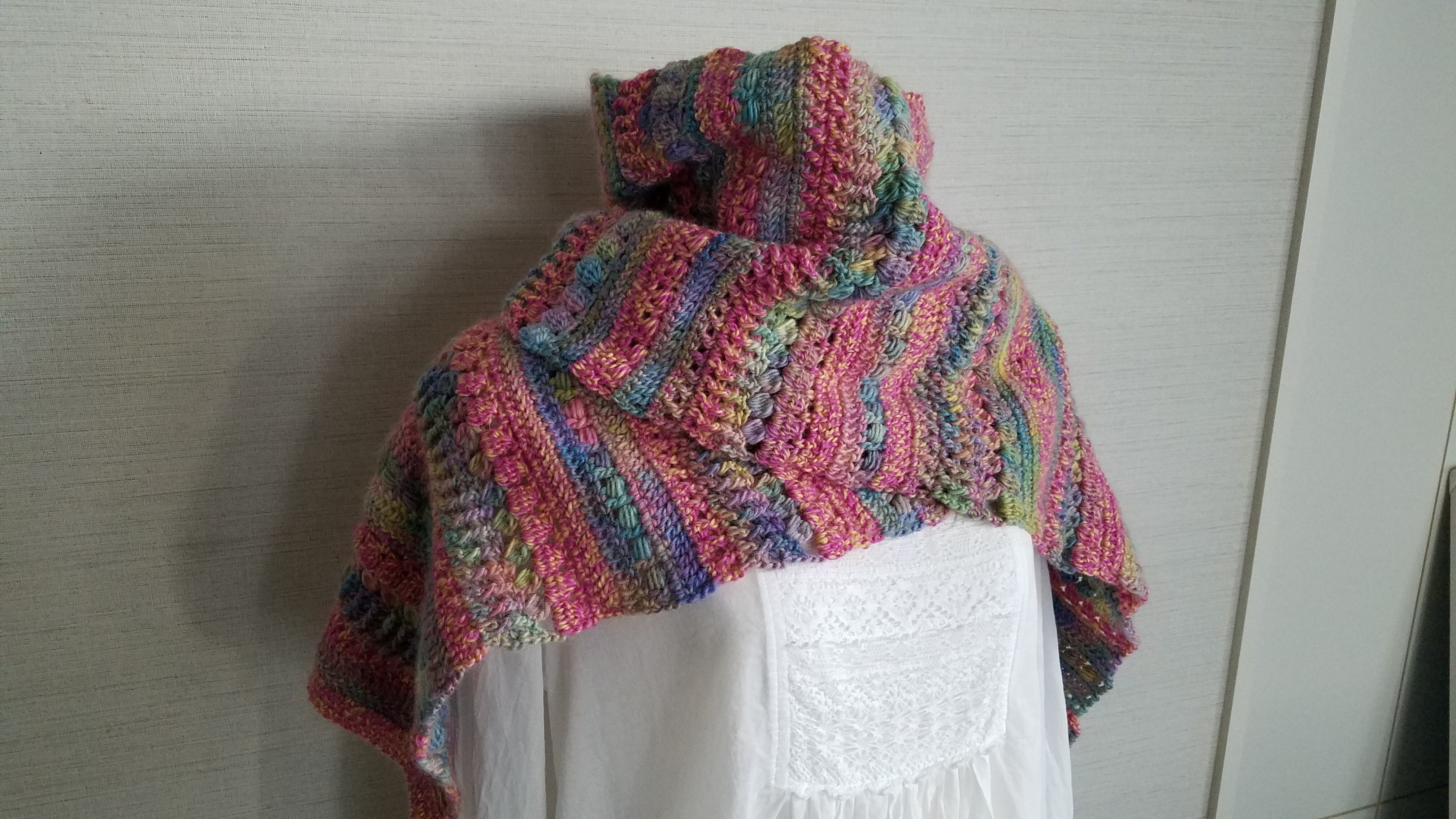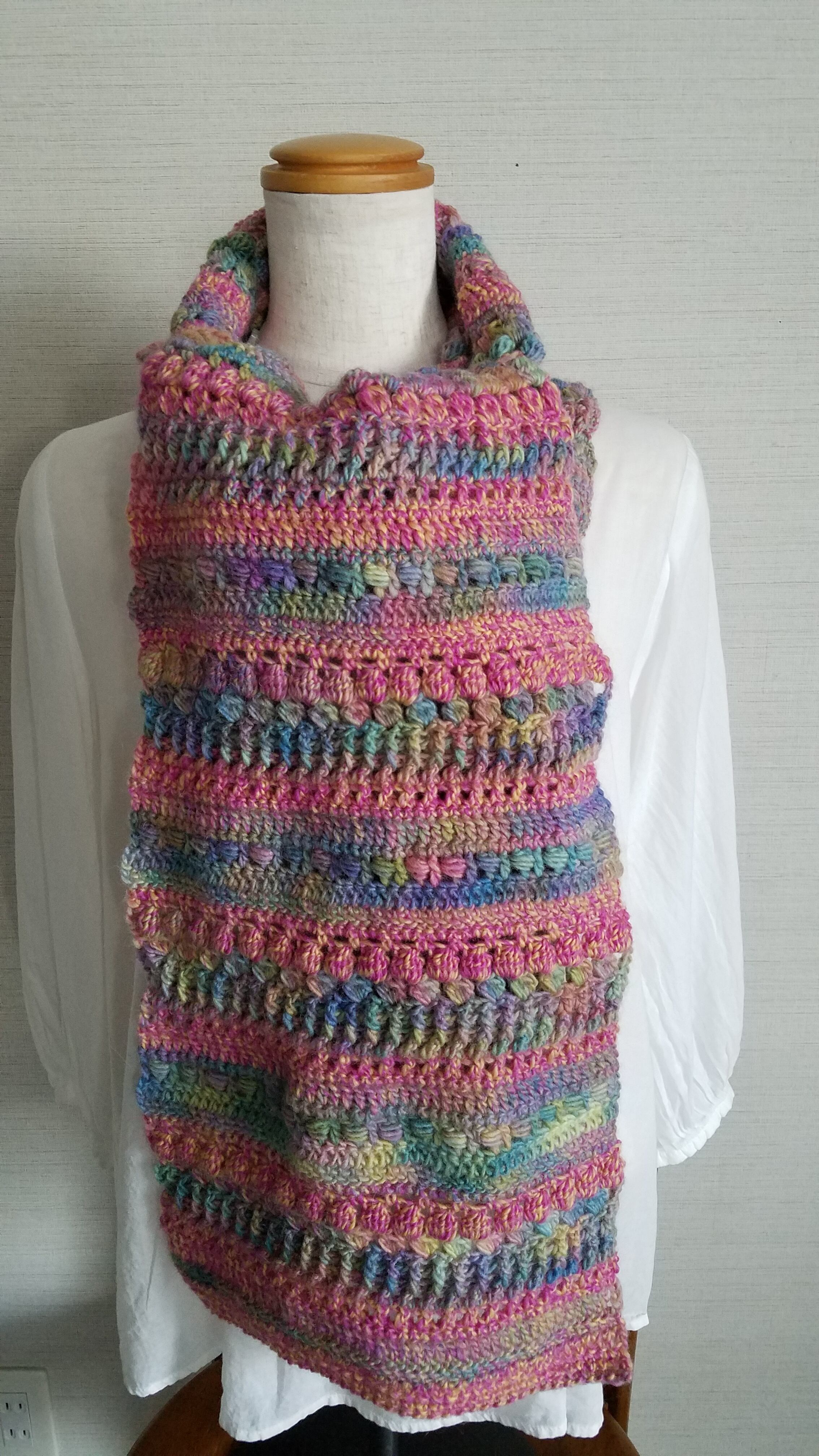 グラデーションが美しいピンク系の毛糸で編んだ手編みのマフラーです。