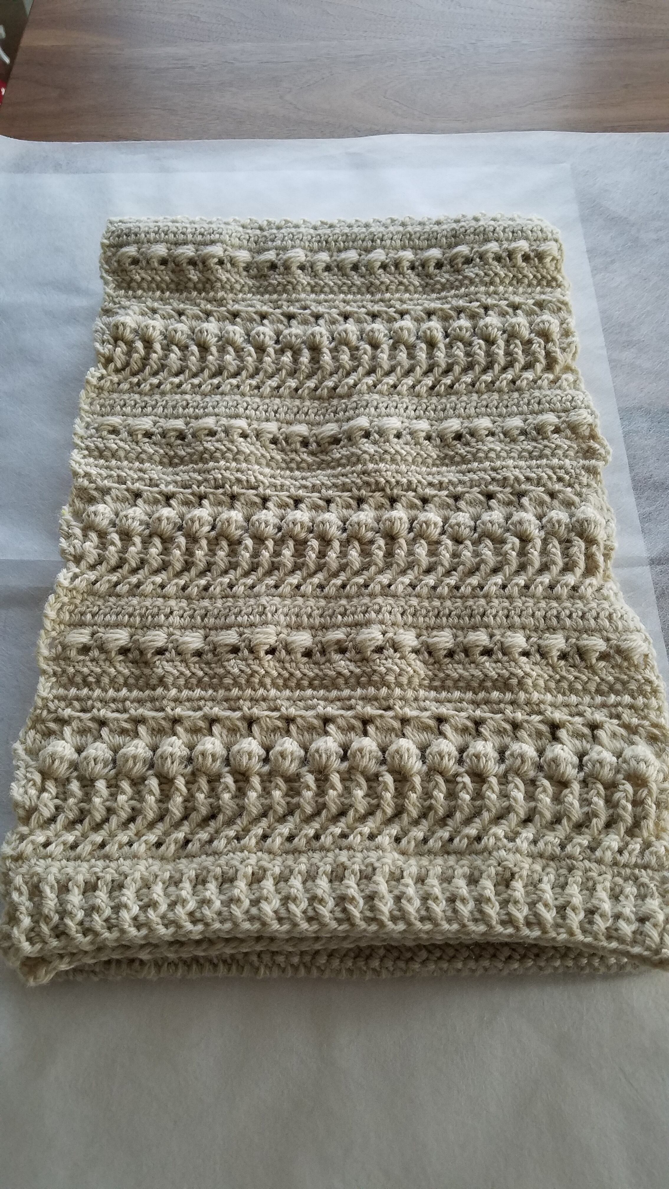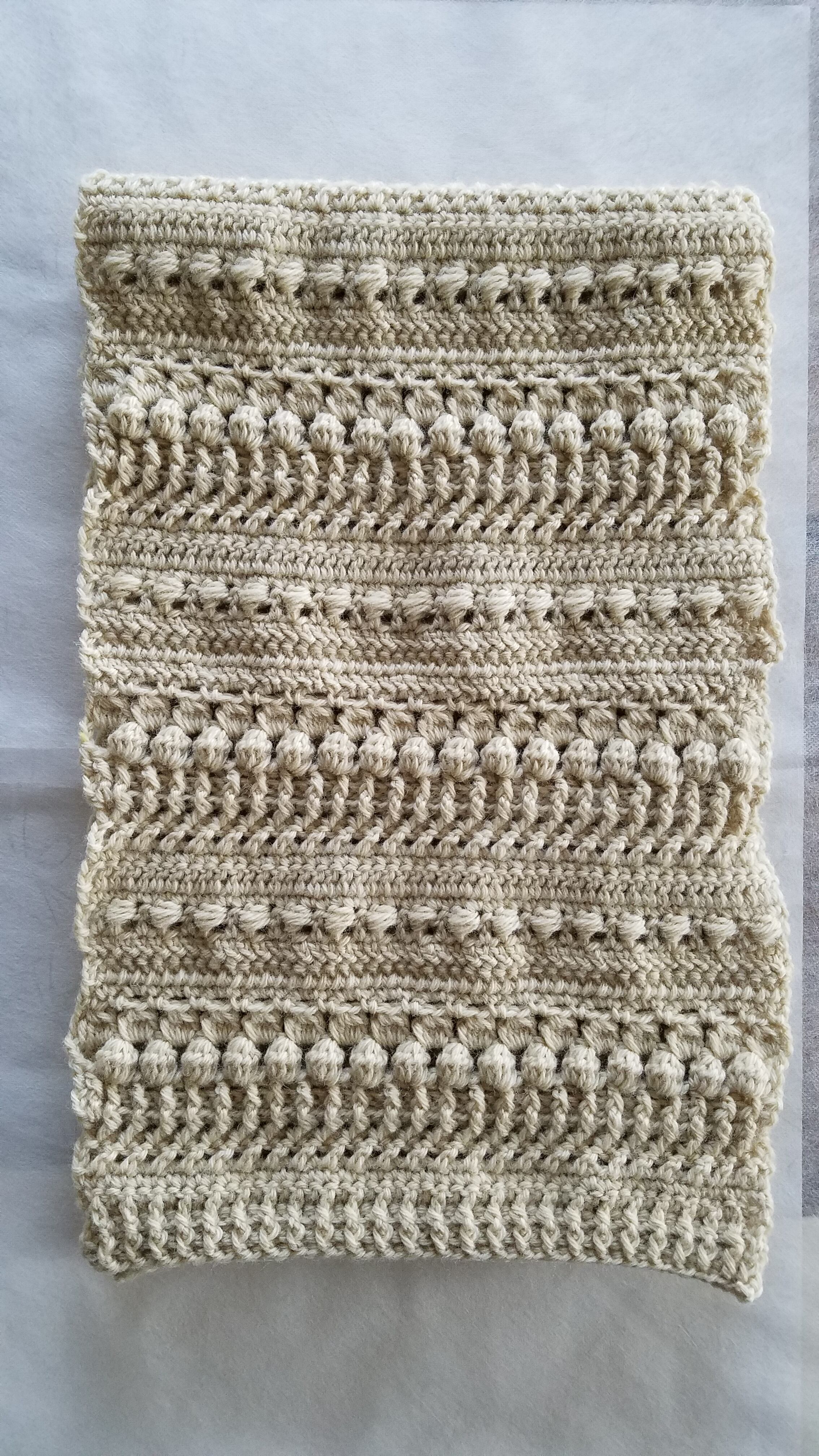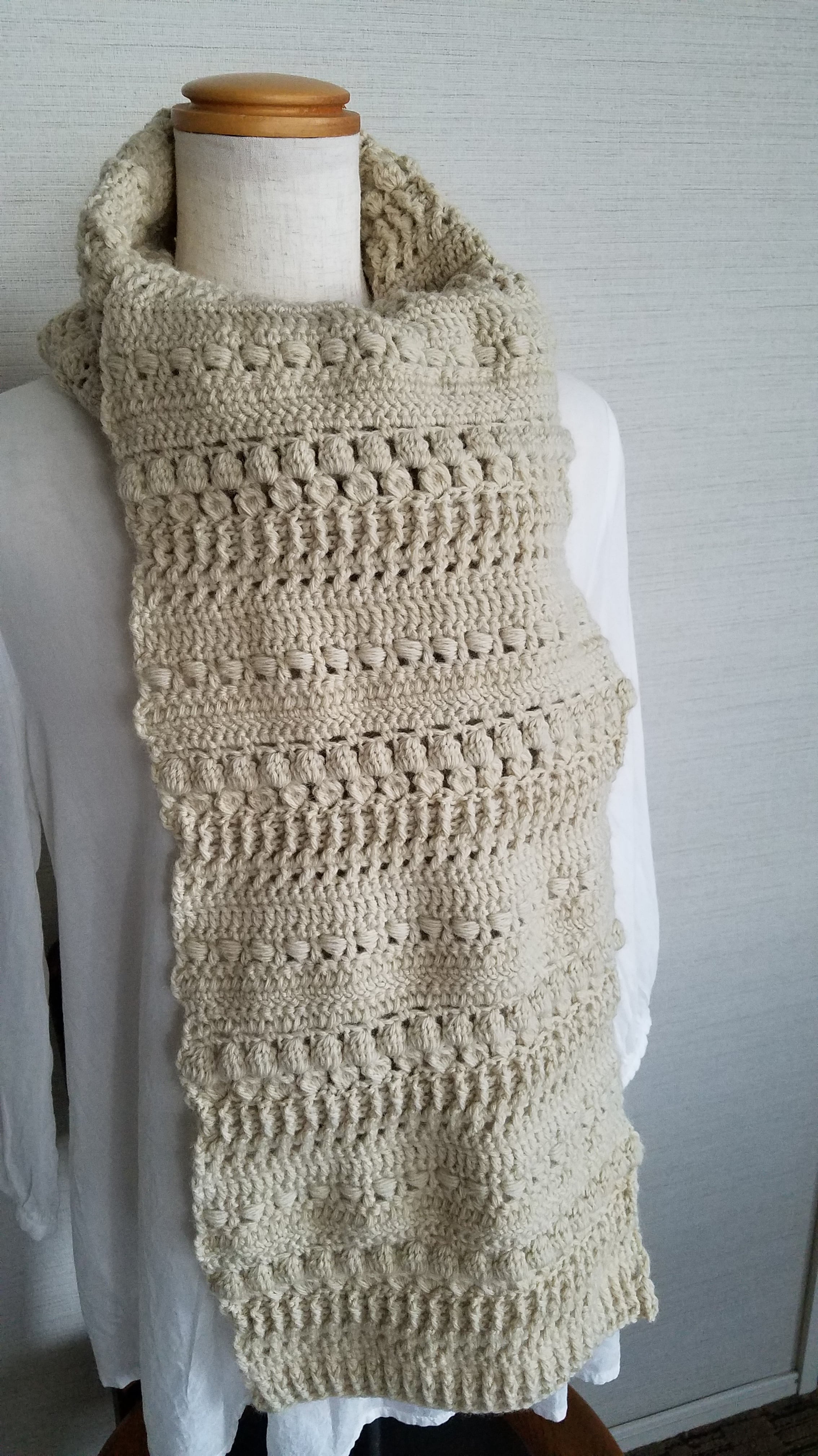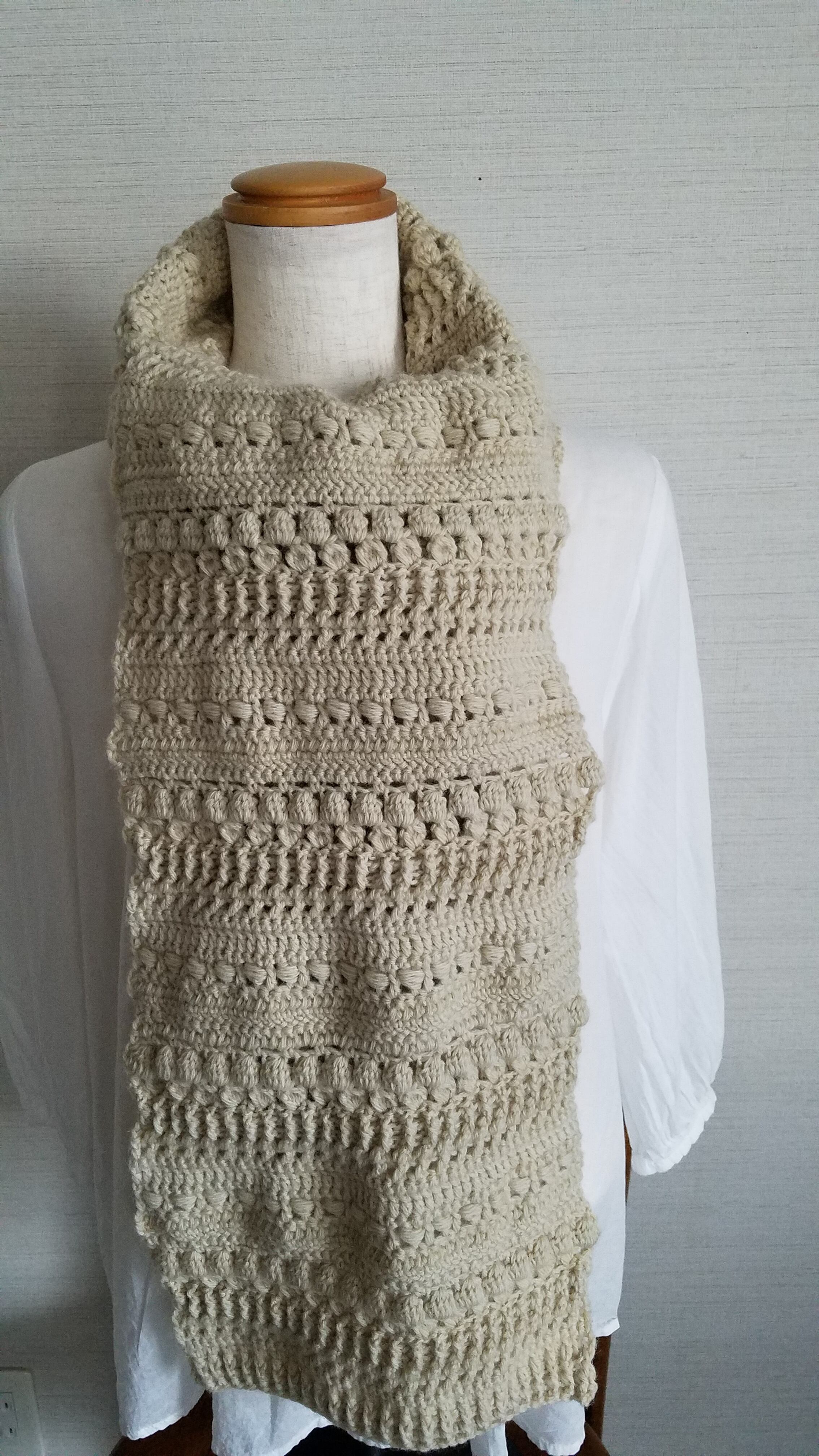 クリーム色(生成色)のメリノウールで編んだ手編みのマフラーです。