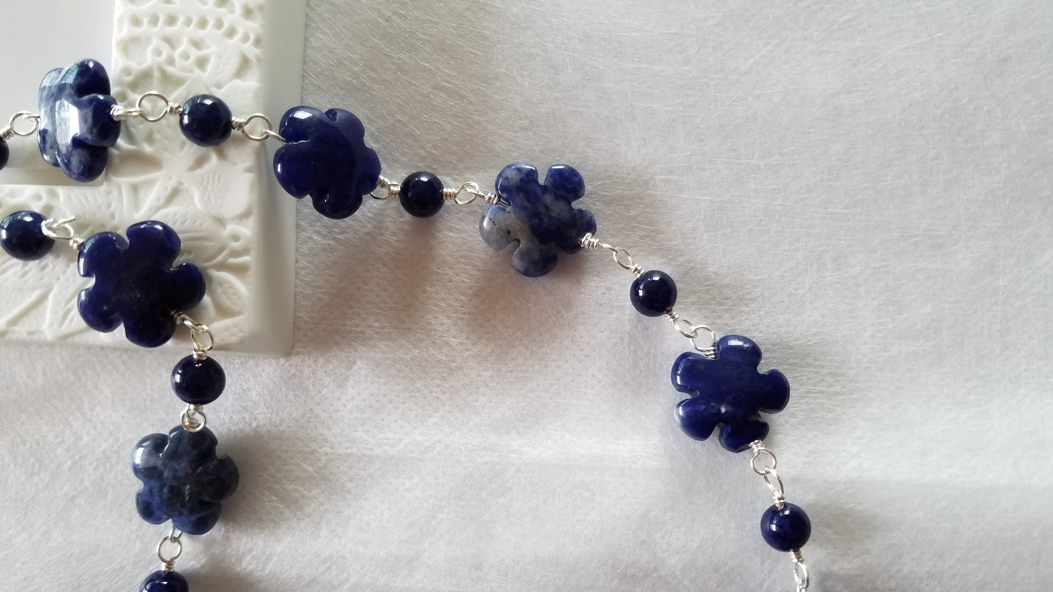 メインに使用した花形ソーダライトは、約15ミリの5枚花の形に美しくカッティングされたものです。