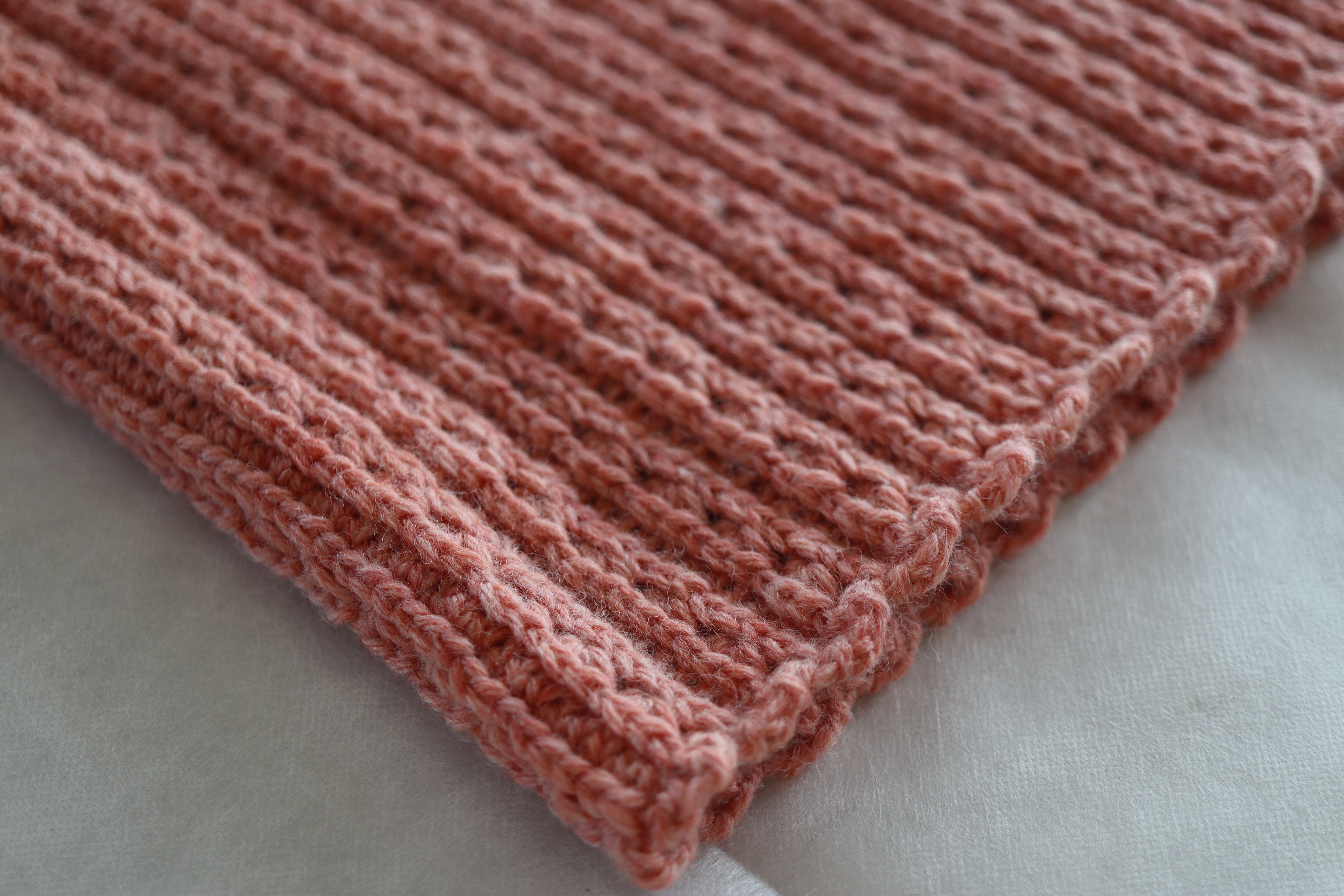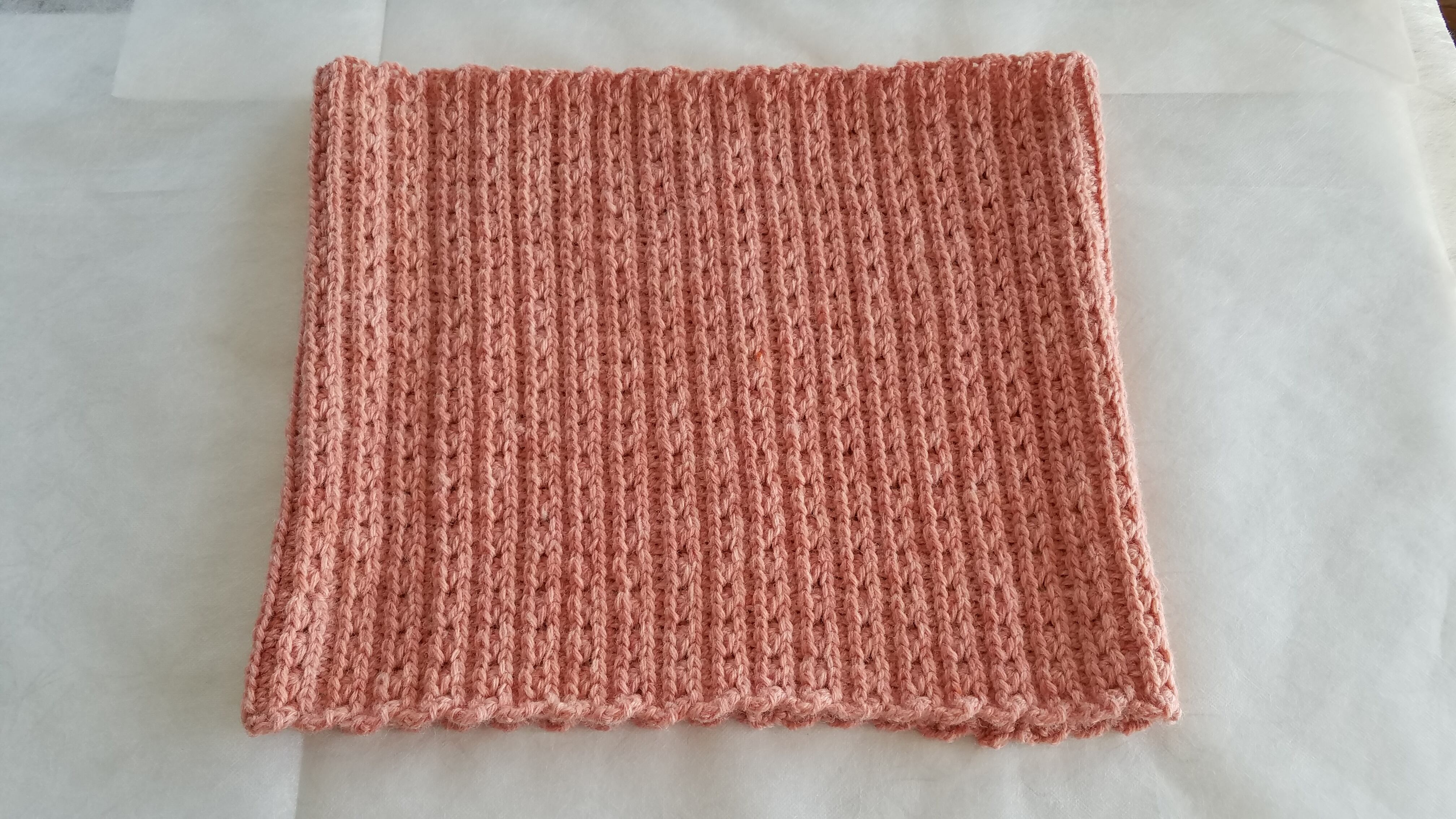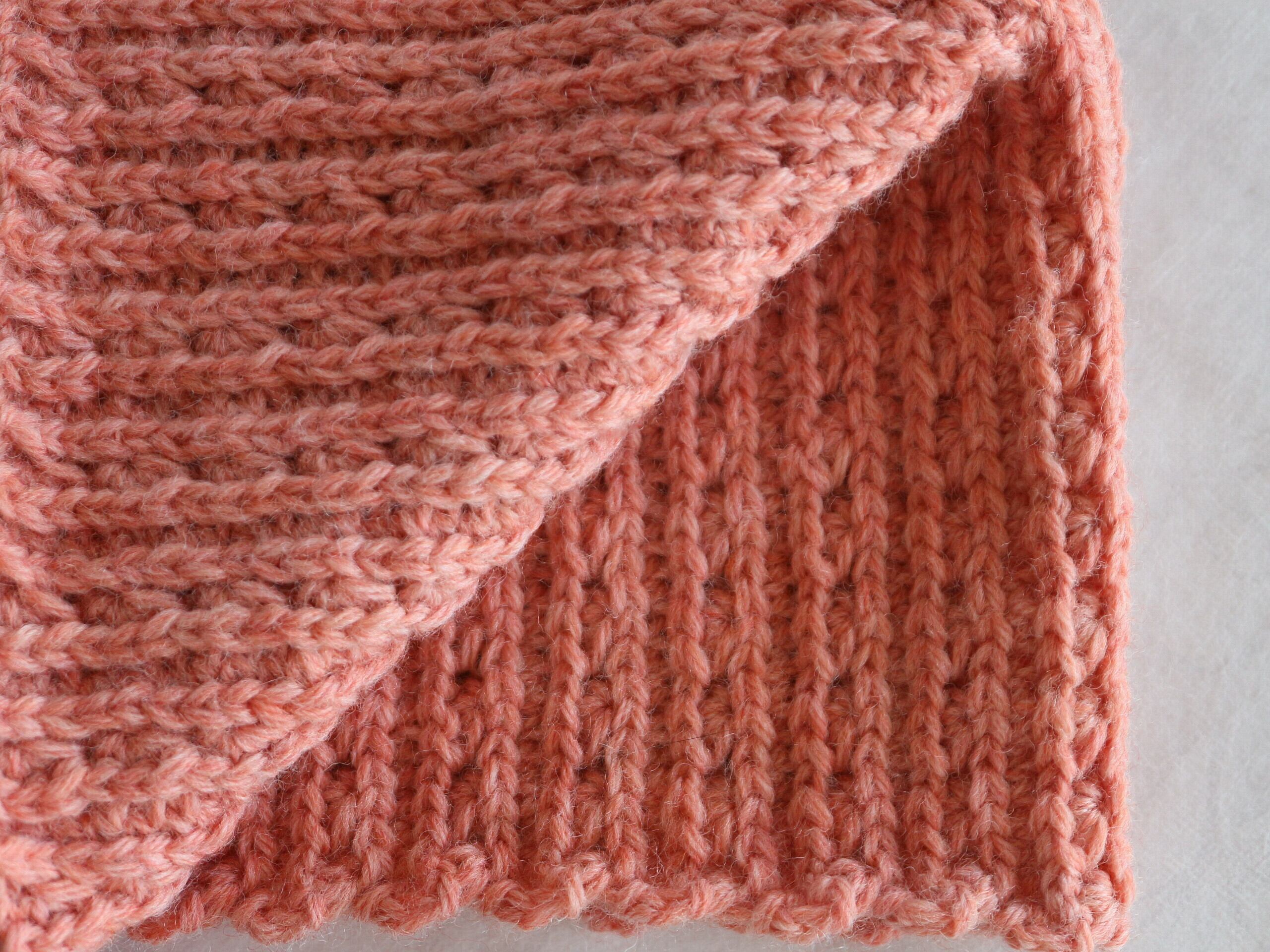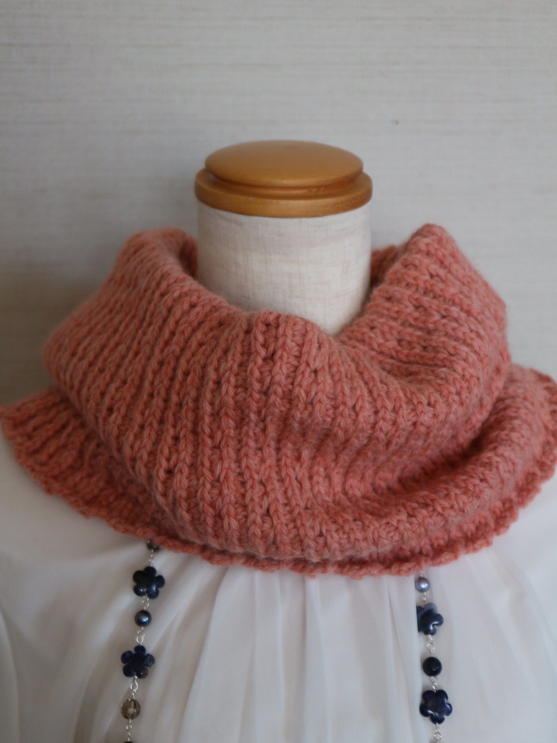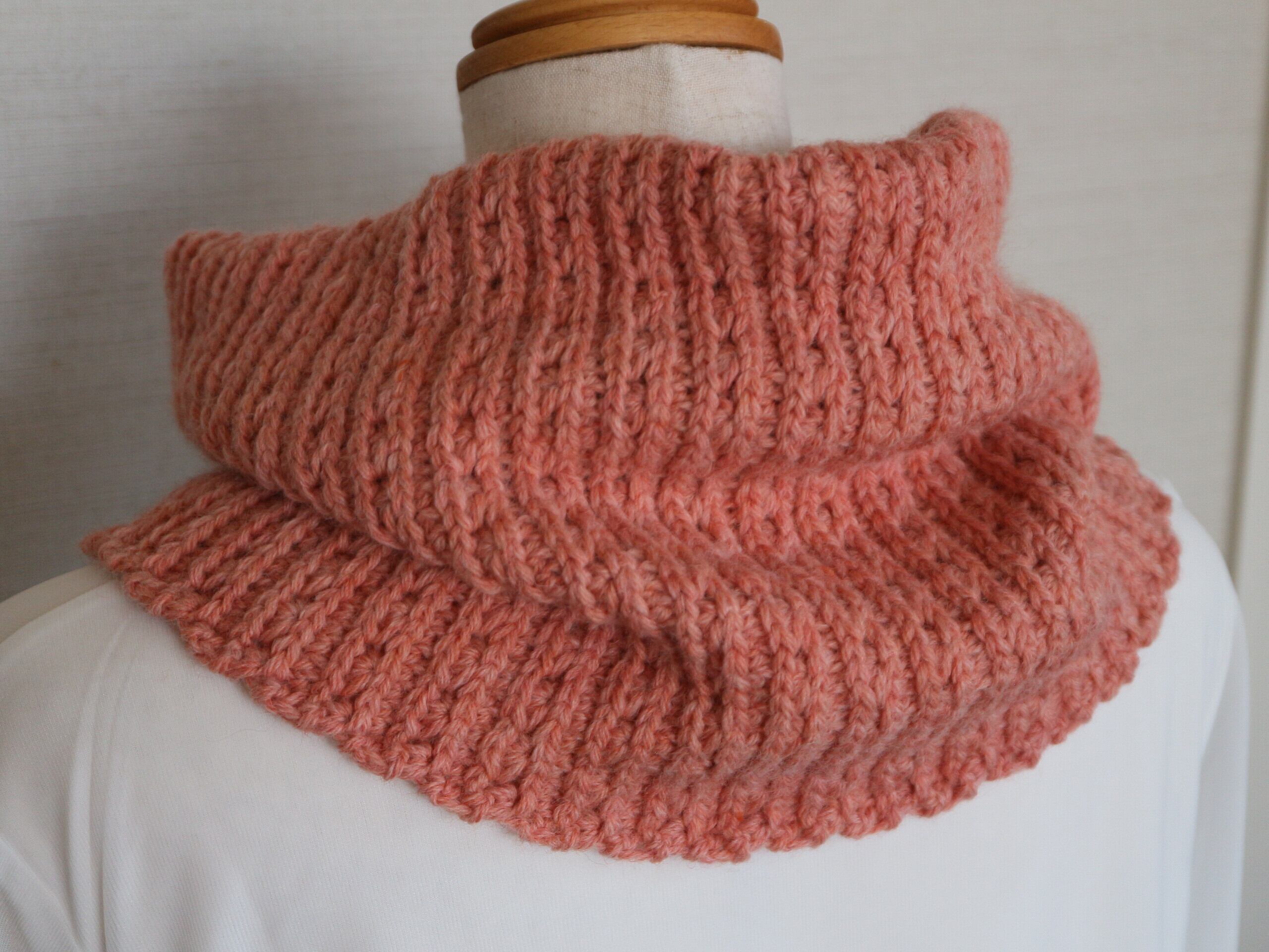 幅約31センチ、長さ約75センチの長方形に編んだものを筒状に仕上げたスヌード
