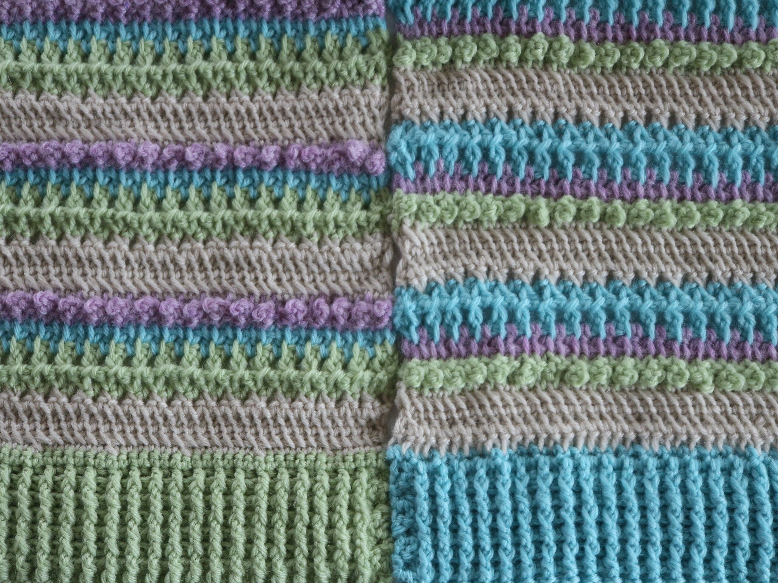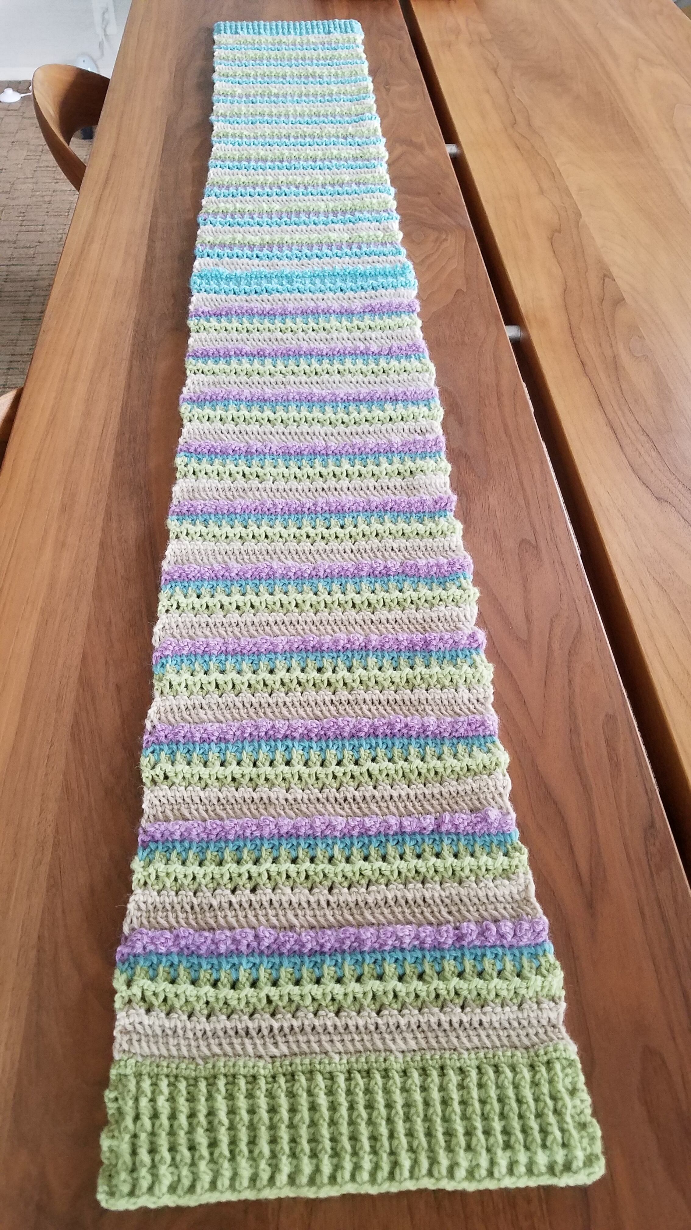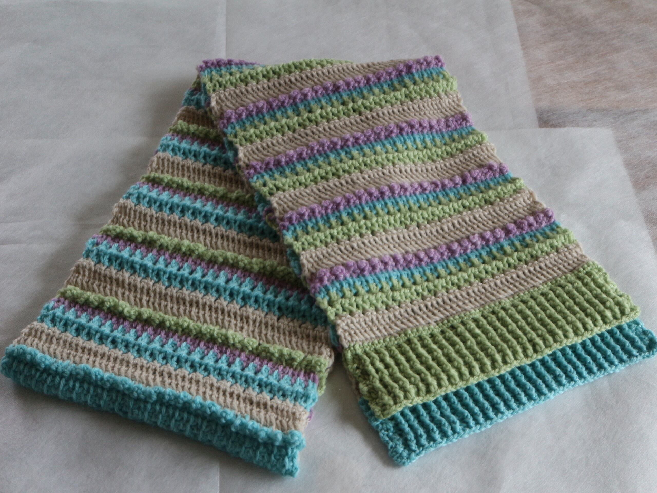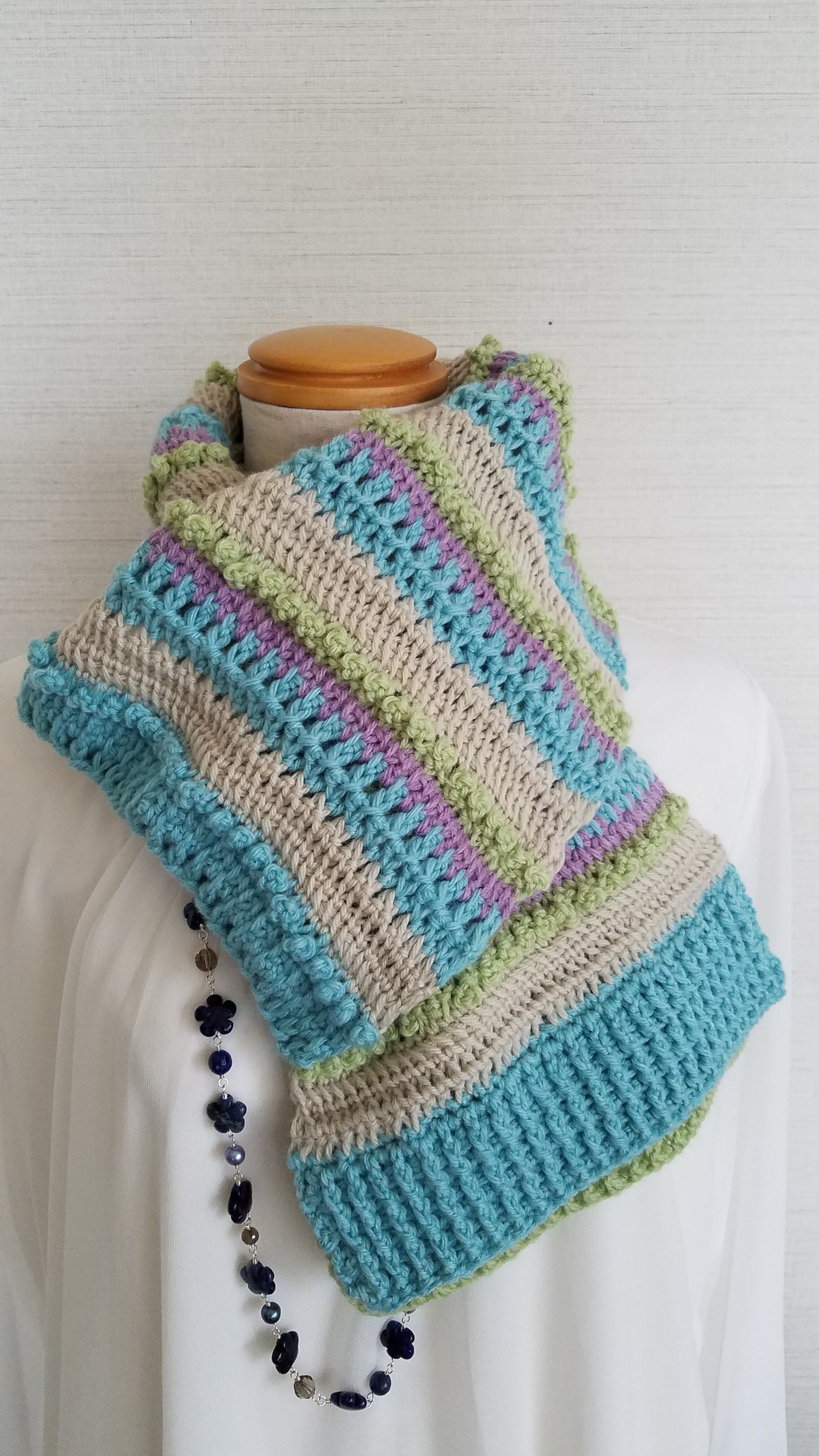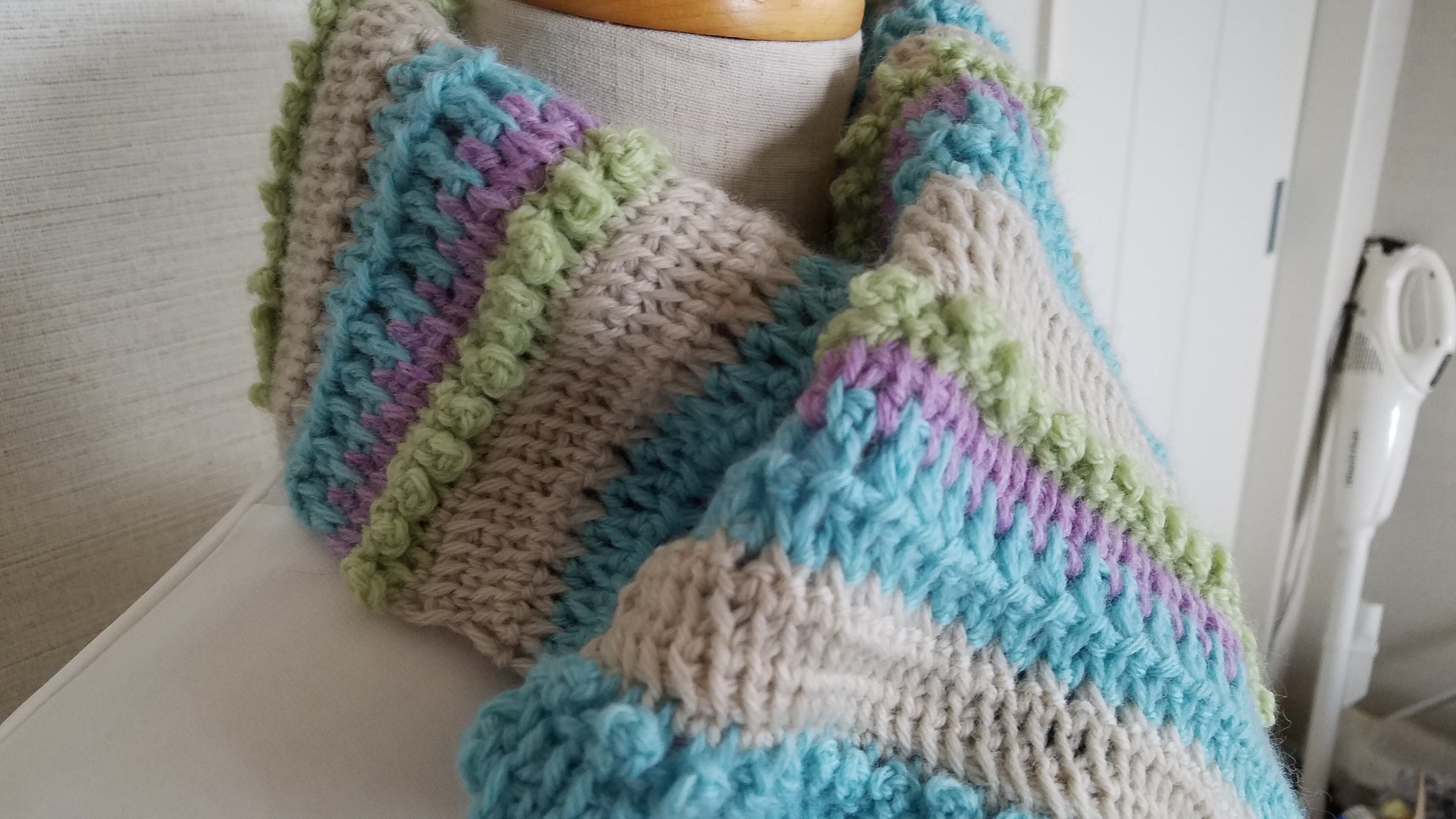使用したのはメリノウール100%の毛糸で、クリーム・緑・青・紫の4色を組み合わせて魔法の一本針の技法で編みました。