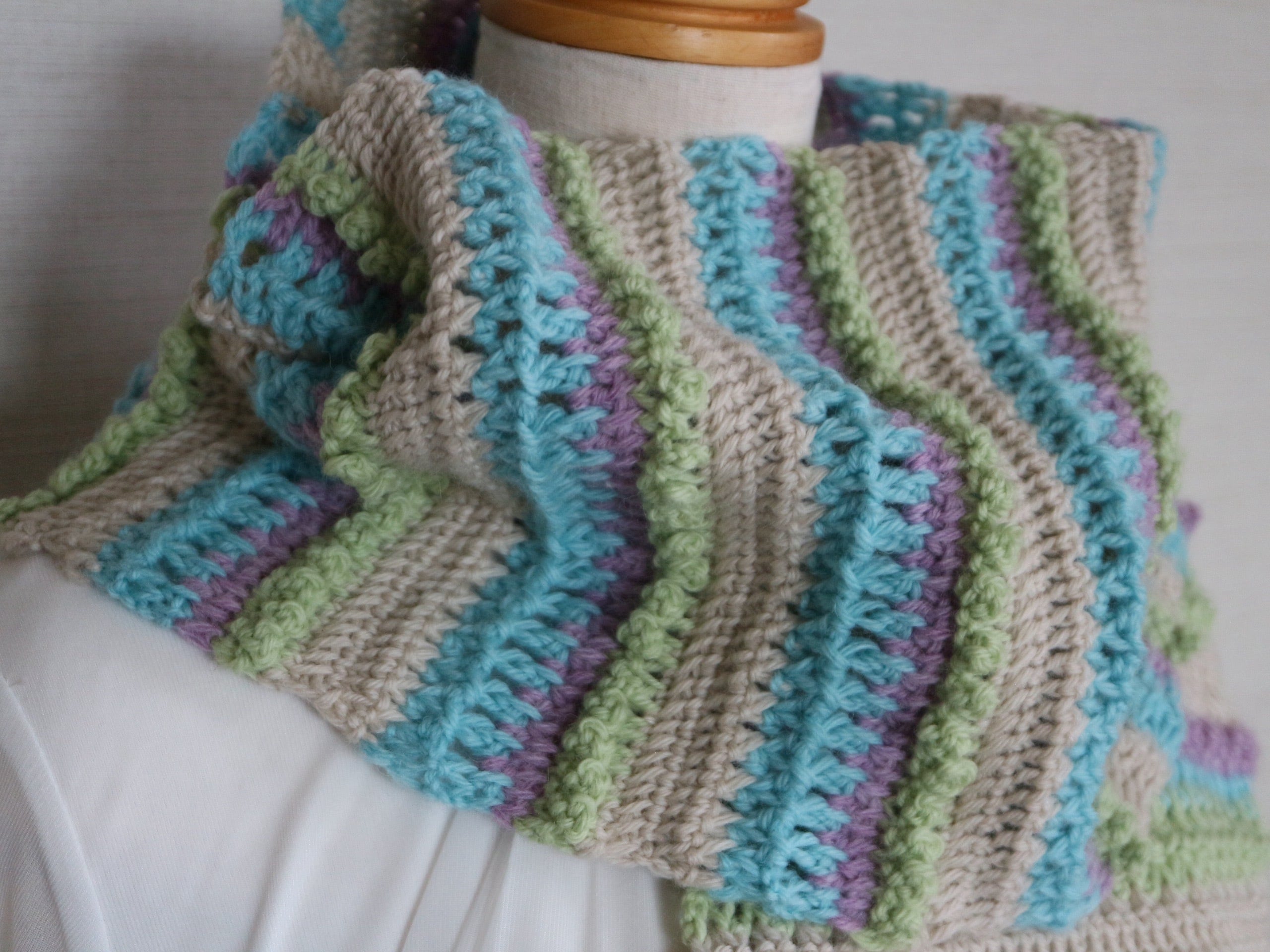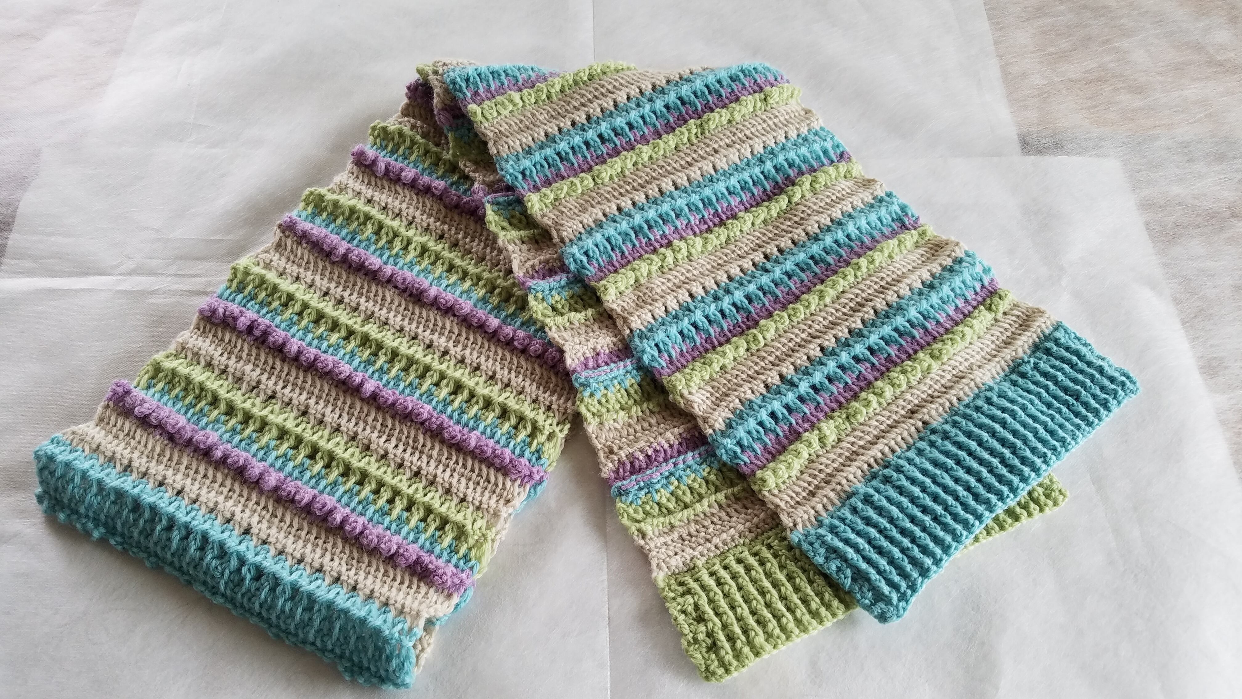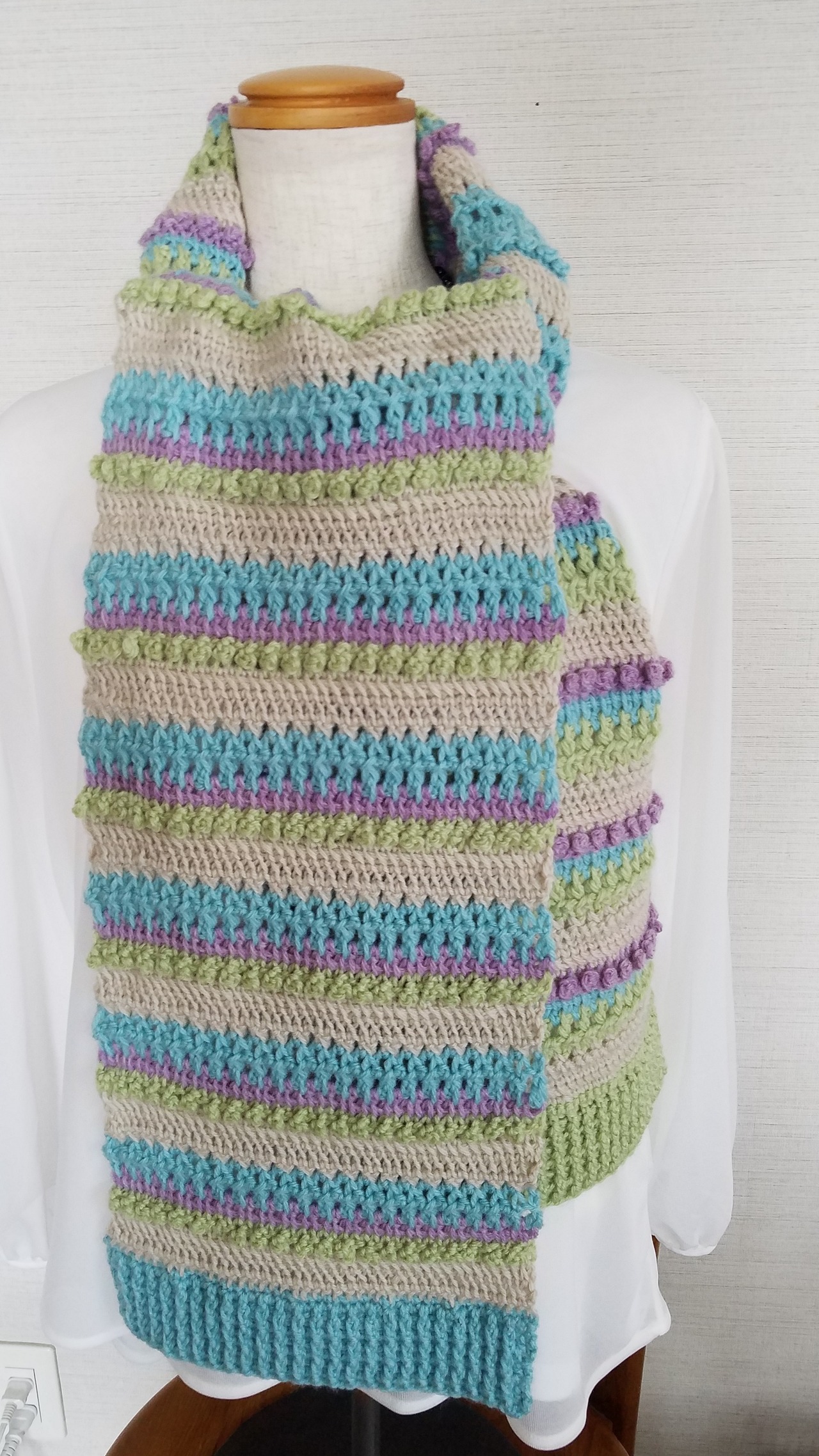 ふんわりと空気を含んだメリノウールの毛糸4色で編んだ、手編みのロングマフラーです。