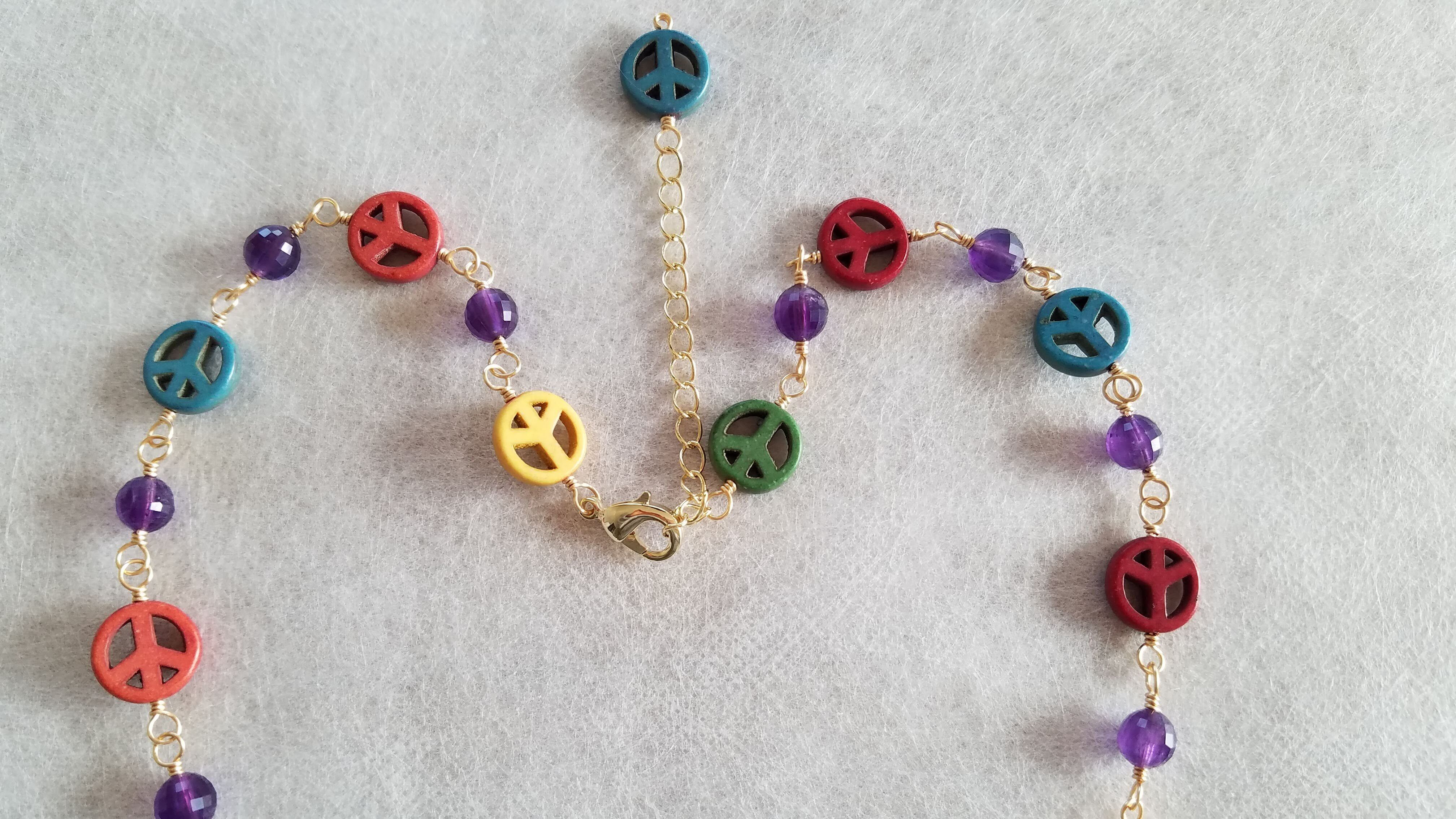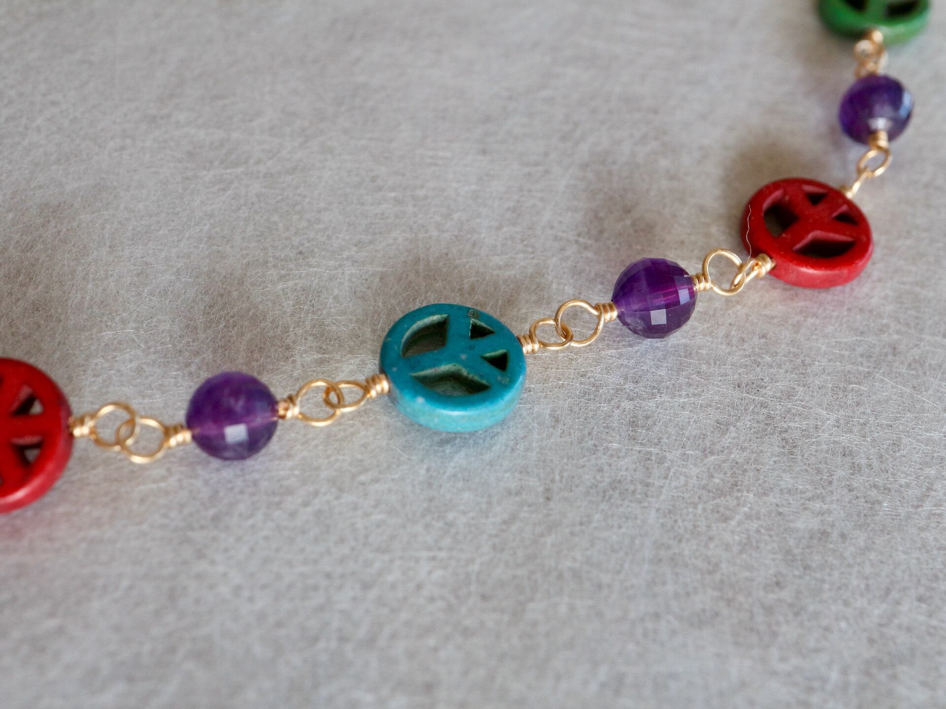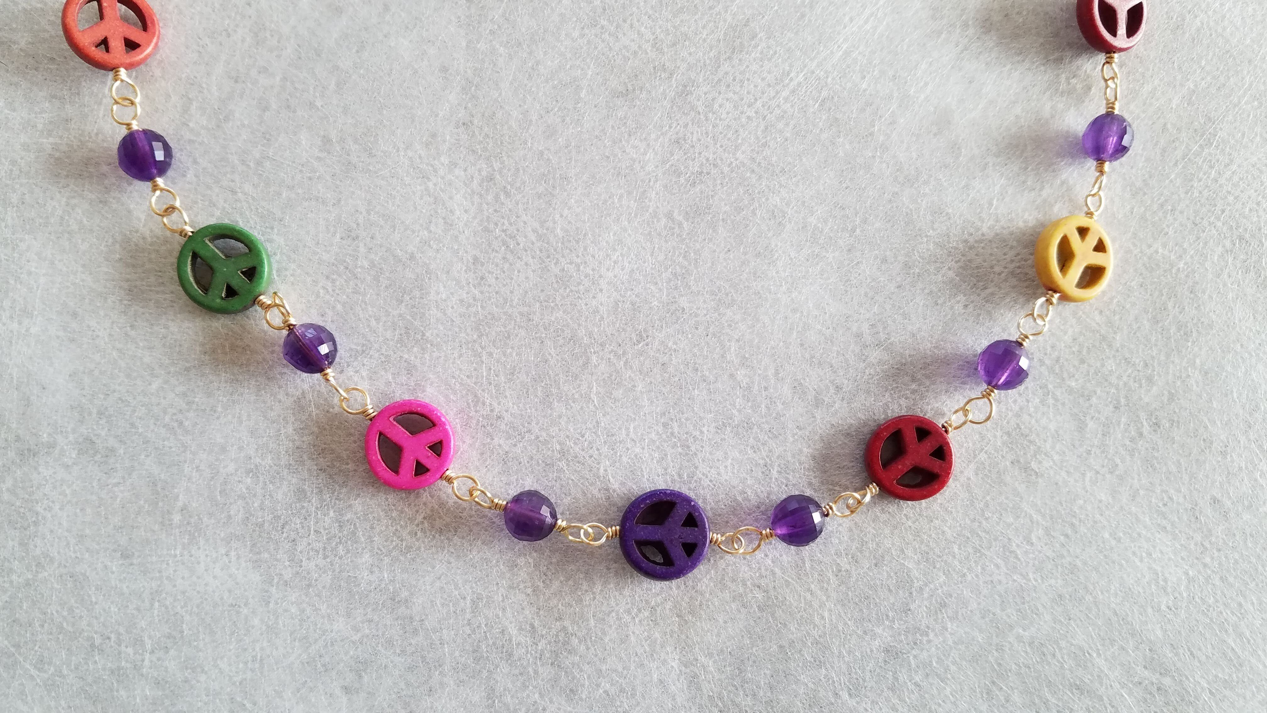 今回使用したコイン形のマグネサイトは、ピースマーク(平和のシンボル)形にカッティングされた、たいへん珍しい形のものです。また、青、緑、紫、黄、赤など、いろいろなカラーを楽しんでいただくことができ、身につけているだけで元気がでてきそうなネックレスに仕上がっております。