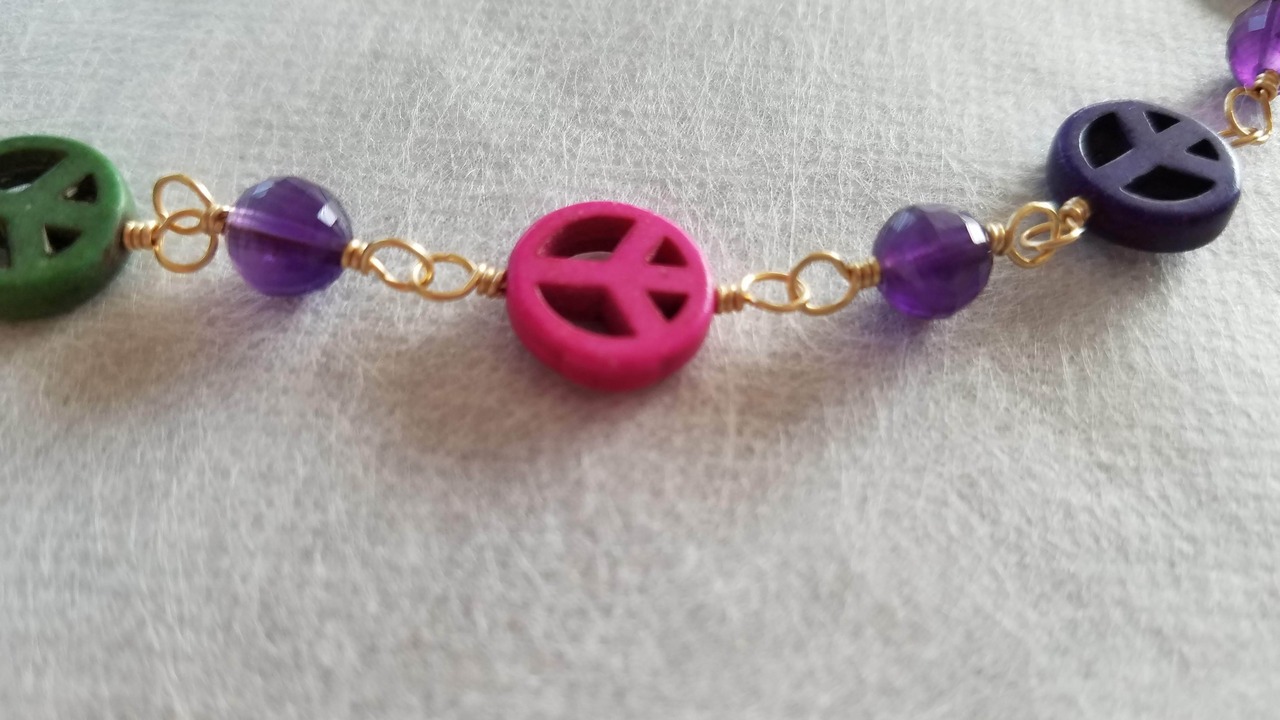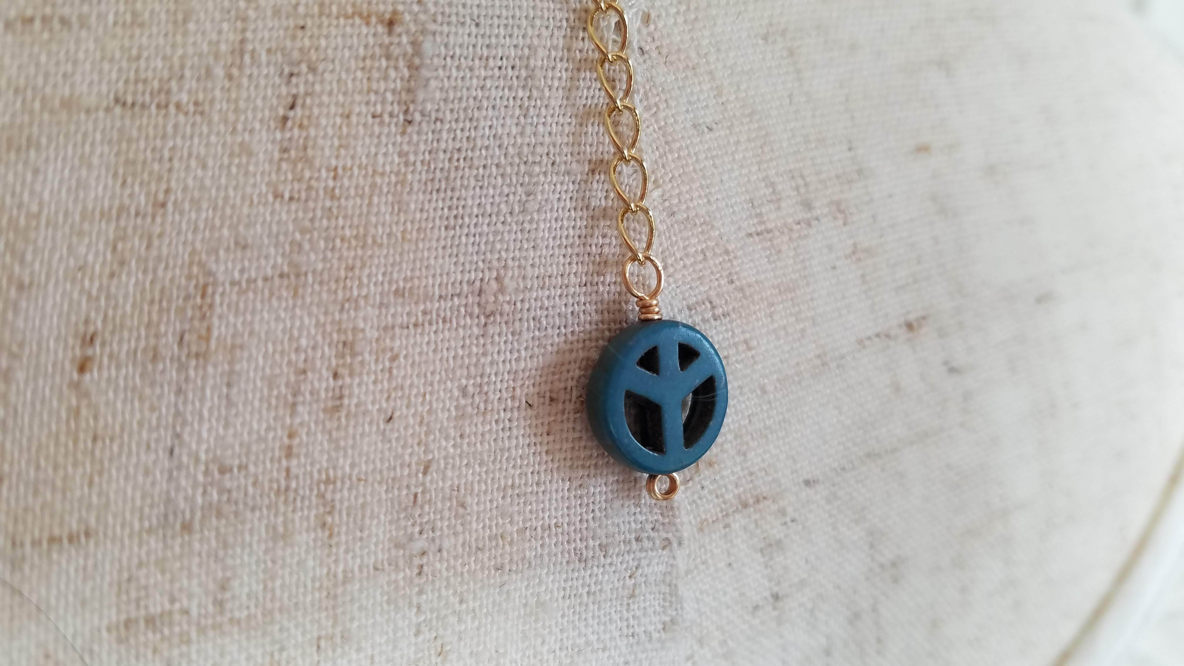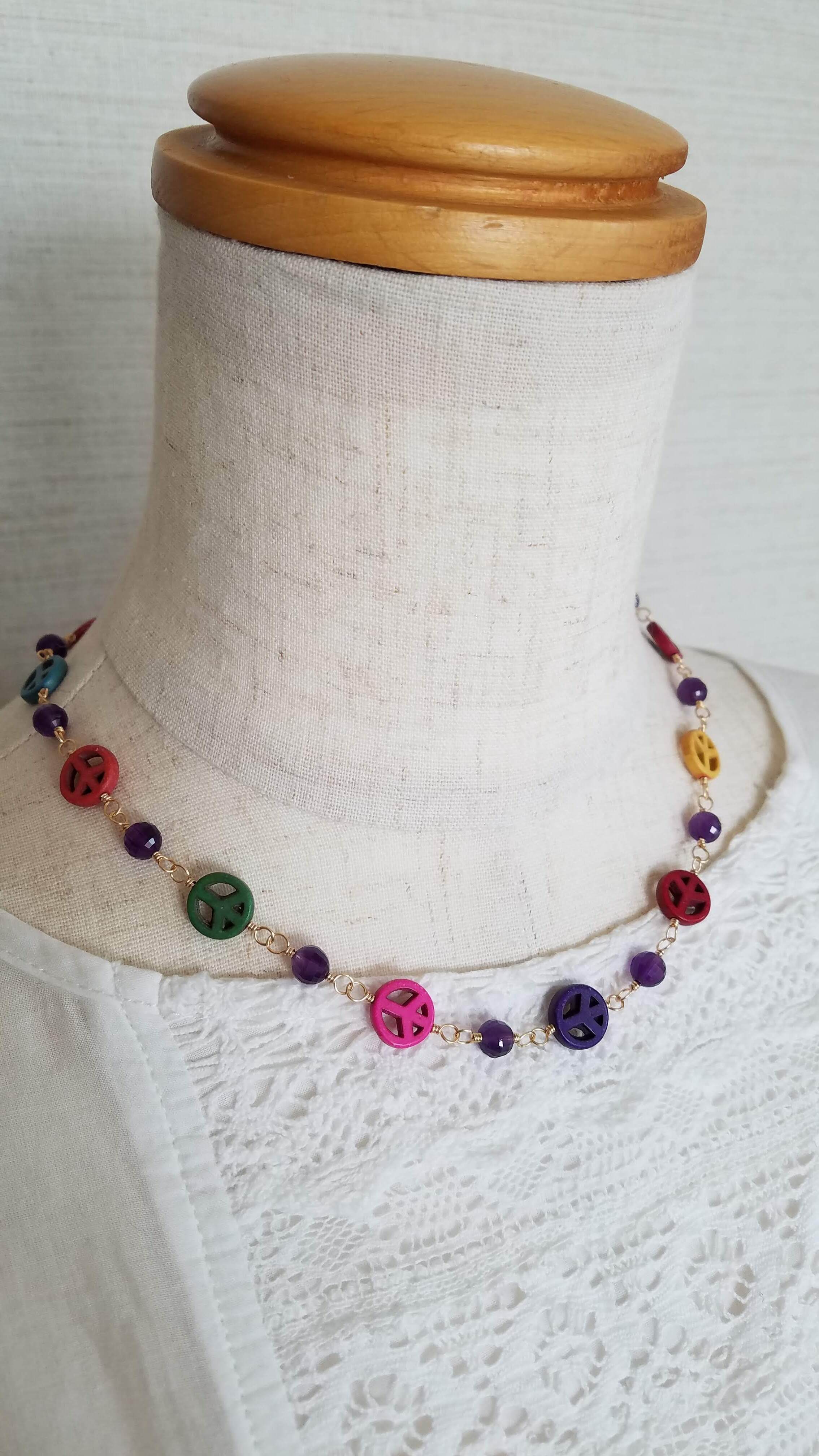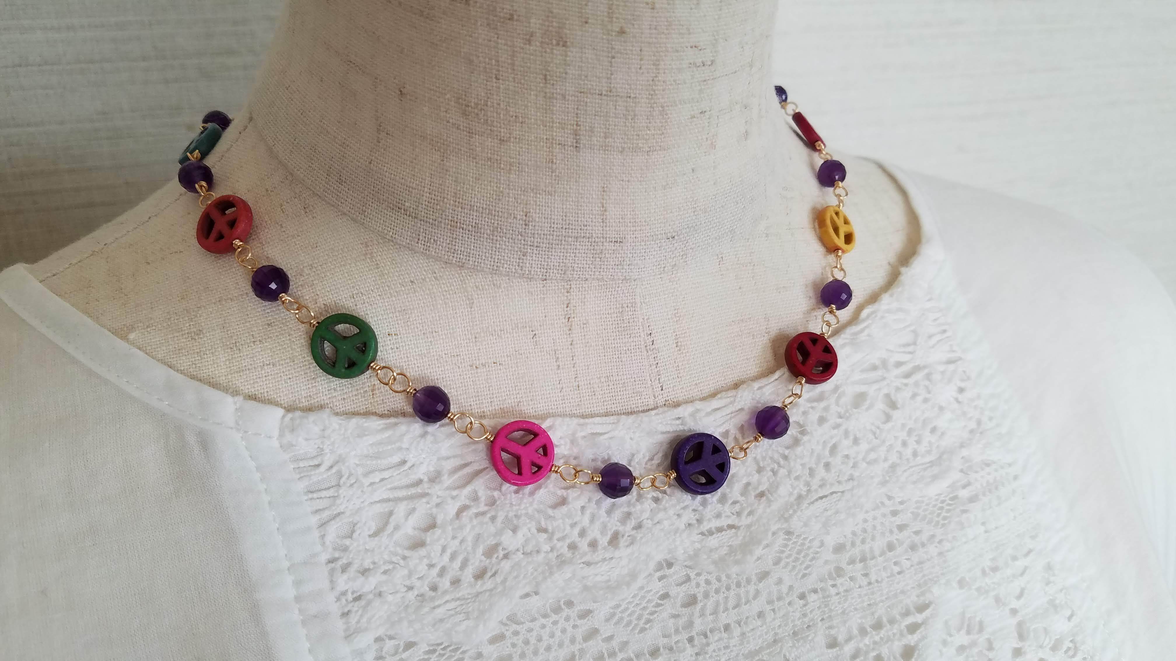 今回使用したコイン形のマグネサイトは、ピースマーク(平和のシンボル)形にカッティングされた、たいへん珍しい形のものです。また、青、緑、紫、黄、赤など、いろいろなカラーを楽しんでいただくことができ、身につけているだけで元気がでてきそうなネックレスに仕上がっております。