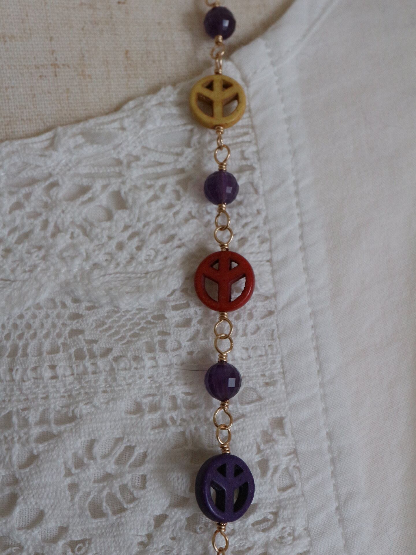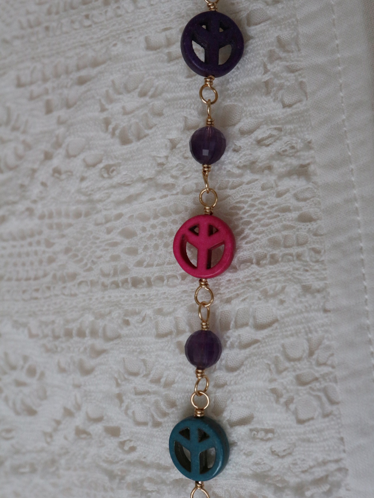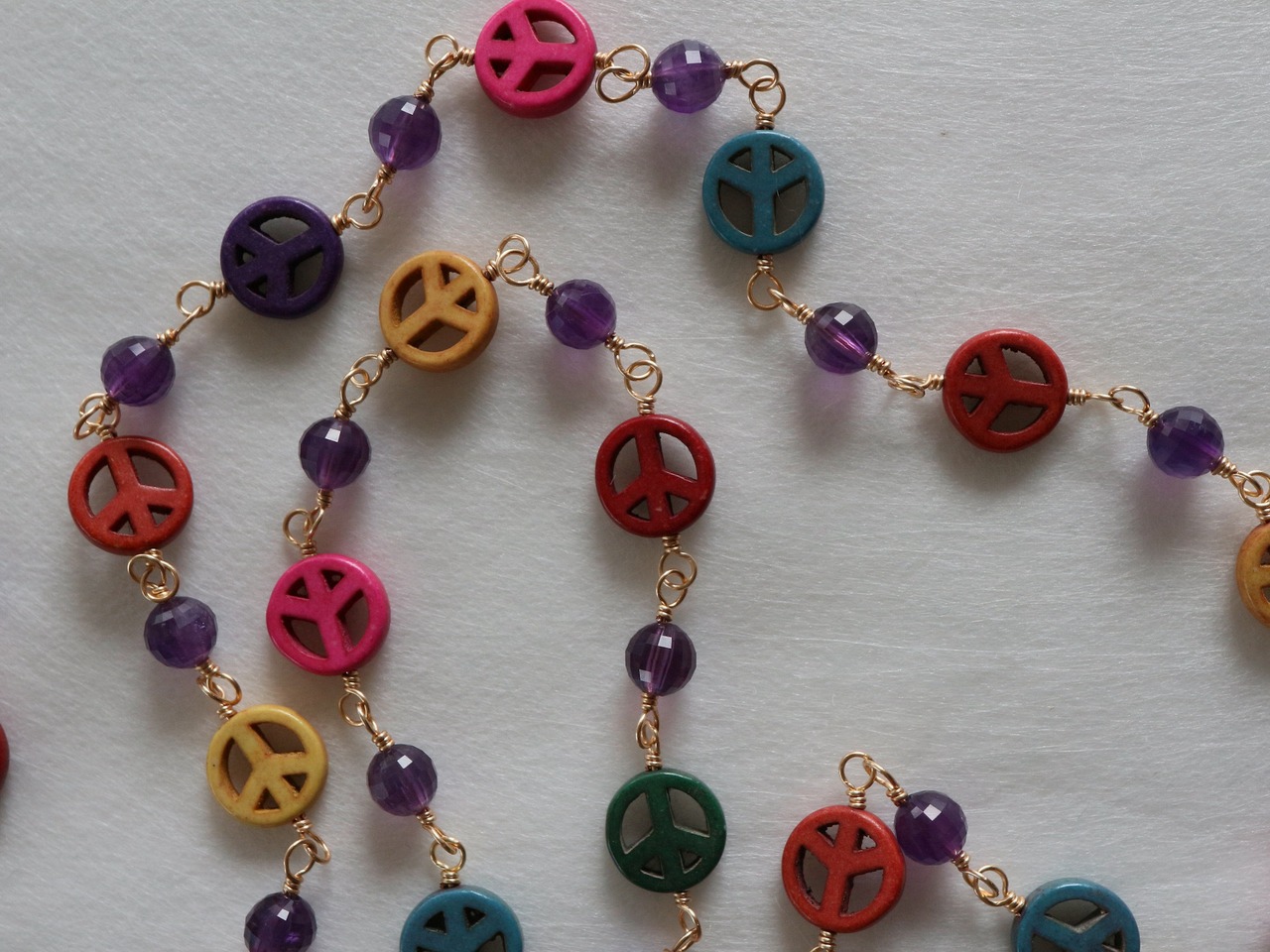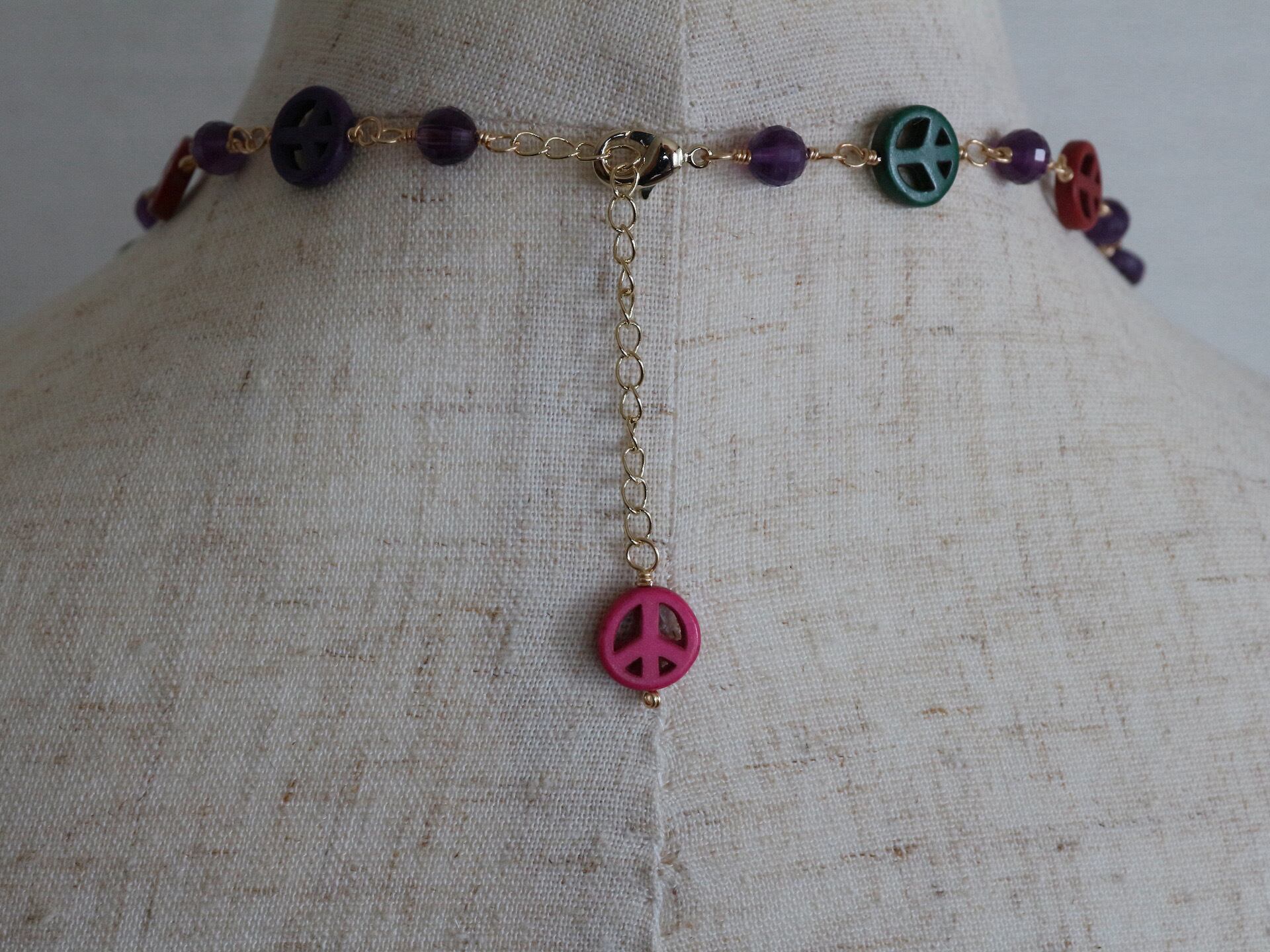 今回使用したコイン形のマグネサイトは、ピースマーク(平和のシンボル)形にカッティングされた、たいへん珍しい形のものです。また、青、緑、紫、黄、赤など、いろいろなカラーを楽しんでいただくことができ、身につけているだけで元気がでてきそうなネックレスに仕上がっております。
