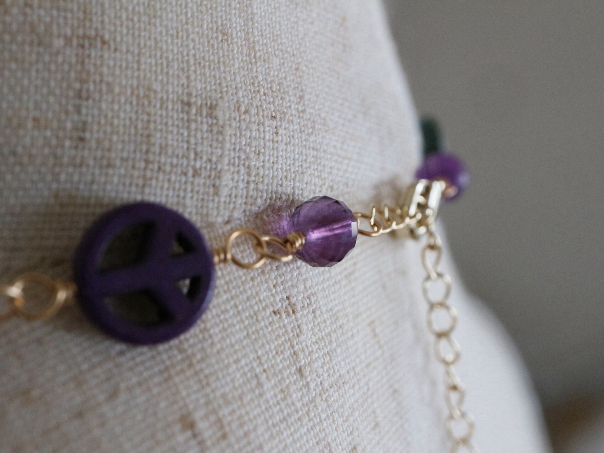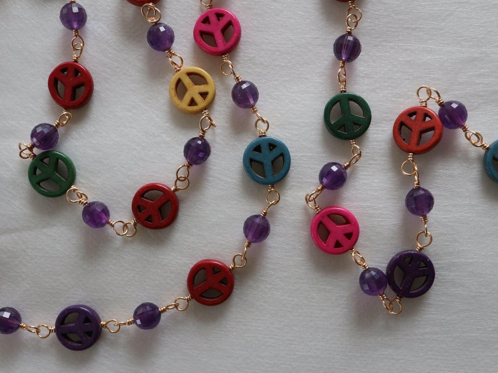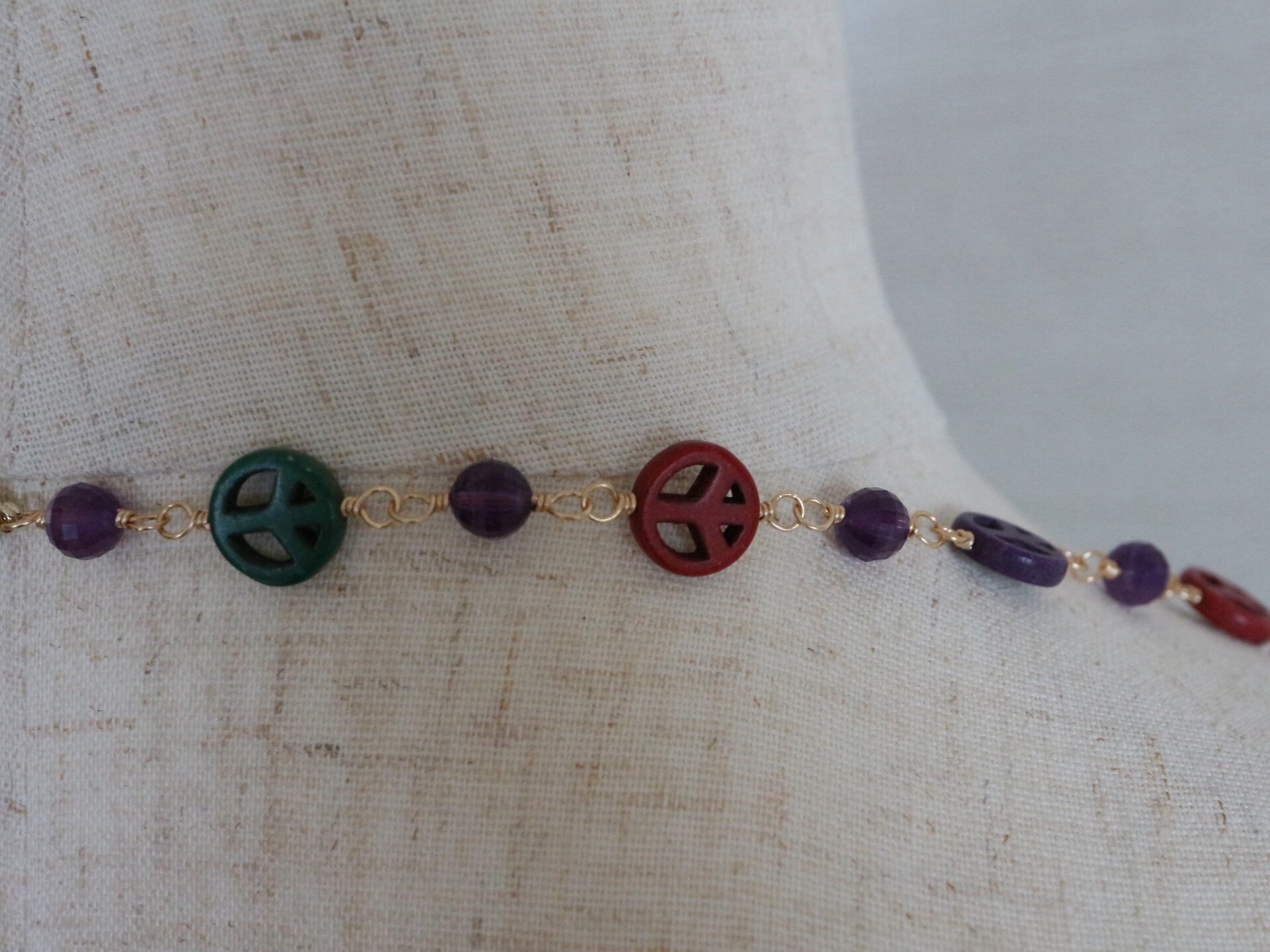 今回使用したコイン形のマグネサイトは、ピースマーク(平和のシンボル)形にカッティングされた、たいへん珍しい形のものです。また、青、緑、紫、黄、赤など、いろいろなカラーを楽しんでいただくことができ、身につけているだけで元気がでてきそうなネックレスに仕上がっております。