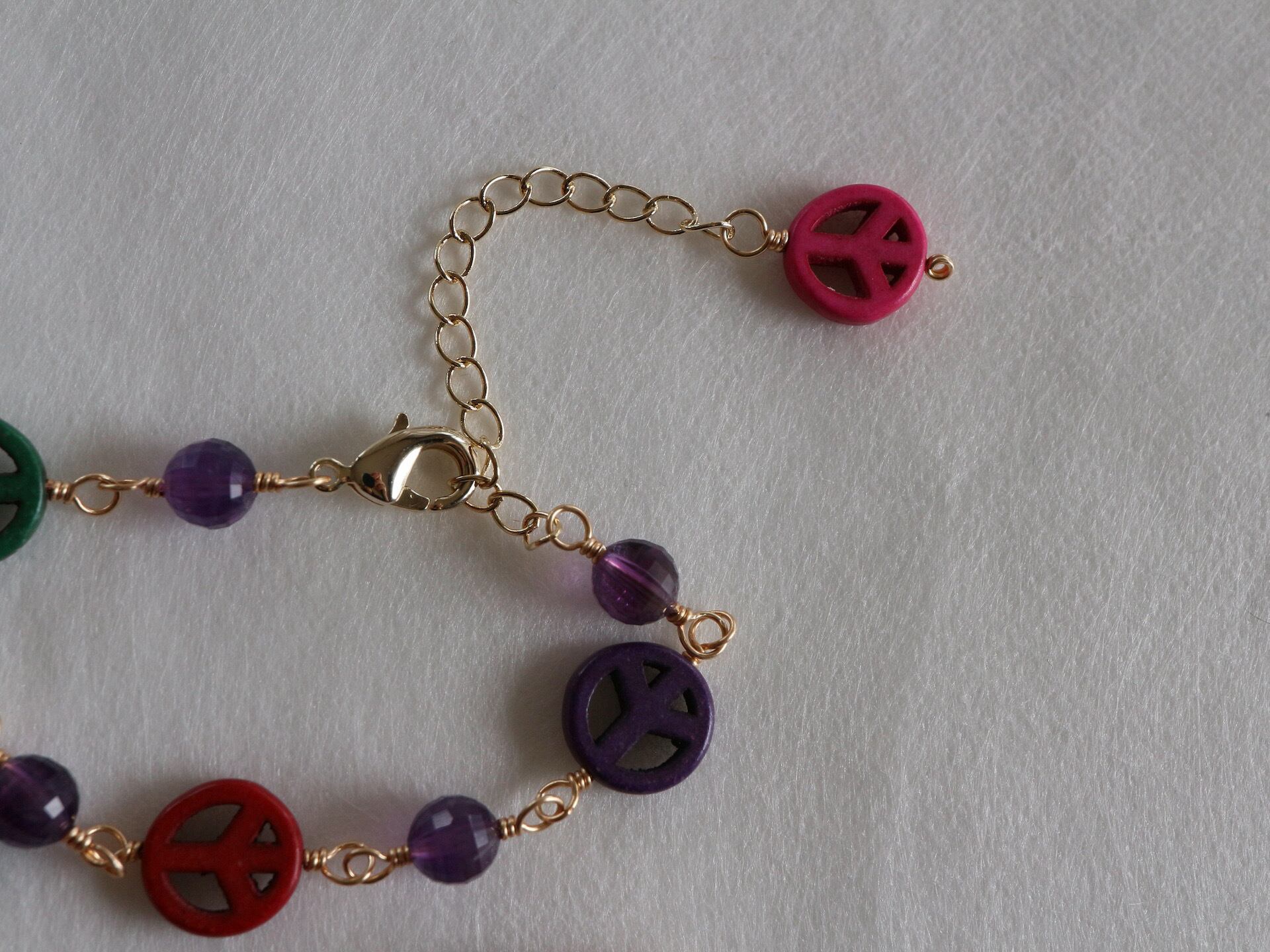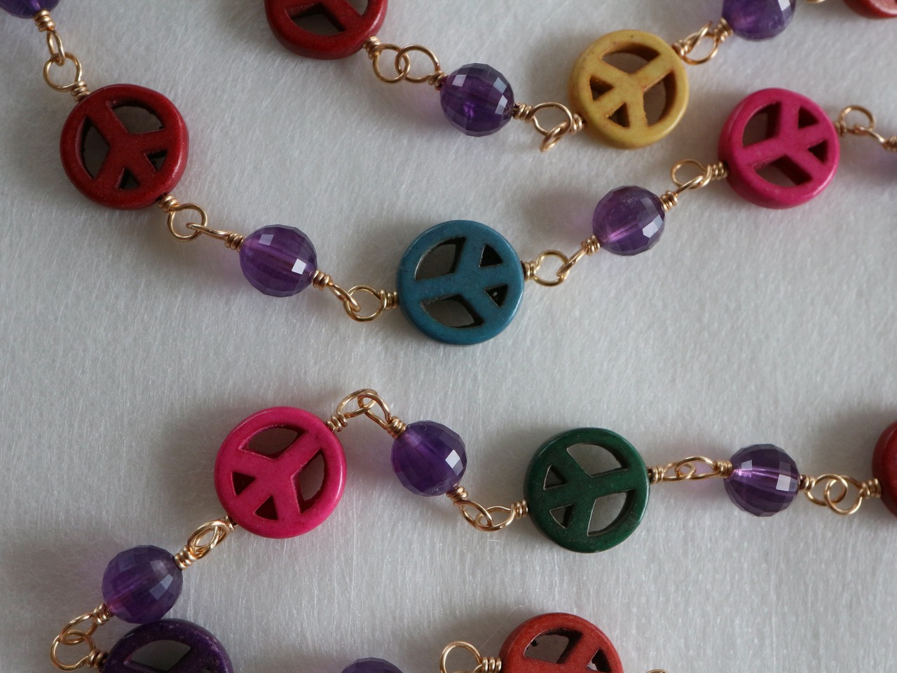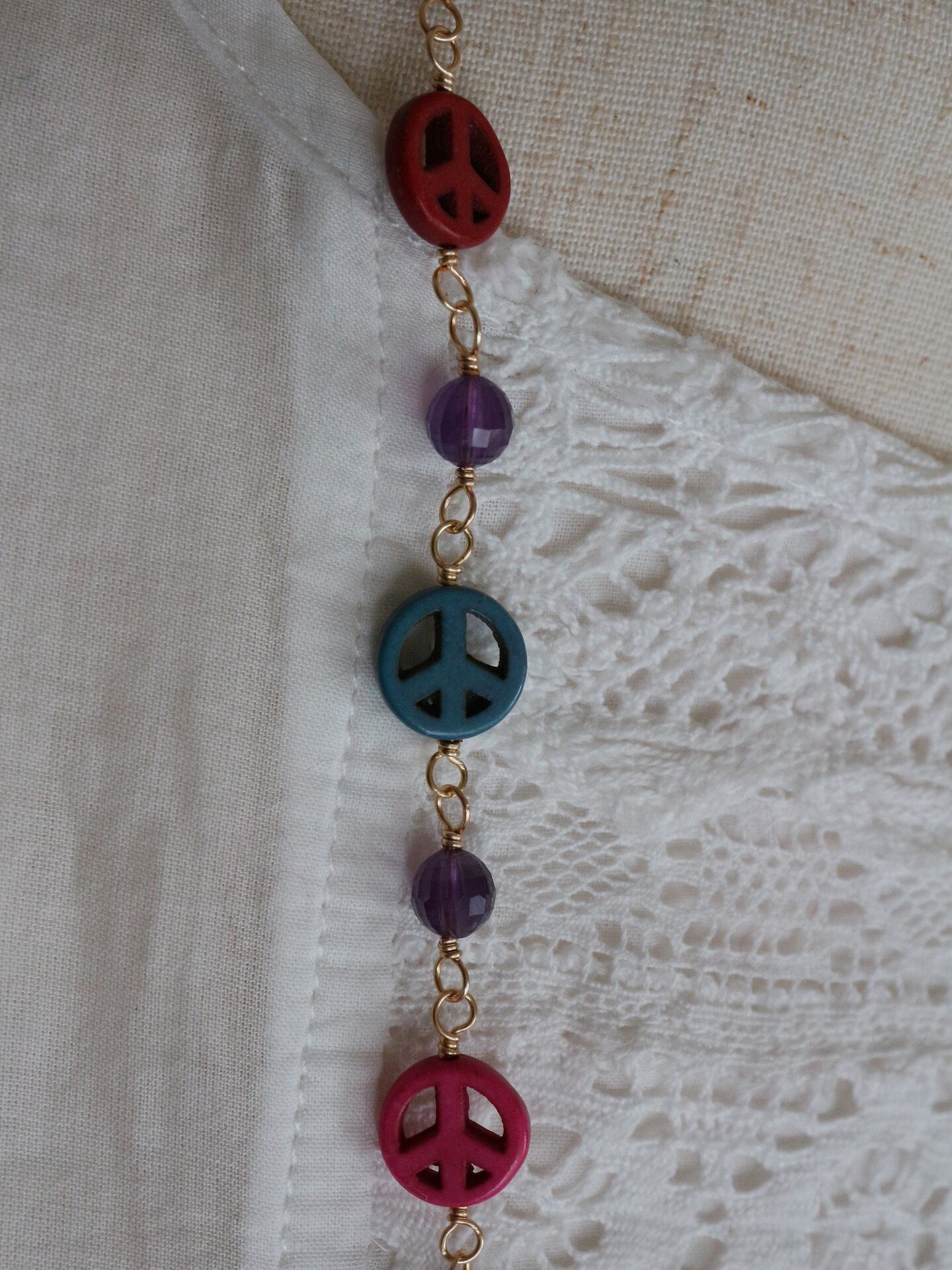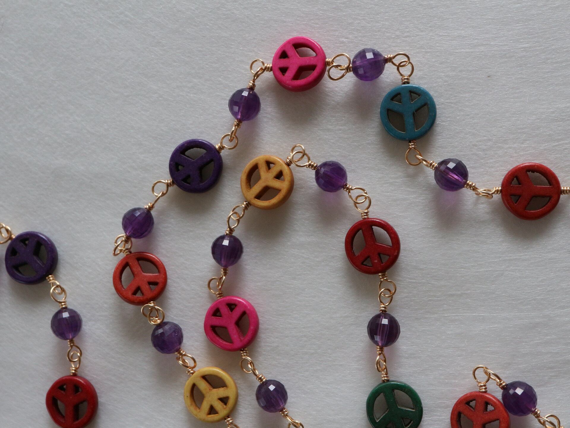 今回使用したコイン形のマグネサイトは、ピースマーク(平和のシンボル)形にカッティングされた、たいへん珍しい形のものです。また、青、緑、紫、黄、赤など、いろいろなカラーを楽しんでいただくことができ、身につけているだけで元気がでてきそうなネックレスに仕上がっております。