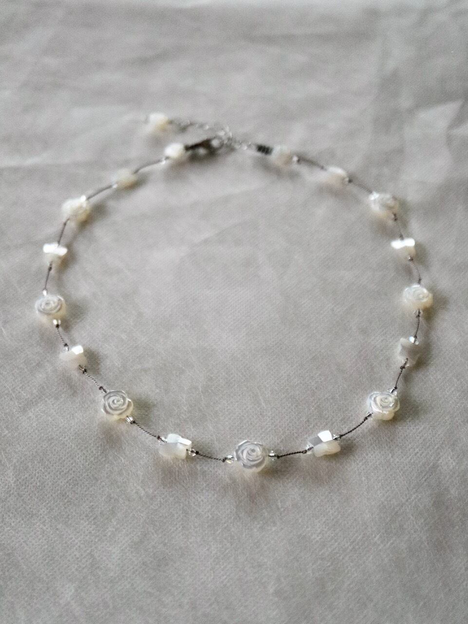 薔薇形と蝶形の高品質の白蝶貝(シェル)を交互に配置してつないだ、ショートネックレスです。両方とも、ひとつひとつ丁寧に彫刻されたもので、両面仕上げとなっております。蝶形の方は真ん中が厚みがある形状に仕上げられており、美しくデフォルメされております。