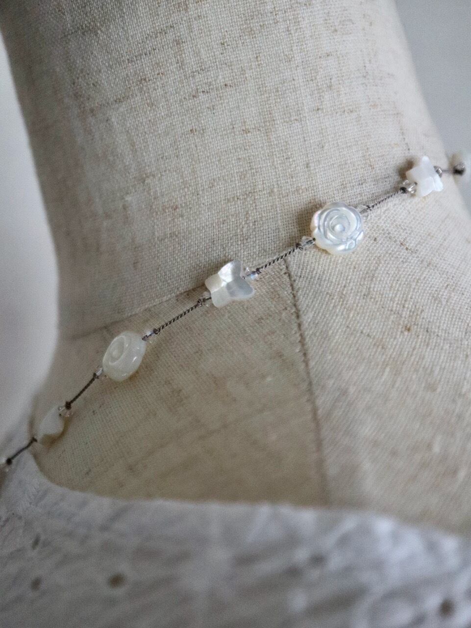 ビーズ用のグリフィンコード(絹100%)で結び目をつくりながらつなぎました。また、薔薇形と蝶形シェルをはさむように、クリスタルビーズを配置してあります。