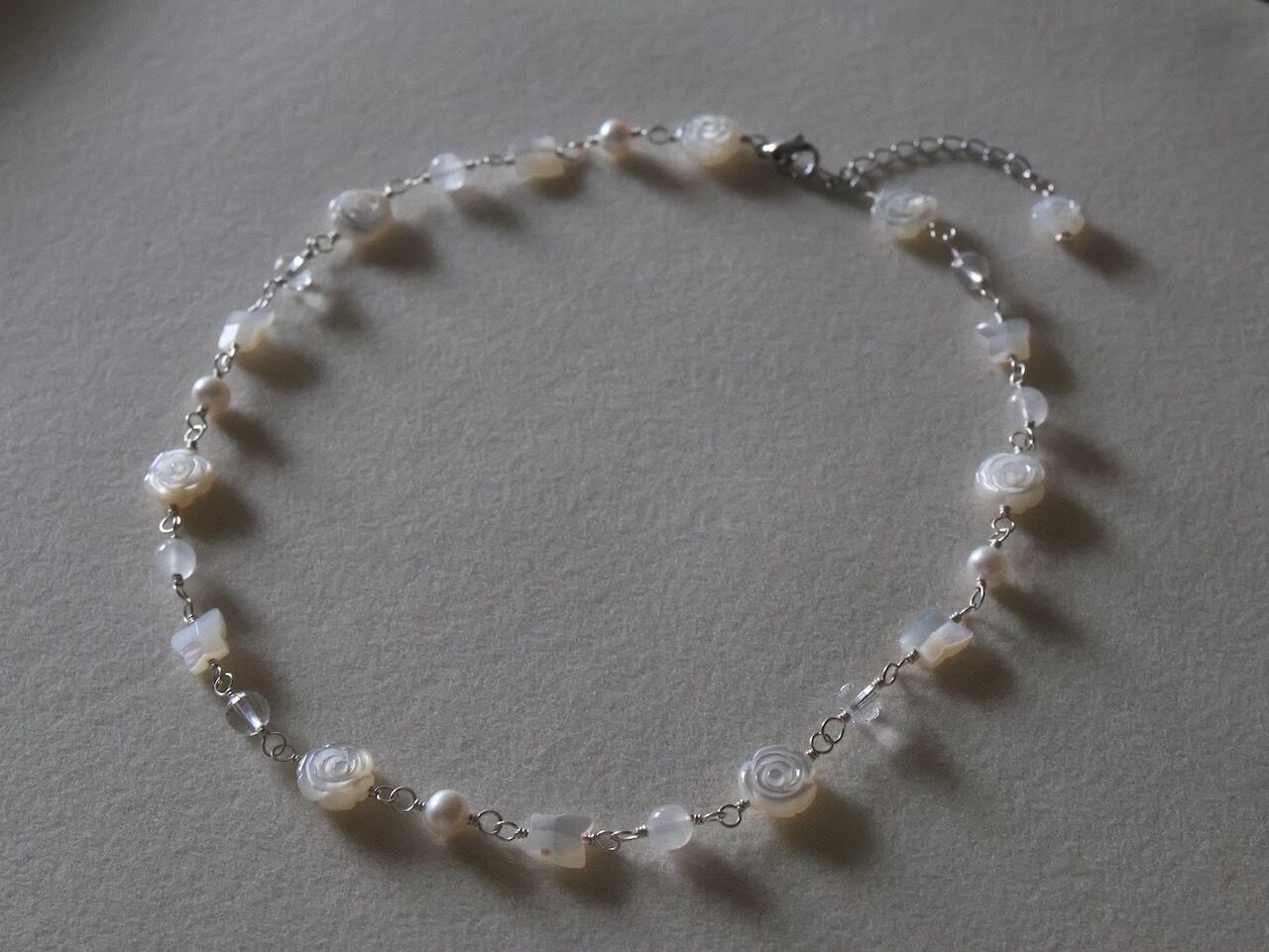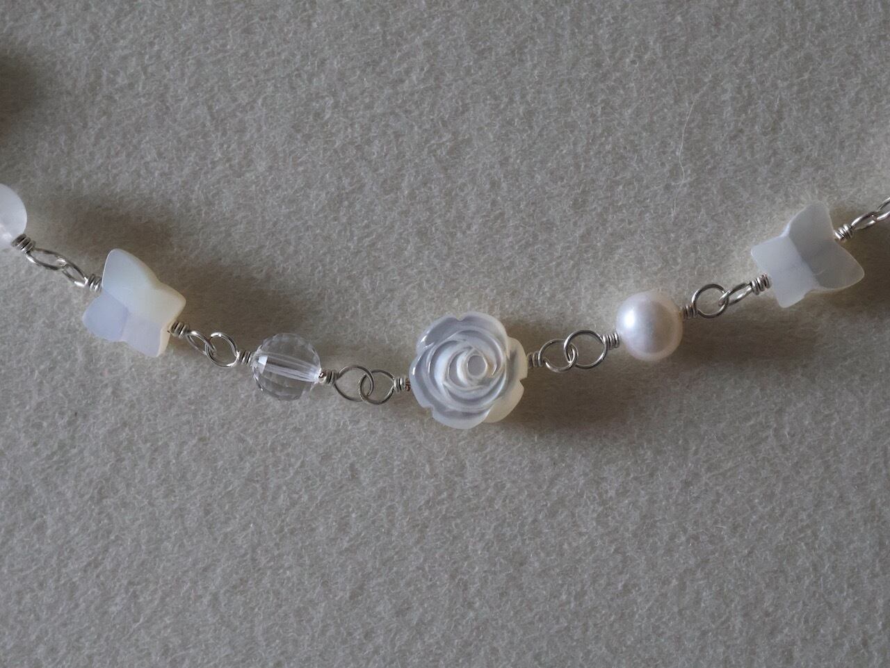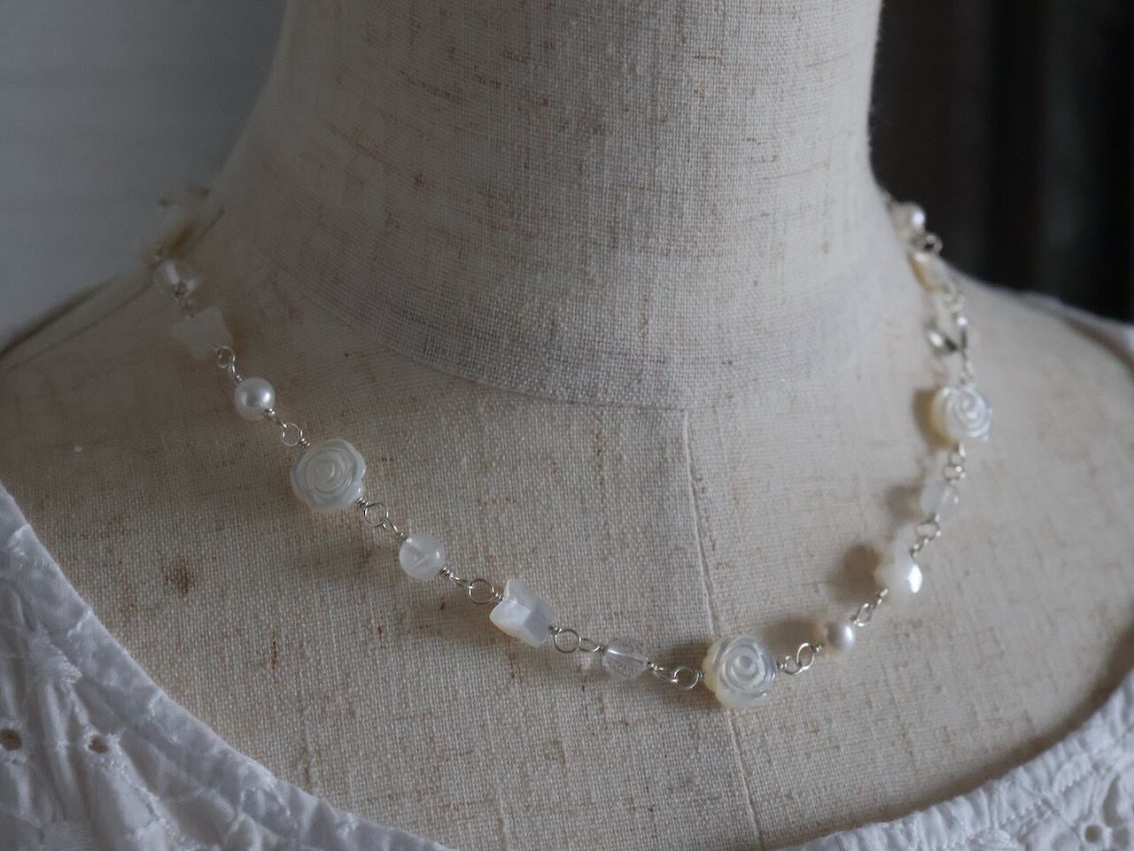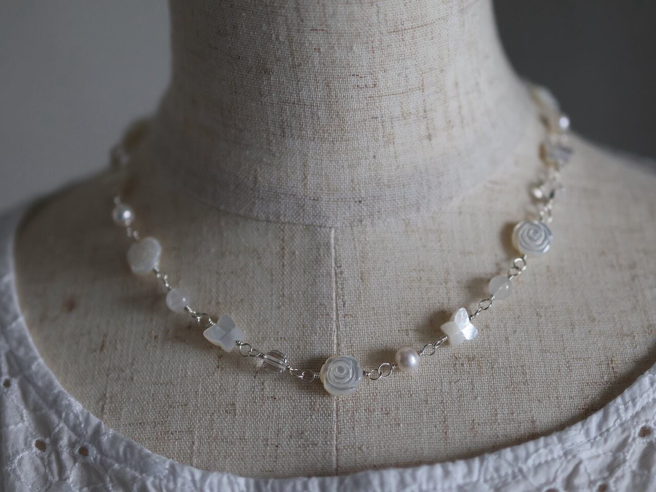 薔薇形と蝶形の高品質の白蝶貝(シェル)、淡水パール、白色ムーンストーン、ミラーカット形水晶をワイヤーでつないだ、ネックレスです(技法:メガネ留め)。