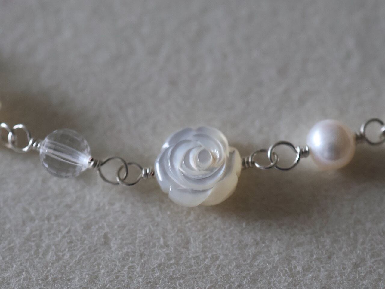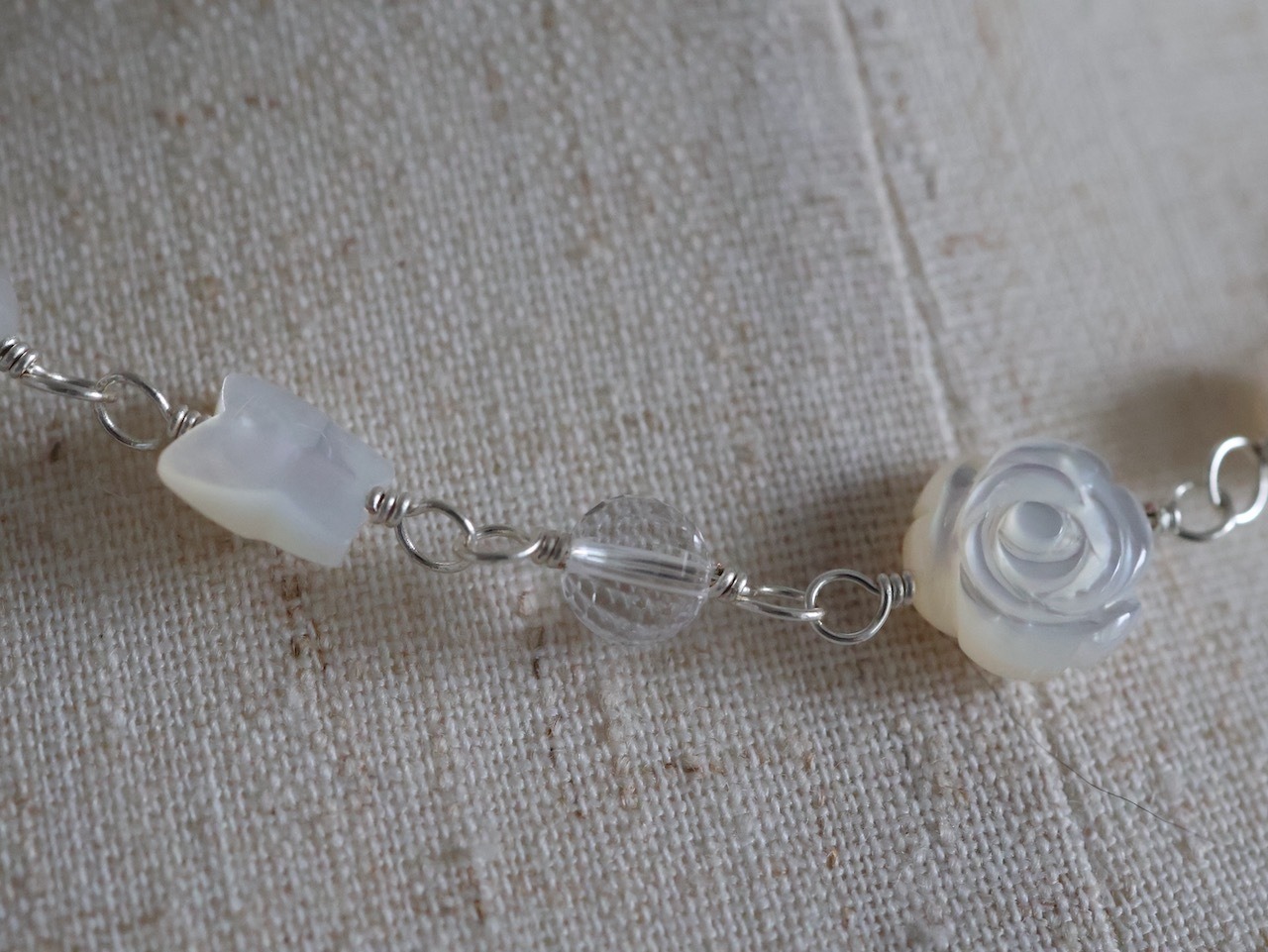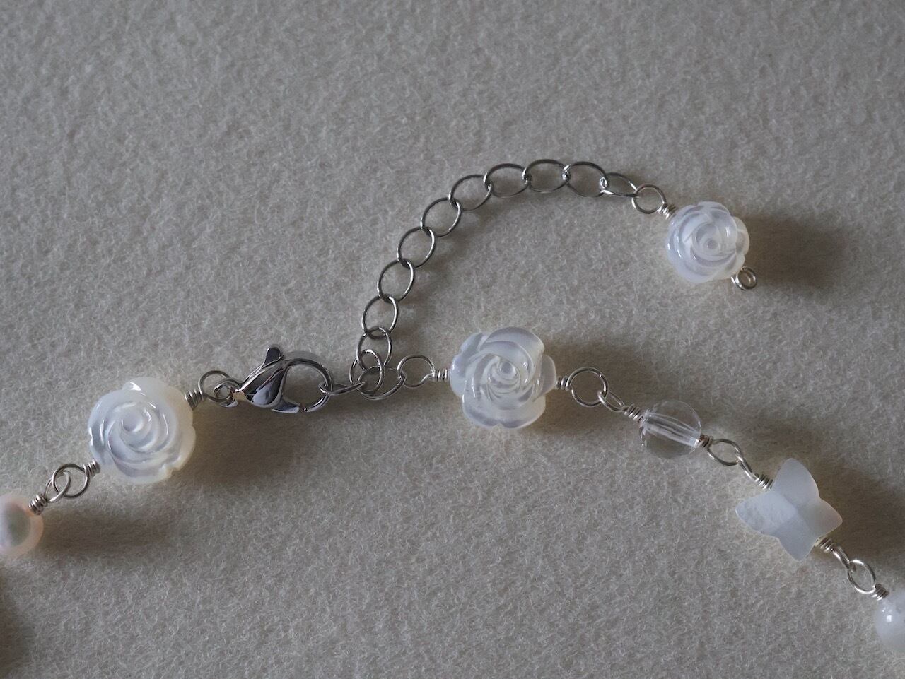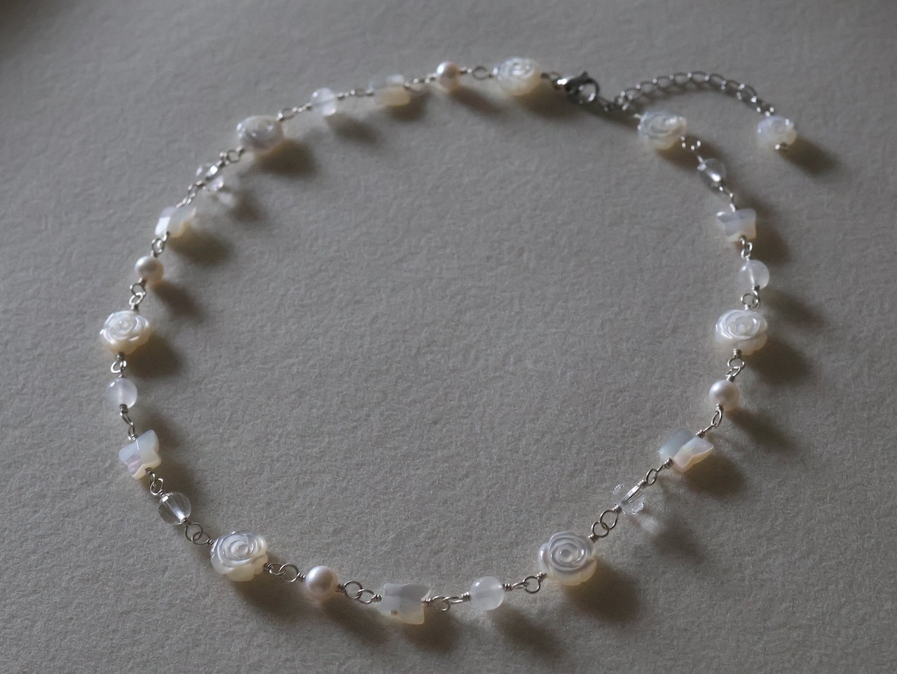 薔薇形と蝶形の高品質の白蝶貝(シェル)、淡水パール、白色ムーンストーン、ミラーカット形水晶をワイヤーでつないだ、ネックレスです(技法:メガネ留め)。
