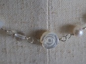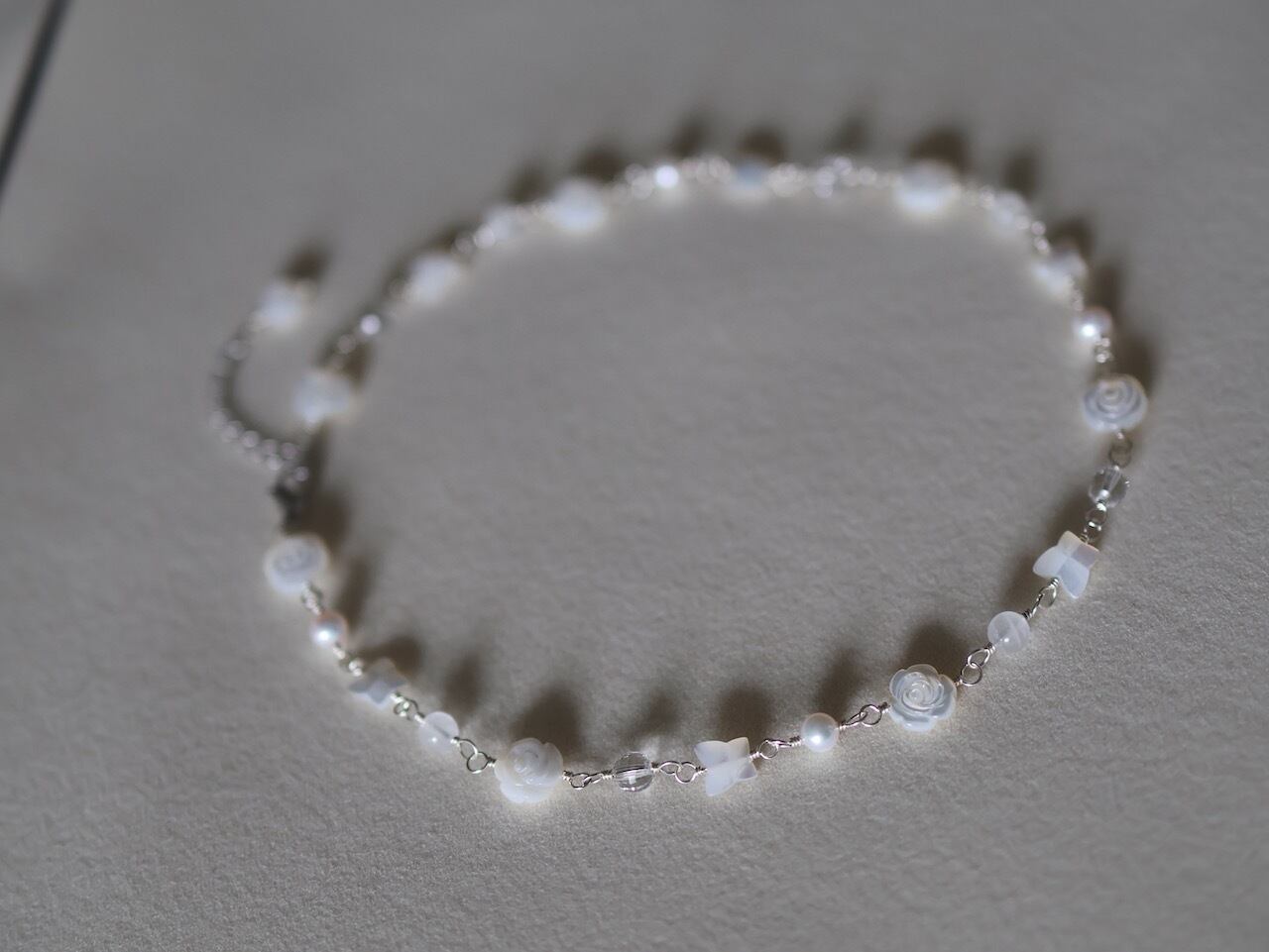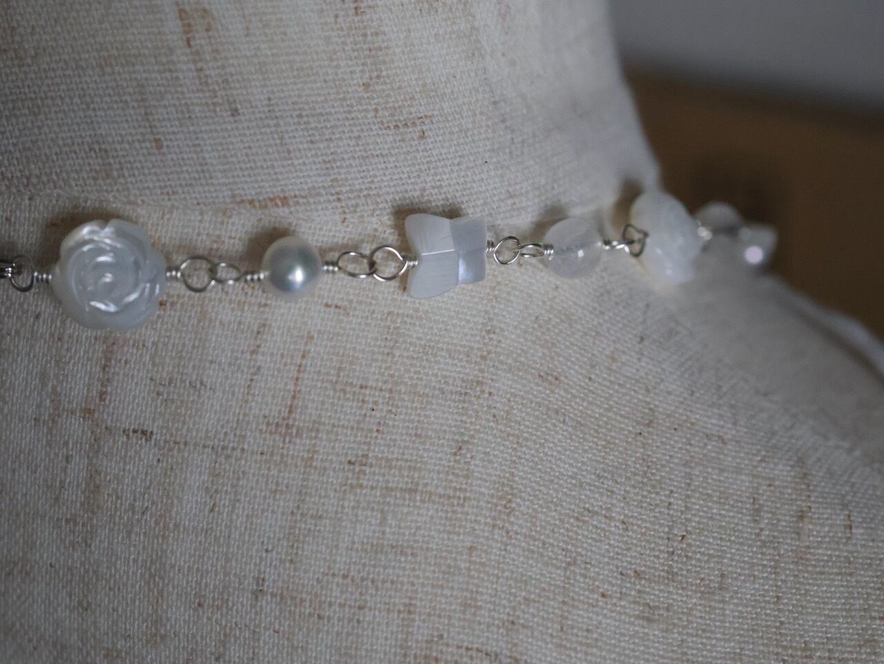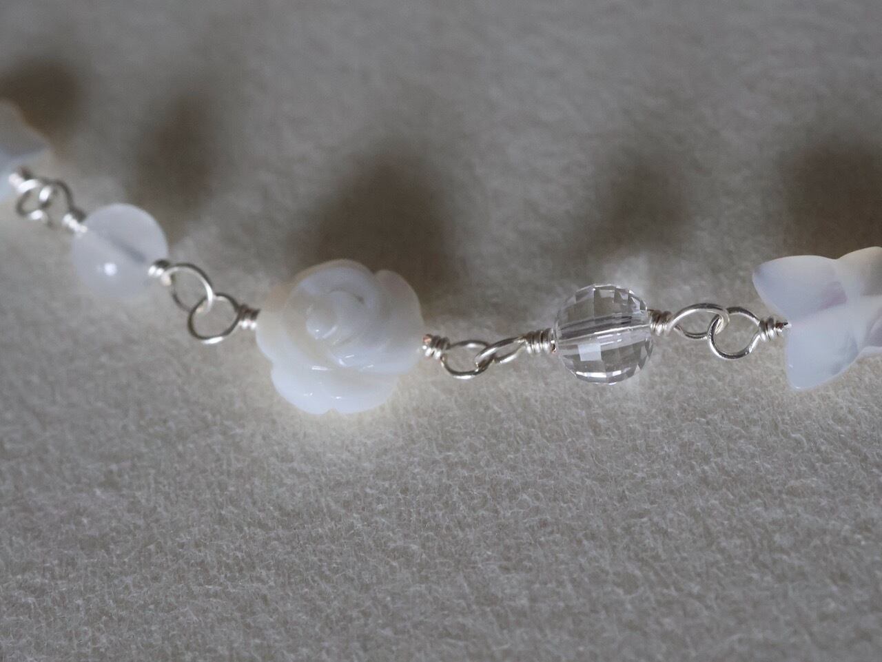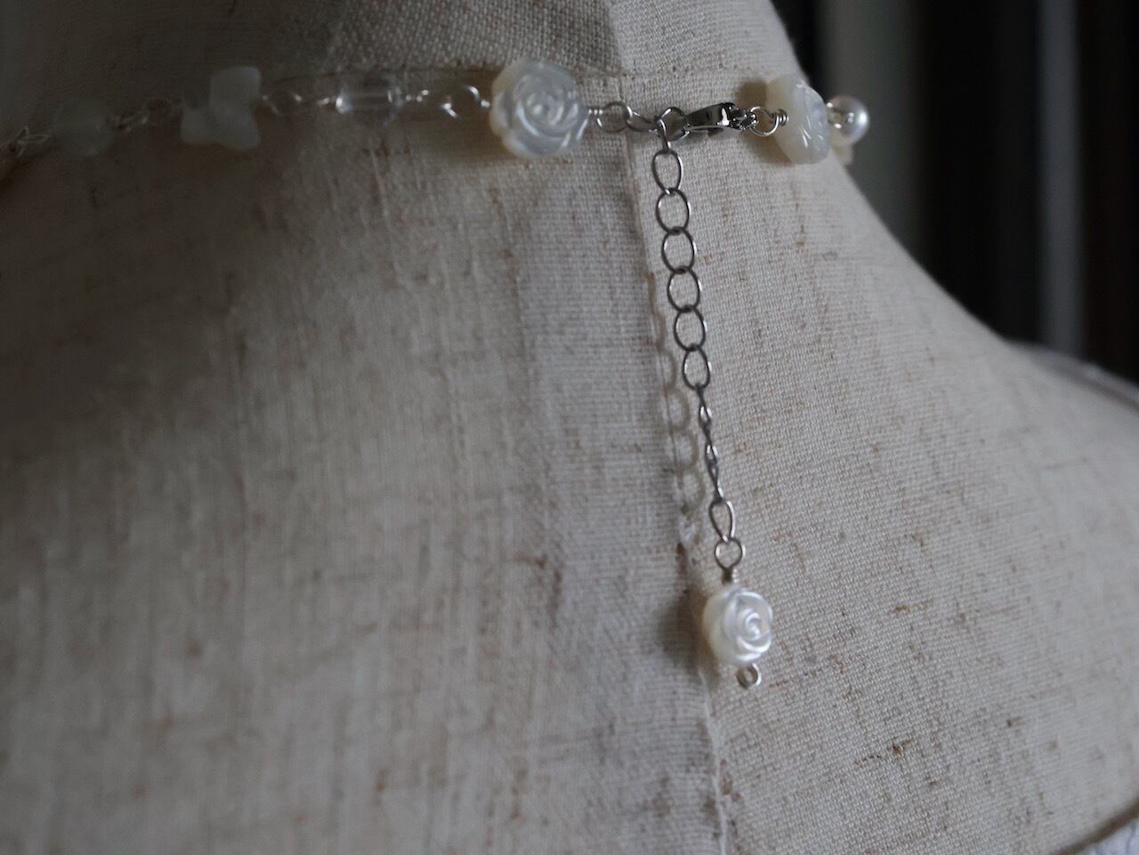 薔薇形と蝶形の高品質の白蝶貝(シェル)、淡水パール、白色ムーンストーン、ミラーカット形水晶をワイヤーでつないだ、ネックレスです(技法:メガネ留め)。