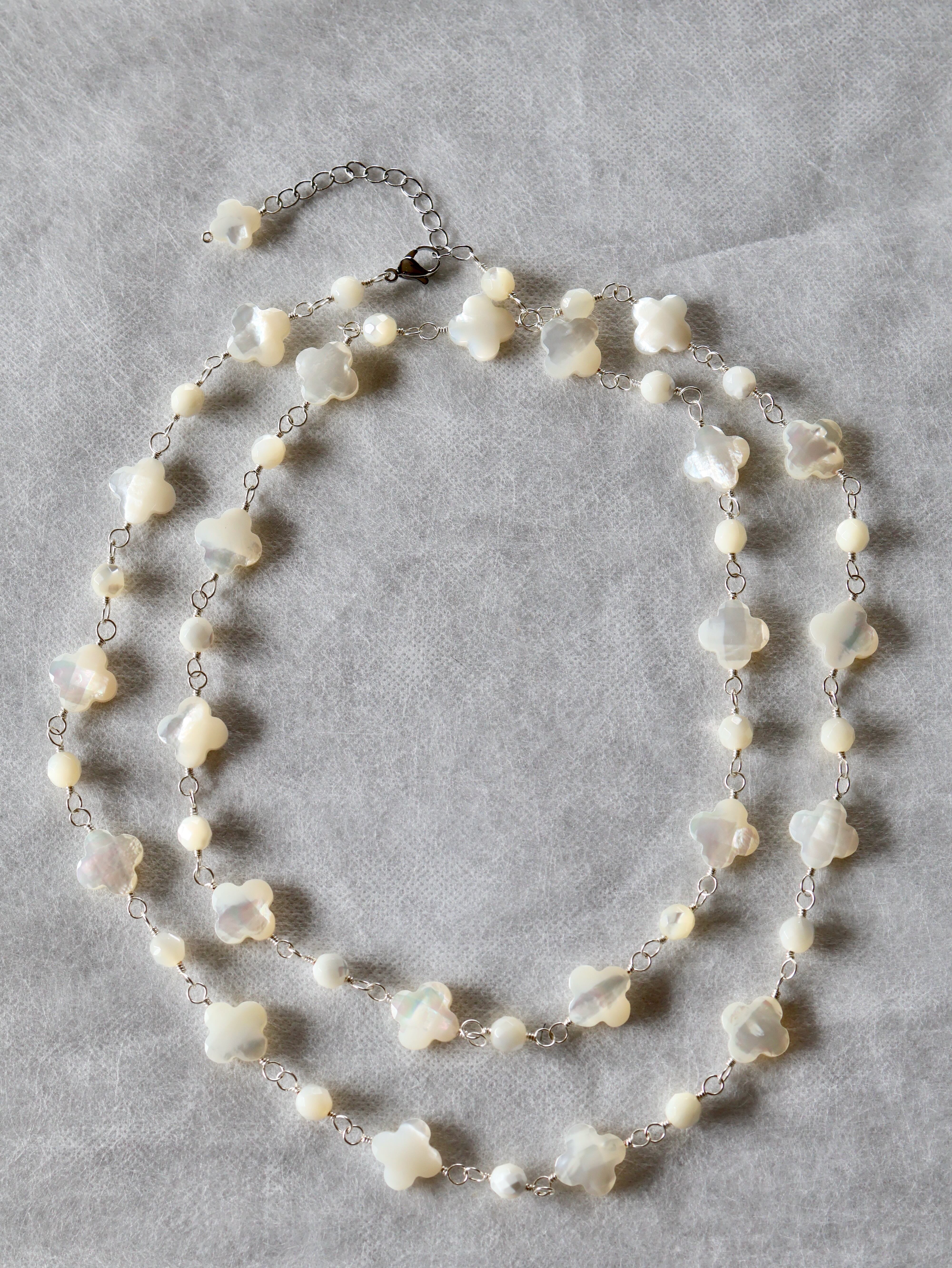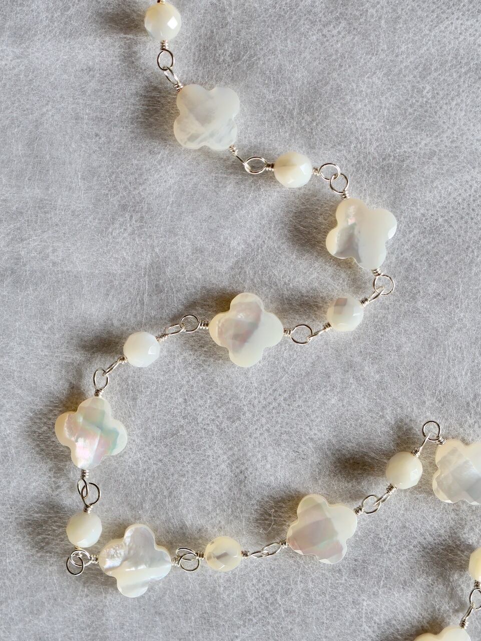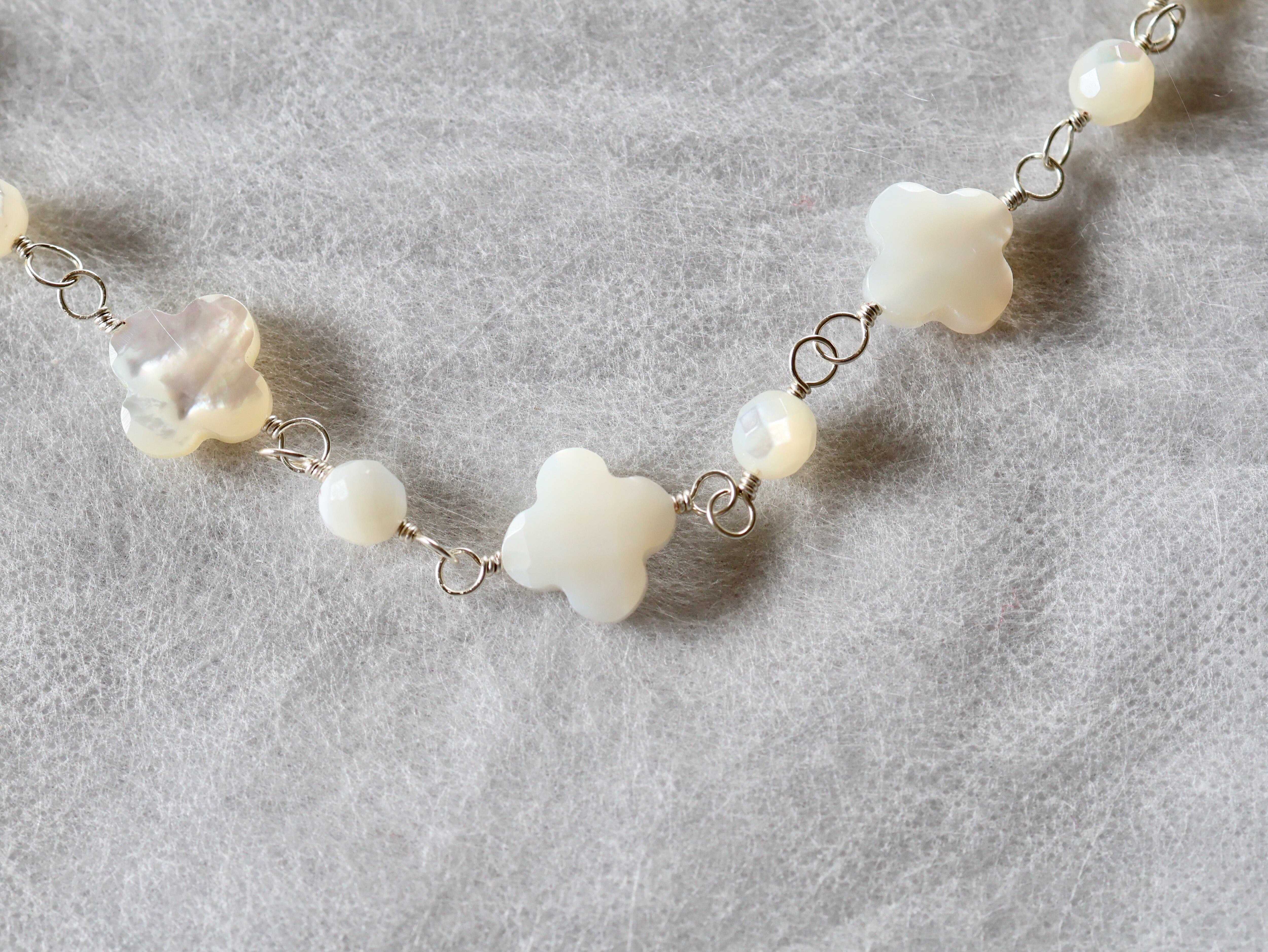 4枚花形と丸形のシェル(白蝶貝)をワイヤーで交互につないで作ったネックレスです。使用した白蝶貝は、表面にカッティング加工が施されたもので、角度によって光沢や色などが楽しめる高品質のものです。全長約90センチですが、5センチのアジャスターで90センチから95センチの間で長さを調節していただくことができます。