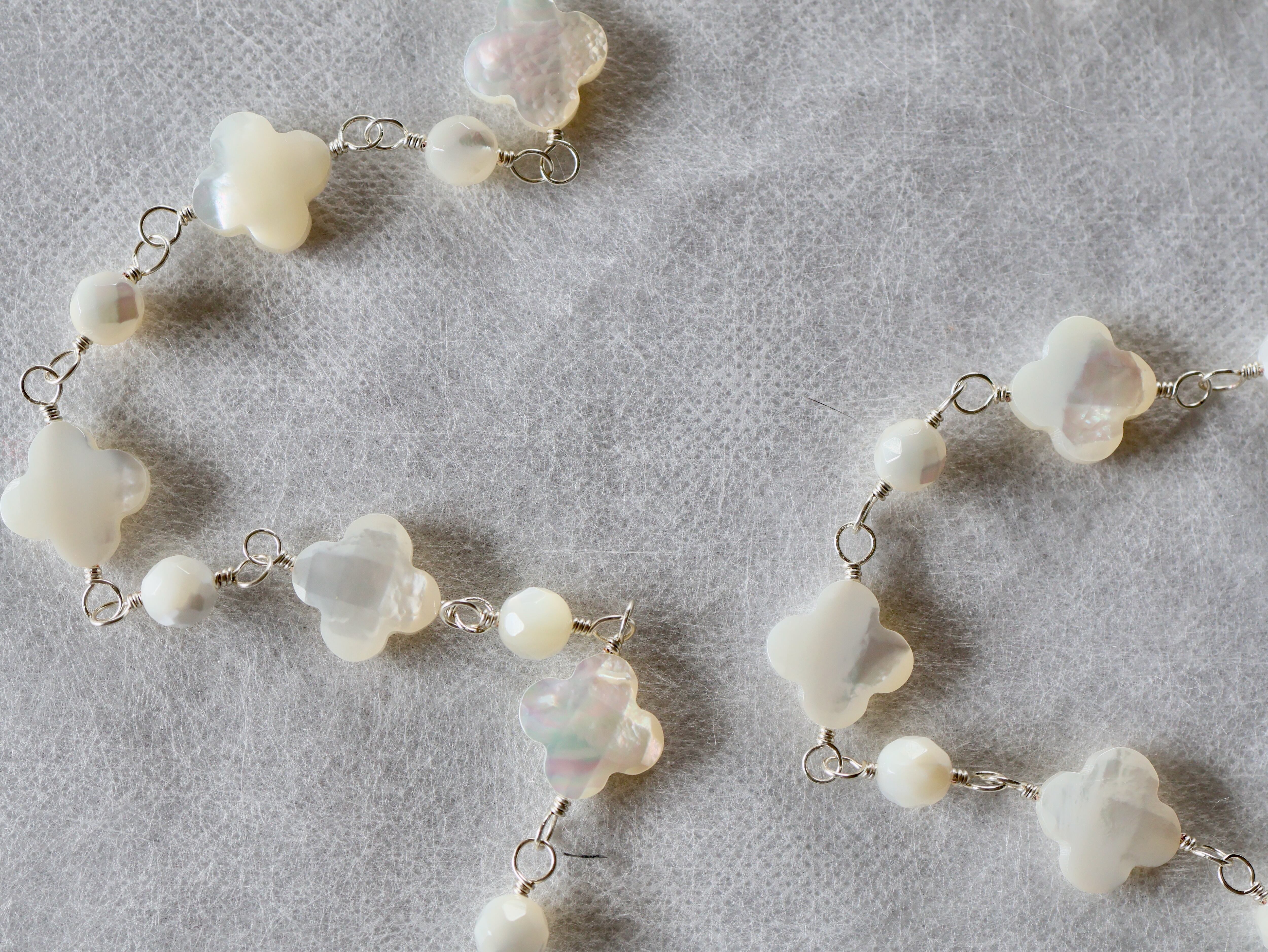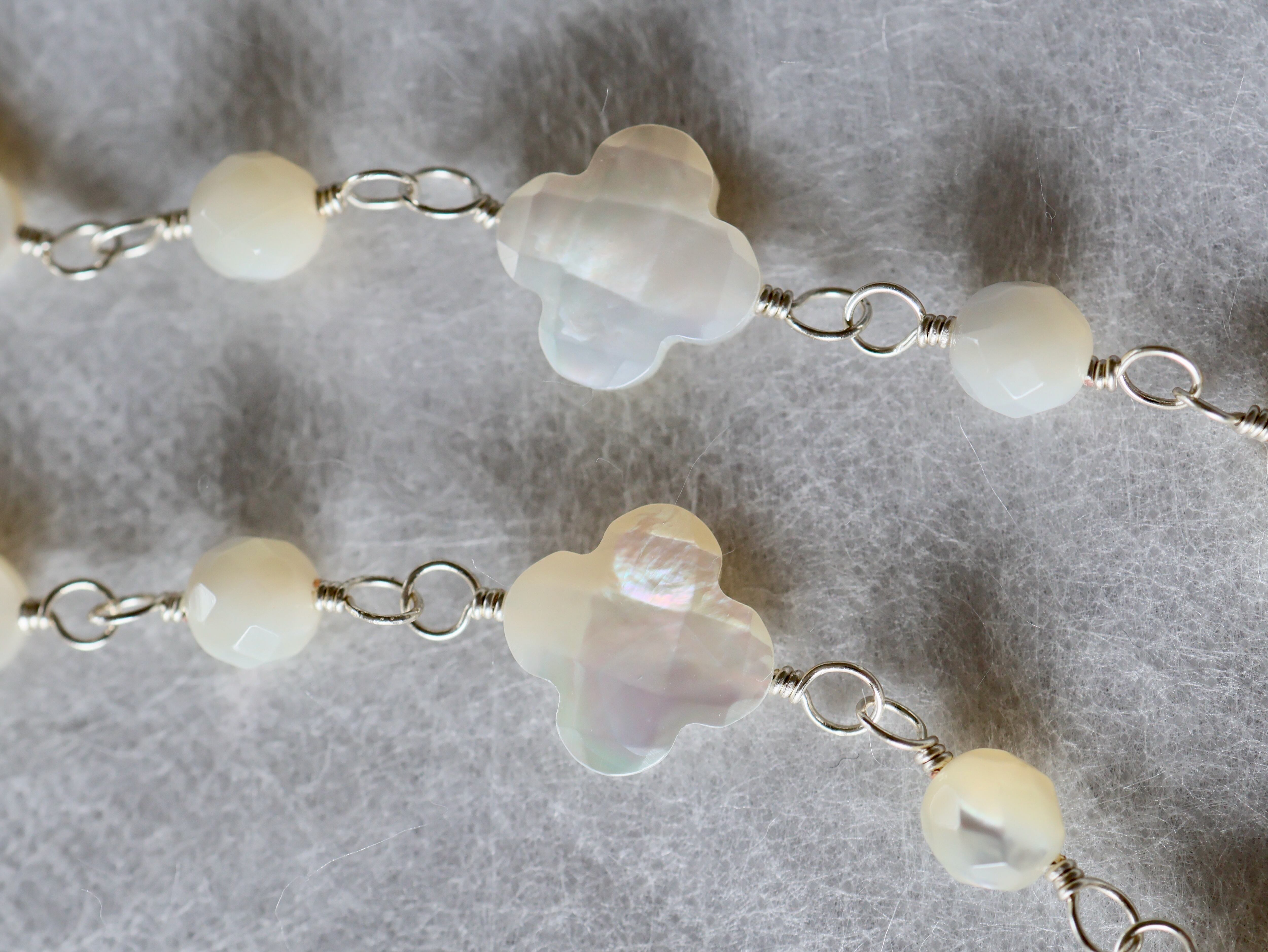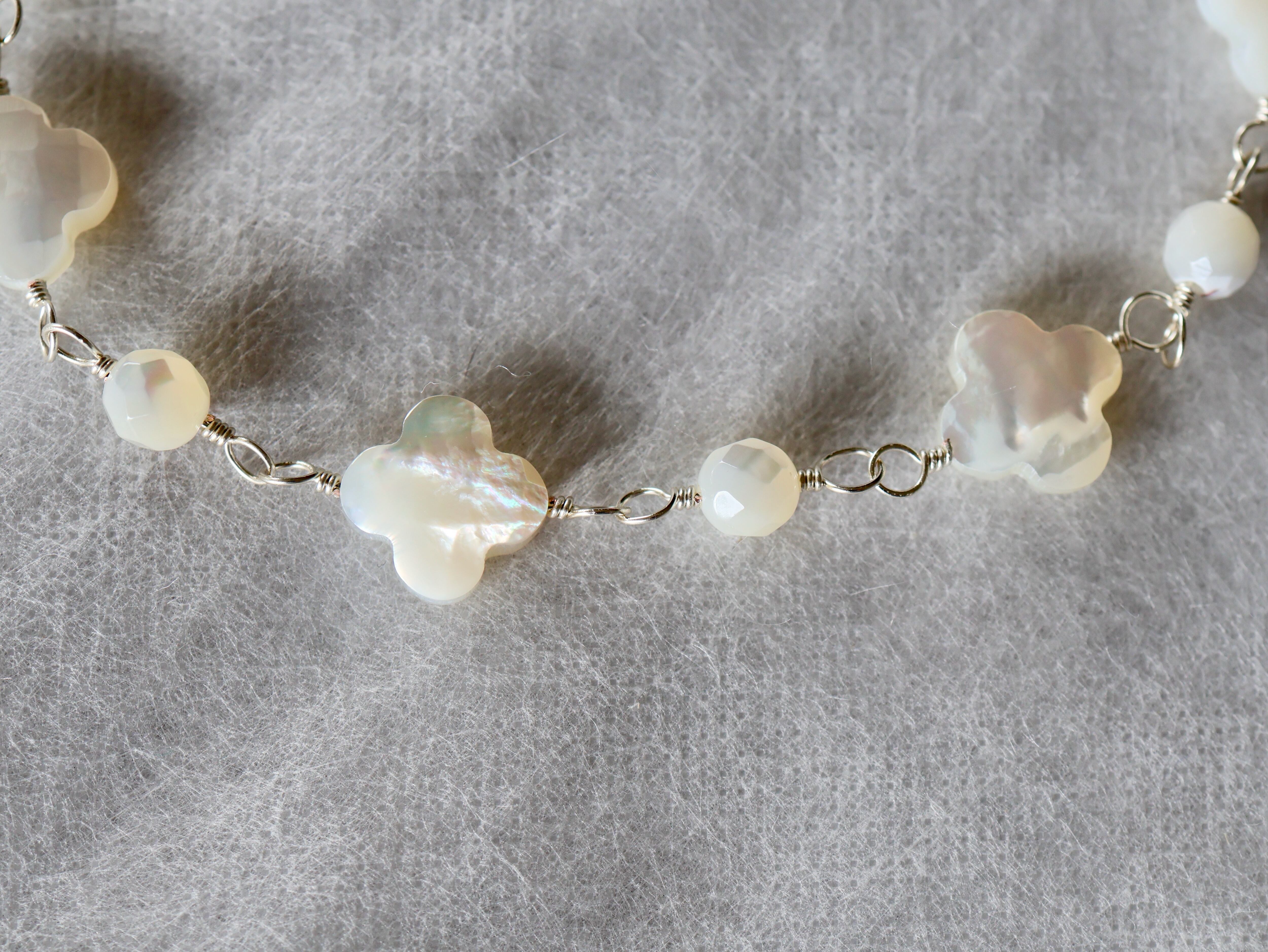 4枚花形と丸形のシェル(白蝶貝)をワイヤーで交互につないで作ったネックレスです。使用した白蝶貝は、表面にカッティング加工が施されたもので、角度によって光沢や色などが楽しめる高品質のものです。全長約90センチですが、5センチのアジャスターで90センチから95センチの間で長さを調節していただくことができます。