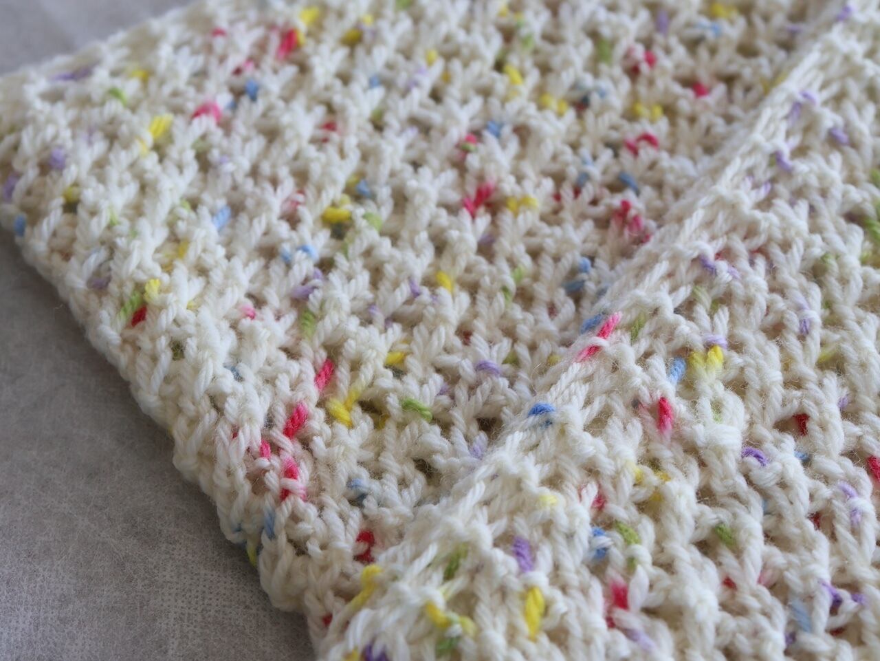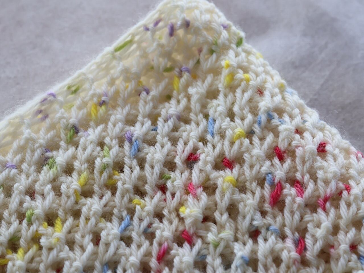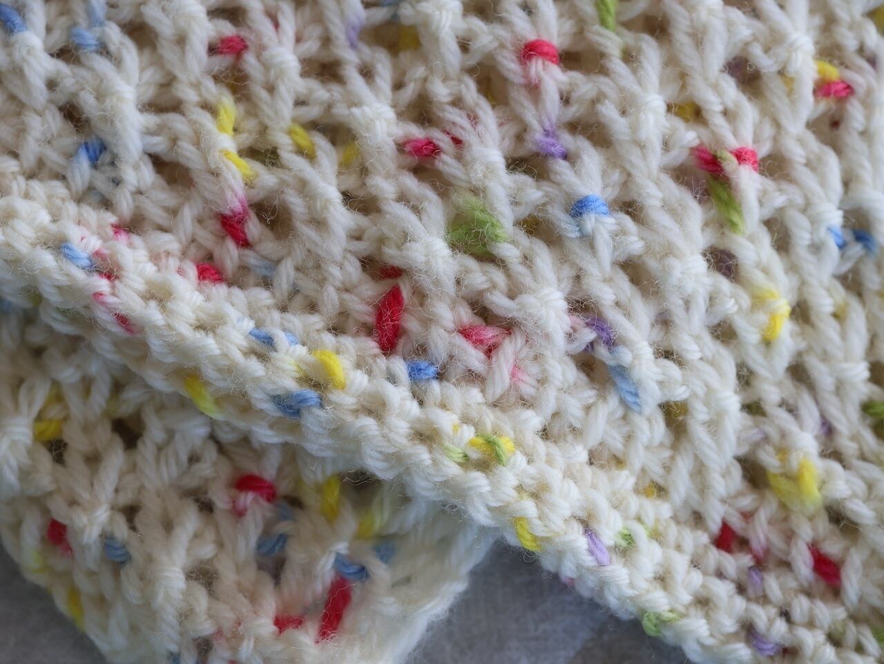 クリーム色の中にやさしい色合の赤・青・黄・緑・紫などが表れている段染め毛糸で編んだマフラーです。
