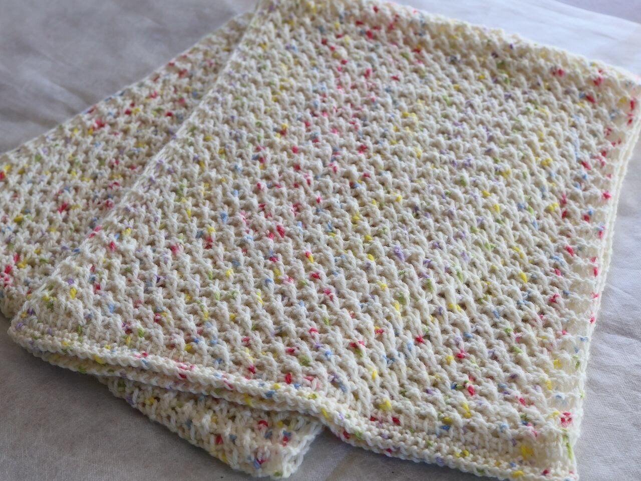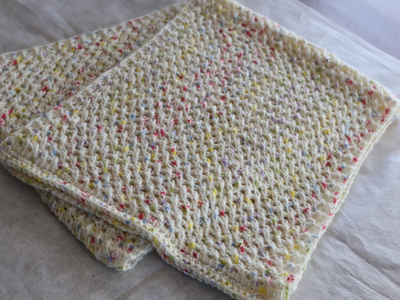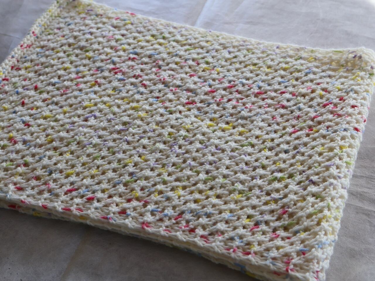 クリーム色の中にやさしい色合の赤・青・黄・緑・紫などが表れている段染め毛糸で編んだマフラーです。